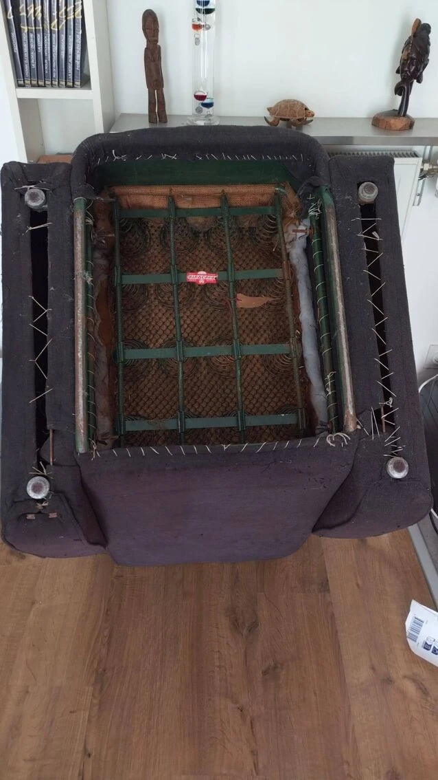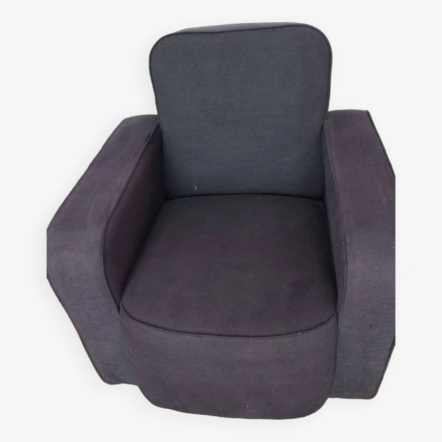 Club armchair in original garnet green fabric and label from the MAI gallery (Meubles Architectures Installations, 12 rue Bonaparte in Paris) 1950s. As it is, super comfortable. A second available to form a pair.