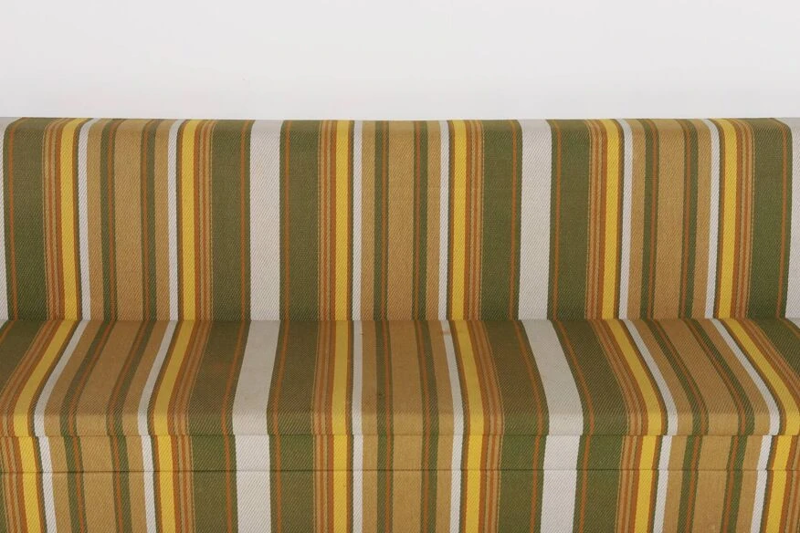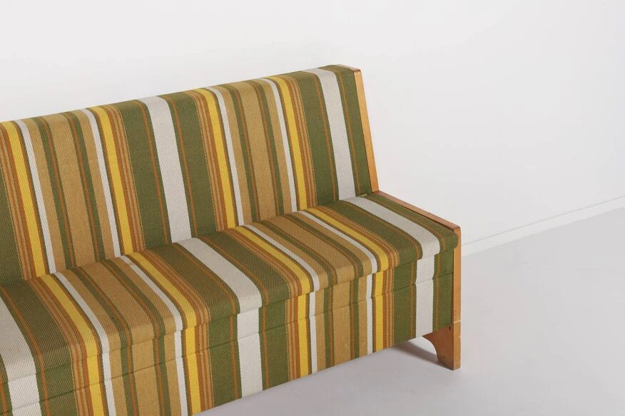 It has mdf frame veneered in maple, upholstered in striped wool fabric.