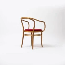 Original red cotton /wool furniture fabric, oak wood legs, brass springs in the seat.