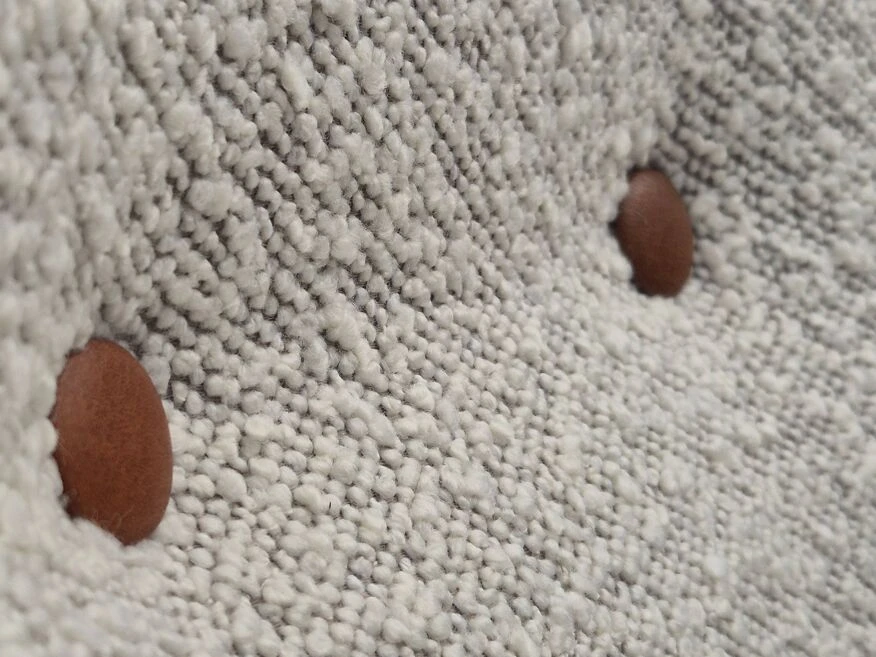 Upholstered in quality light grey/white furniture fabric, leather buttons.