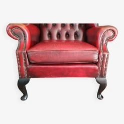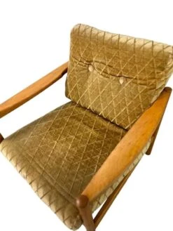 Original red furniture velour, ash wood legs, springs in the seat cushion.