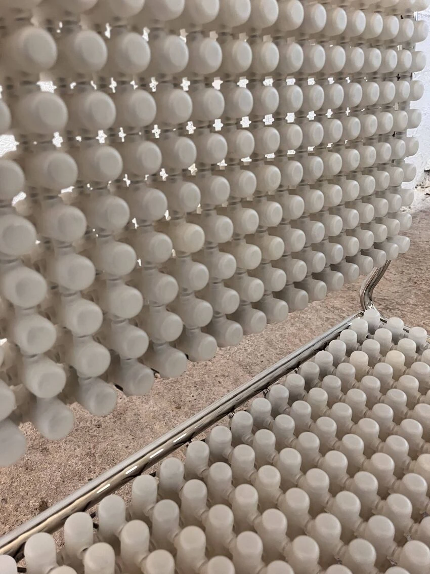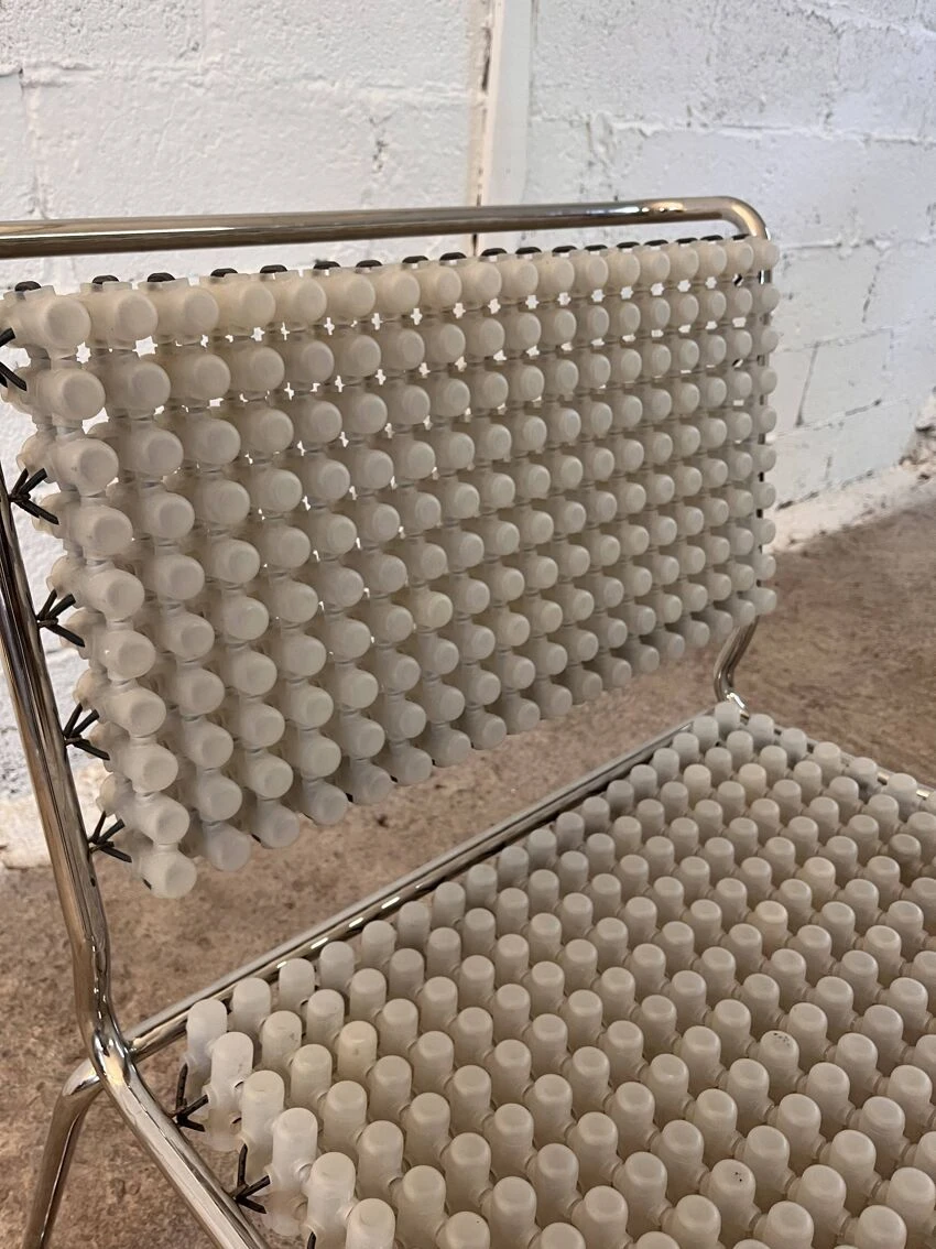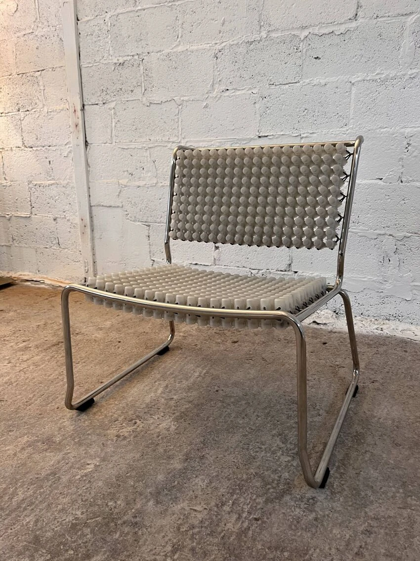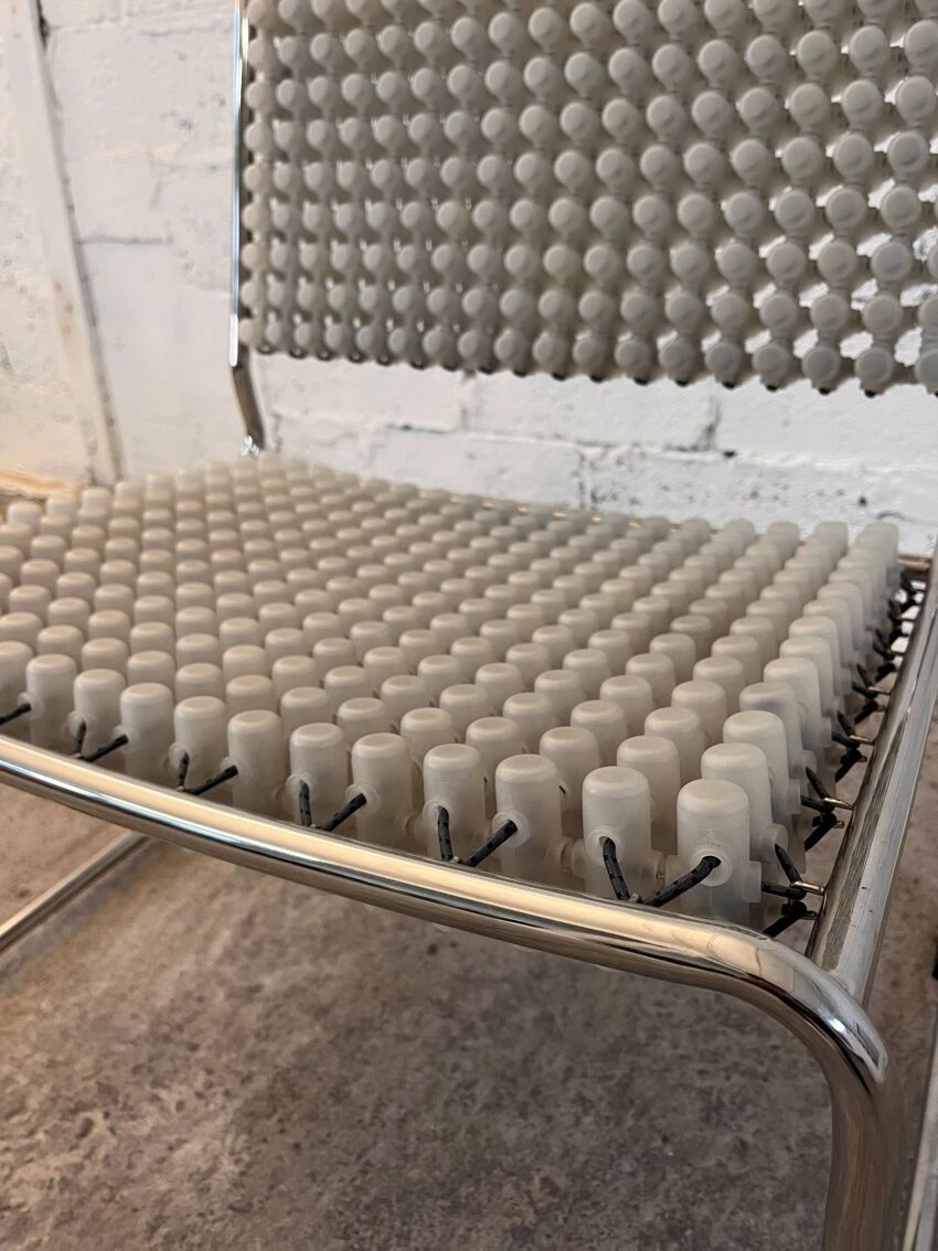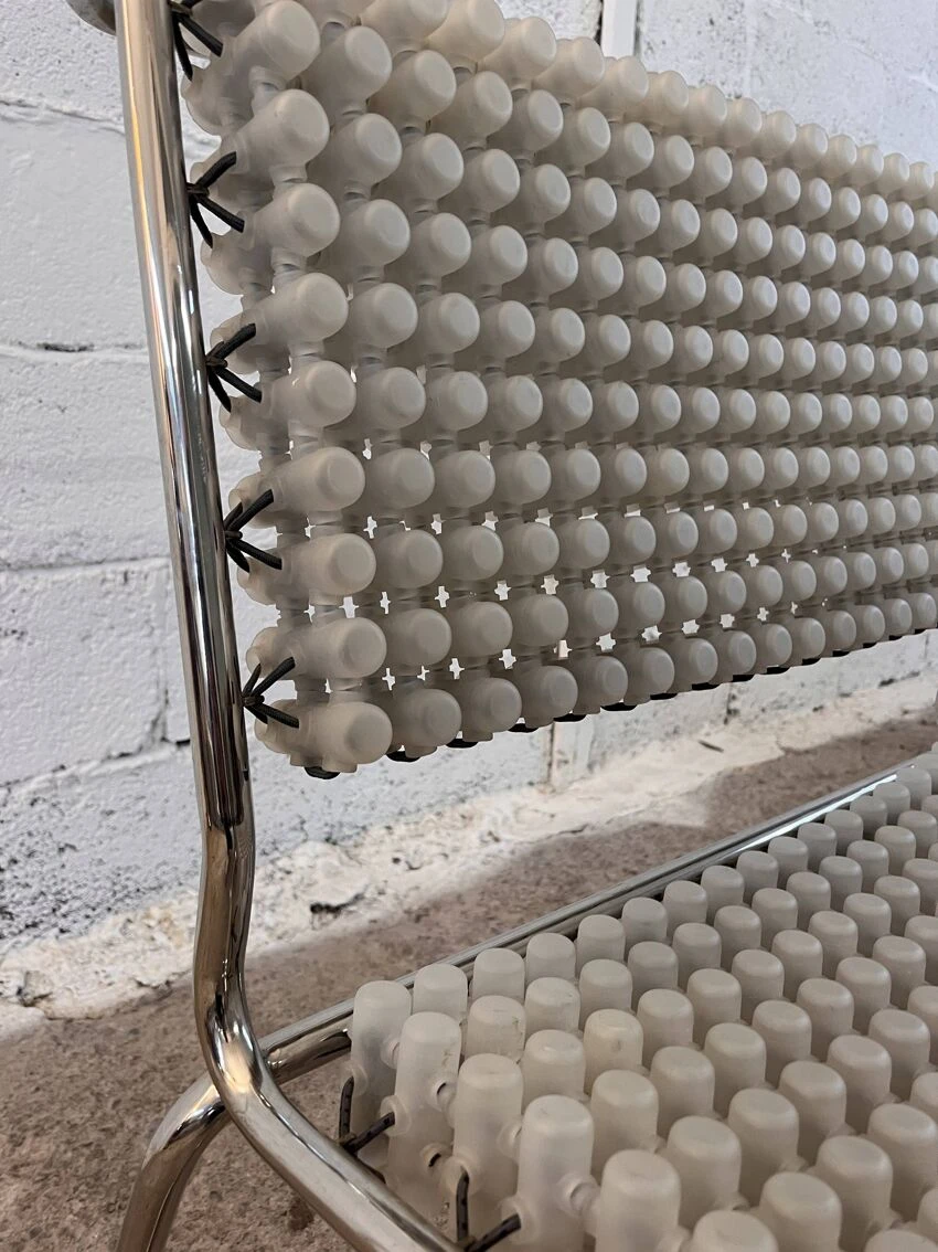 Rare accuponto heater in stainless steel and braided polypropylene capsules from yos s. And Leonardo Theosabrata, 2000s. This chair is inspired by an ancestral method of acupuncture with its patented ergonic technology. Comfortable and adapted to the posture of the body, this designer armchair can fit into any decor, modern, contemporary or vintage.