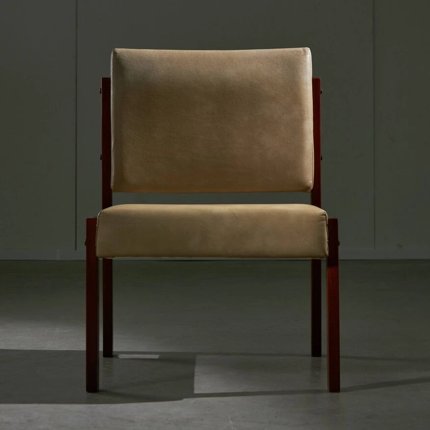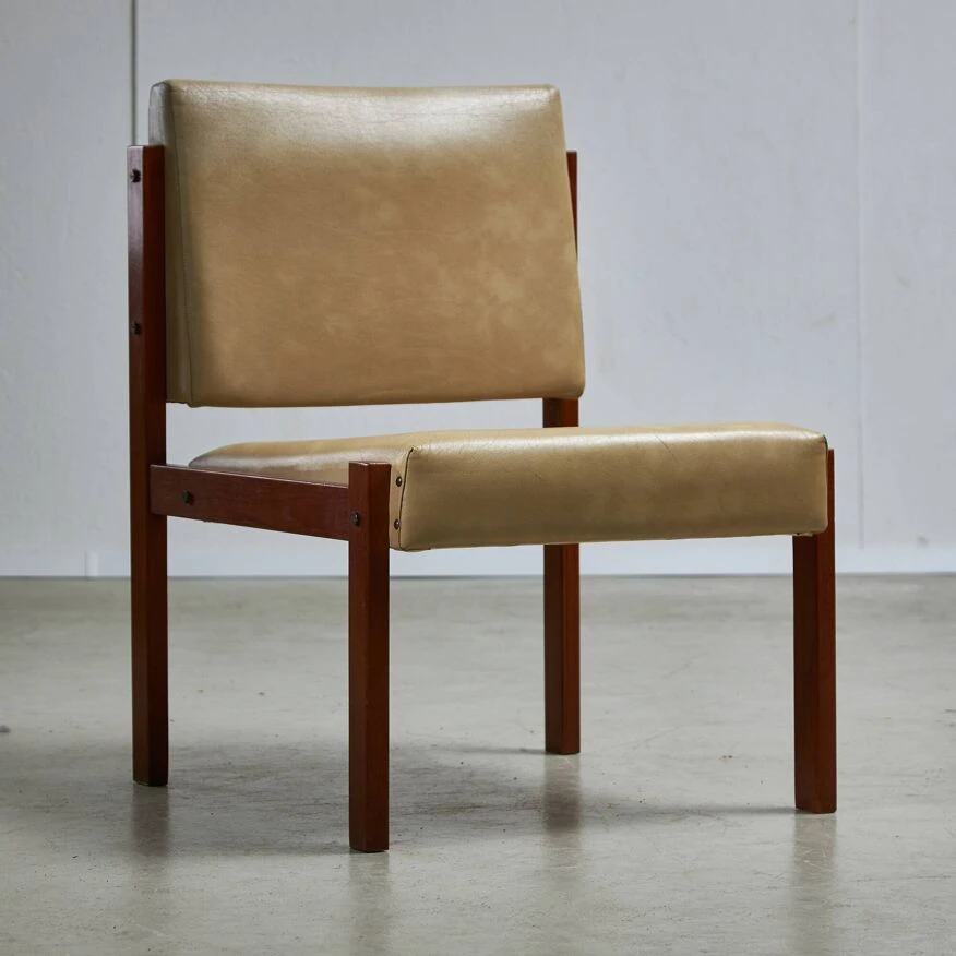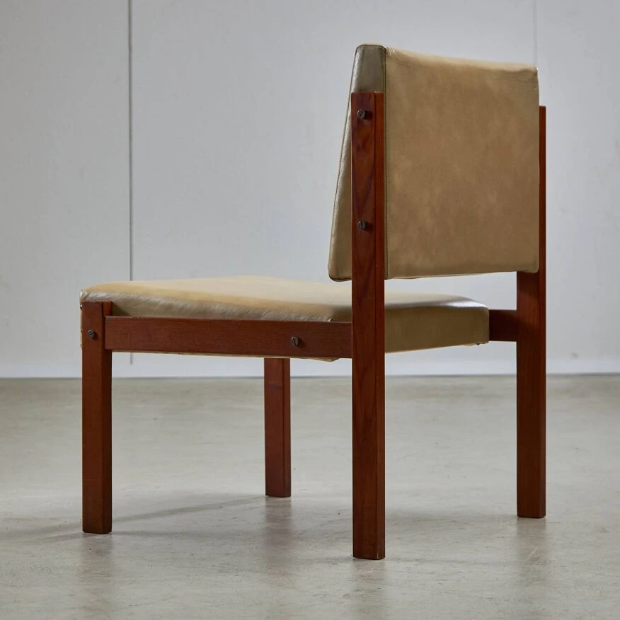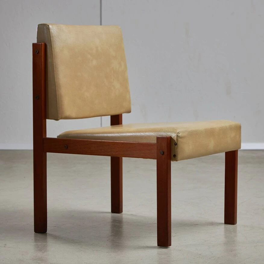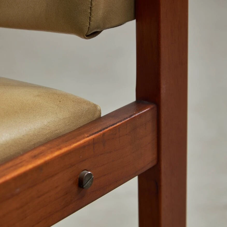Low, angular, teak wood chairs from the 1970s, with copper screws and yellowish-beige leather upholstery.