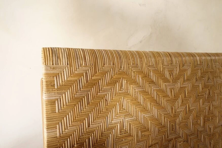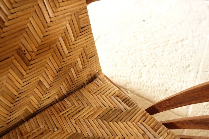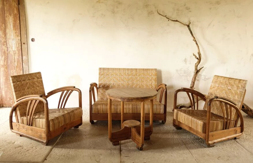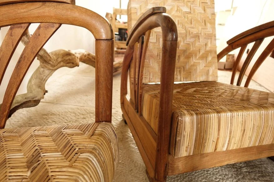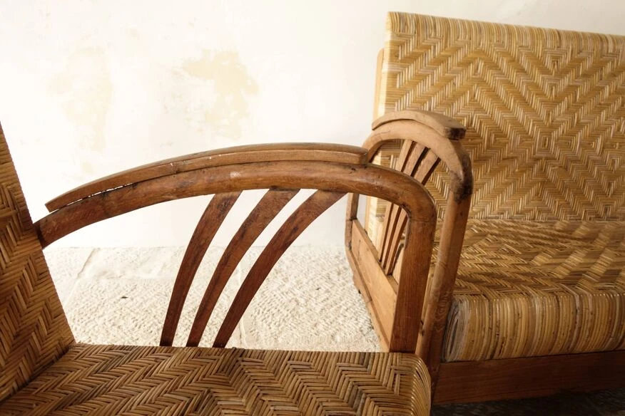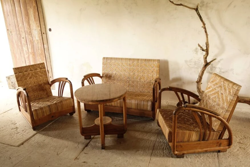 It is made up of two lounge armchairs in rattan and teak wood as well as the matching bench and the coffee table.