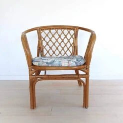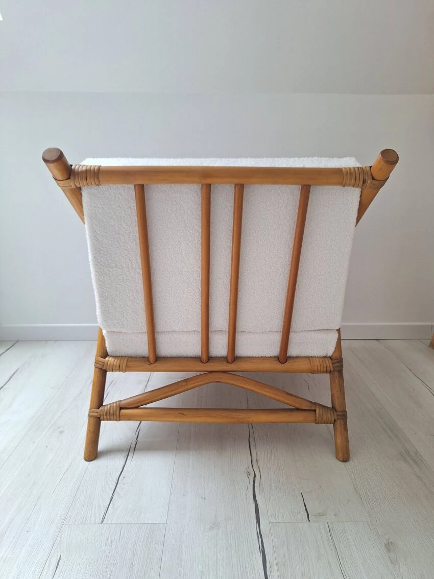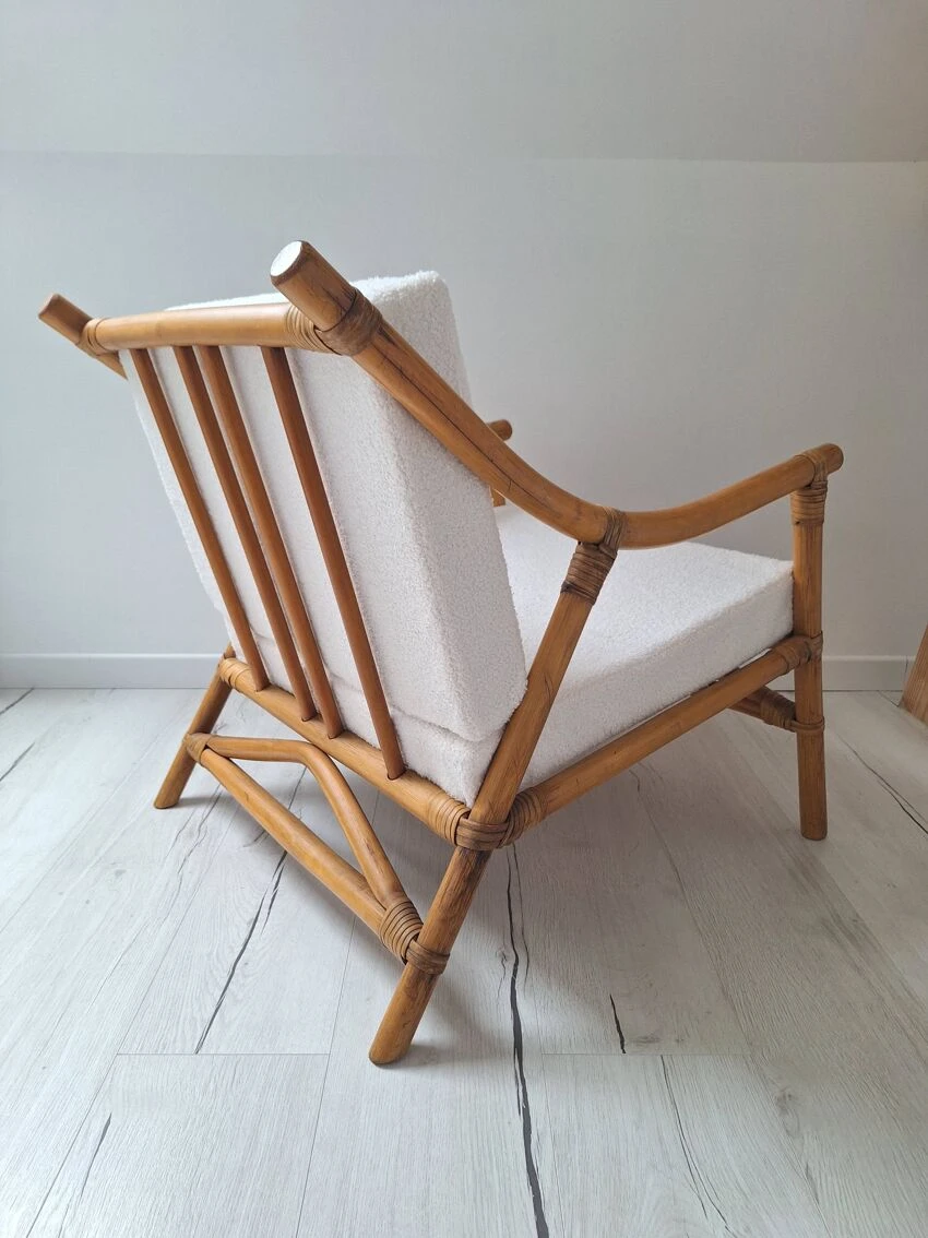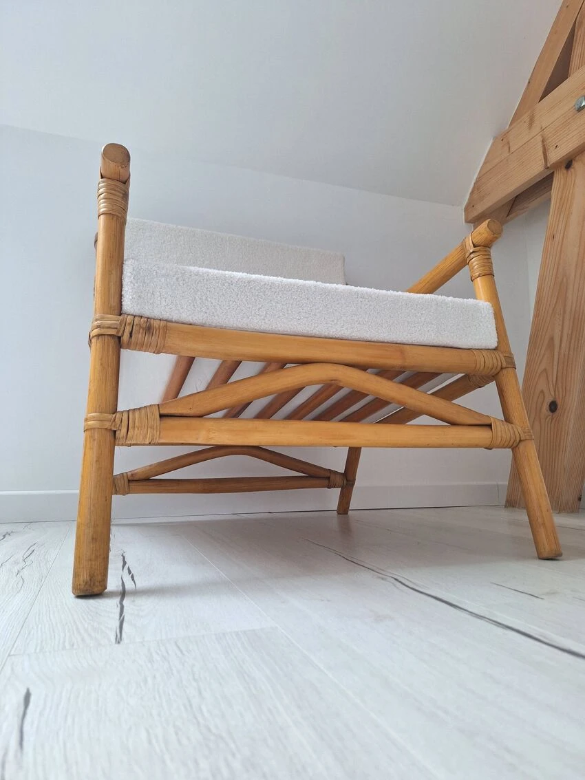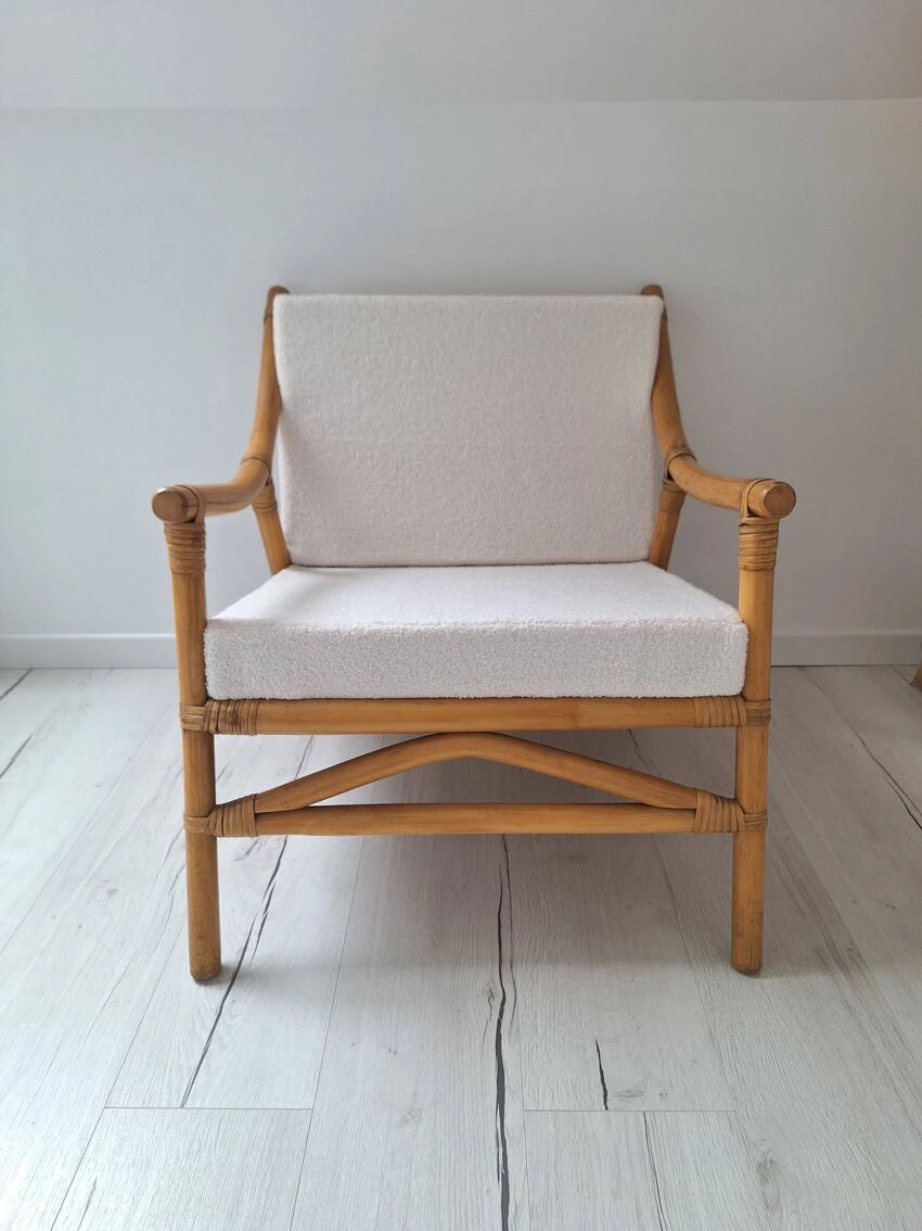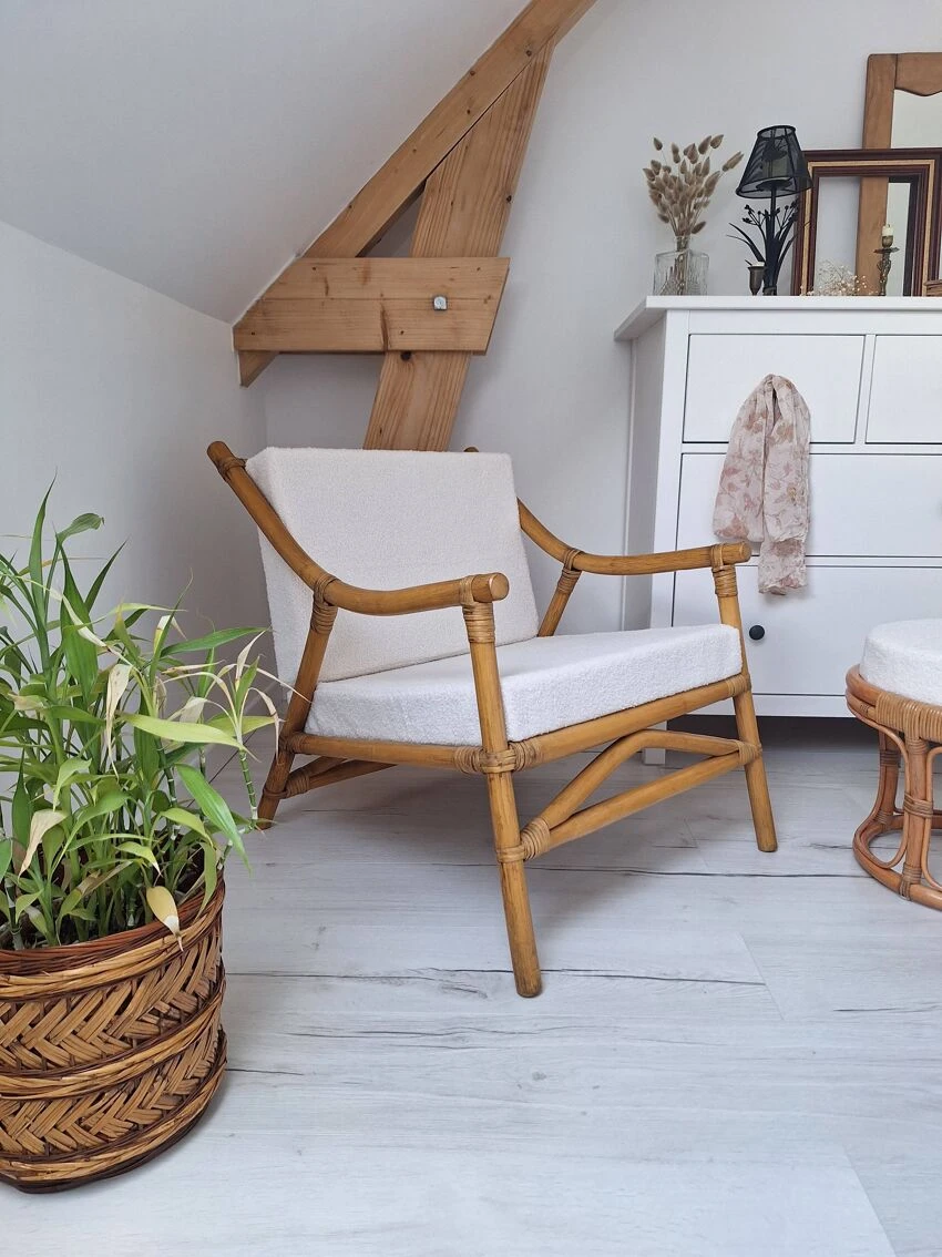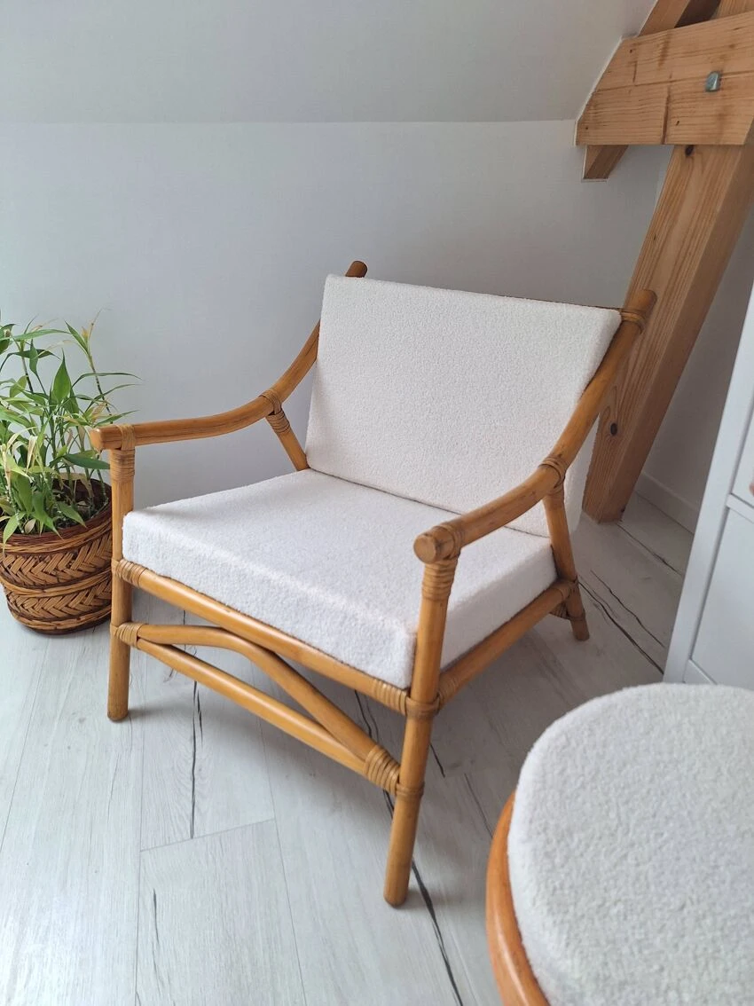 Vintage armchair, bamboo frame and new cushions. Handmade and custom-made cushions in terry fabric upholstery, foam upholstery trim also. The wooden frame has been nourished. Trendy item and in excellent condition. Dimensions: Height of the seat with the cushion: 38 cm. Total width: 61 cm. Total depth: 70 cm. Total height: 68 cm. Cushion thickness: 8 cm.