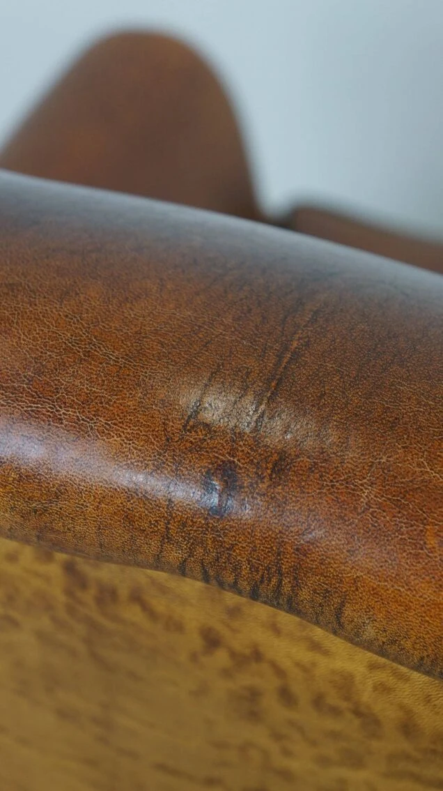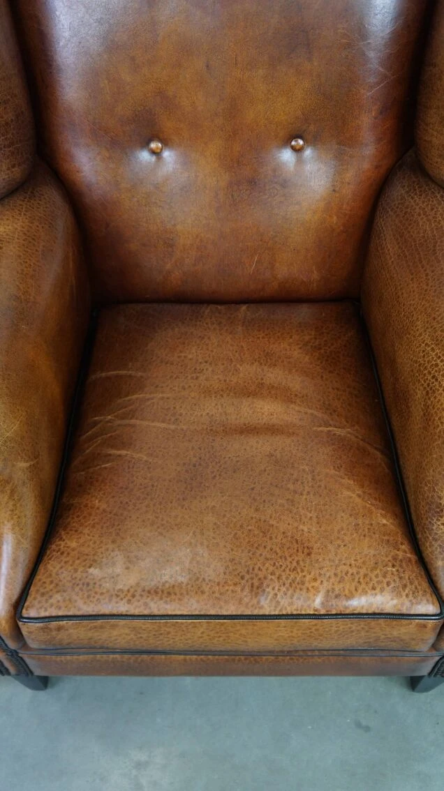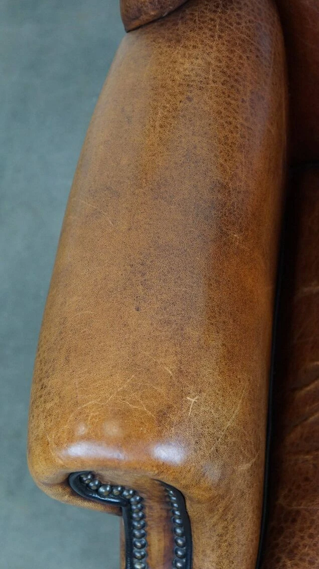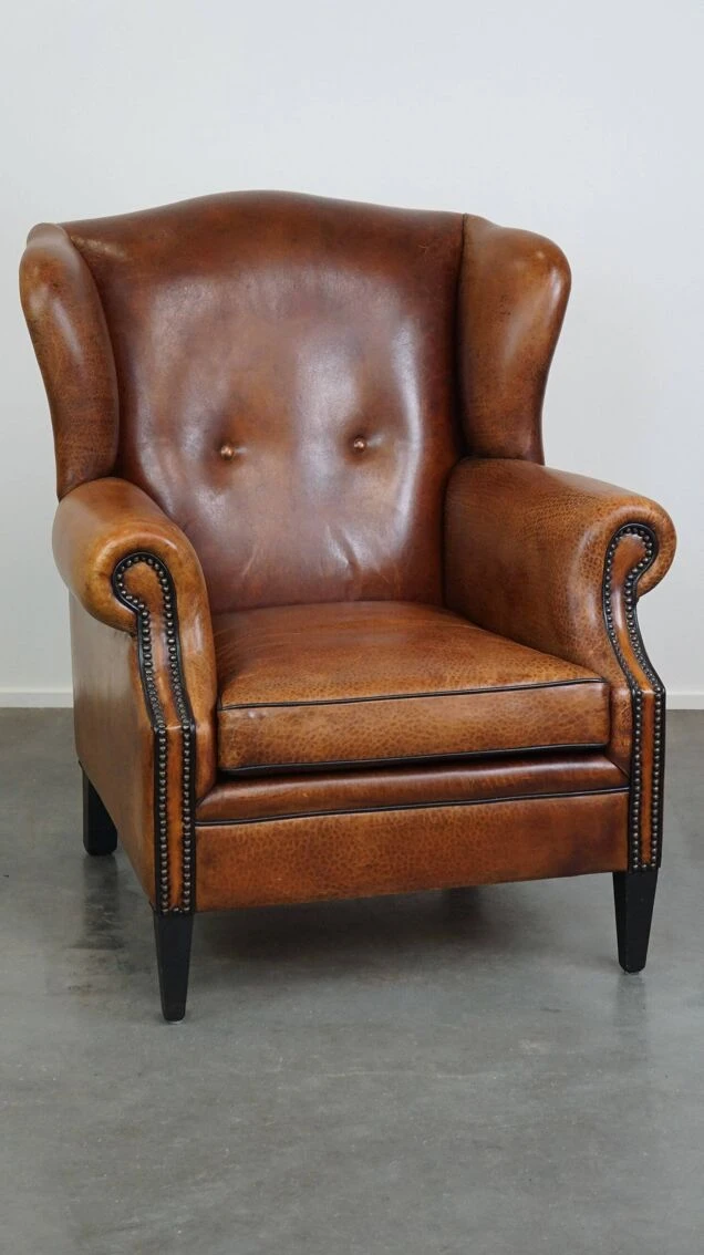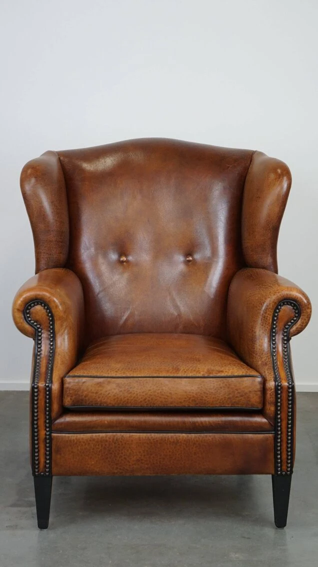 Offered: this beautiful and in good condition wingback armchair made of high-quality sheepskin leather, finished with nails and black piping.