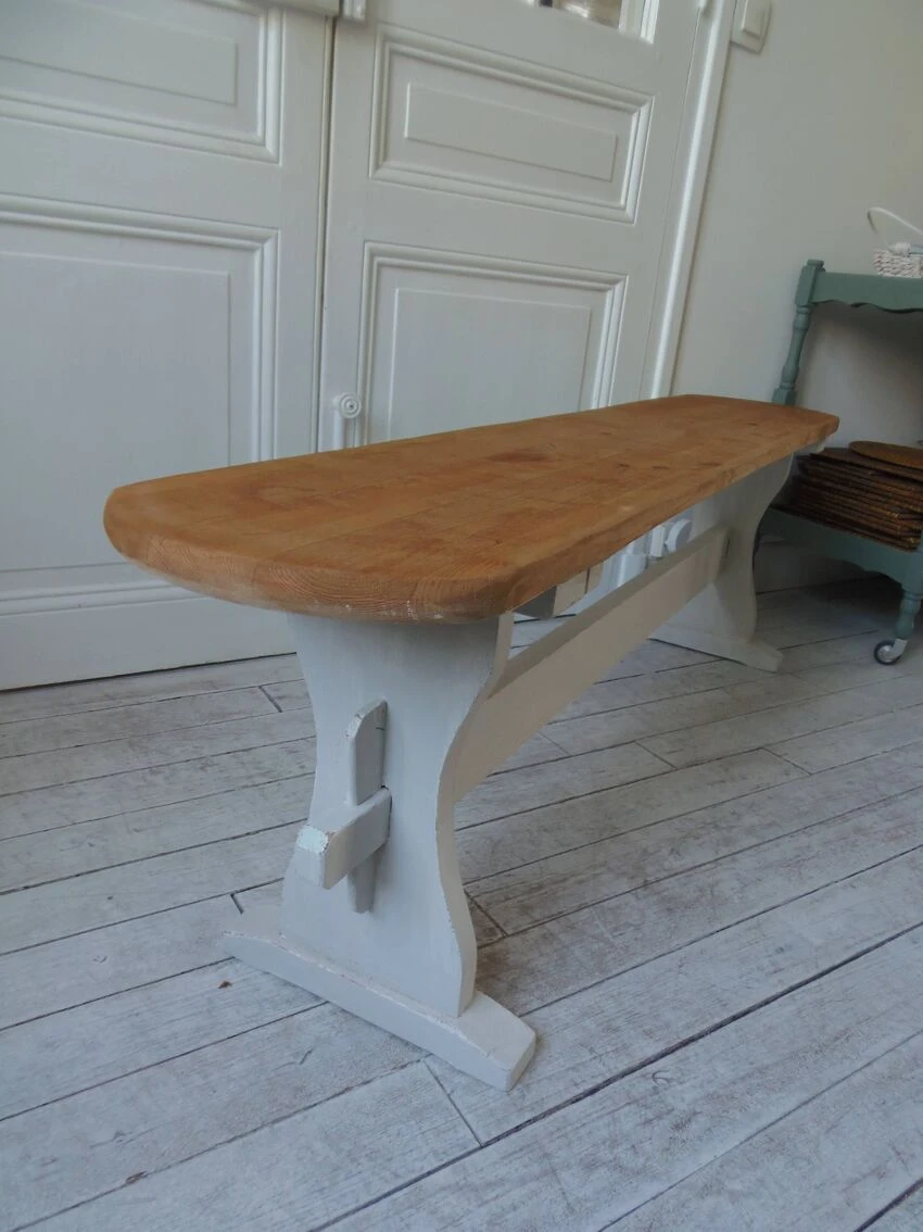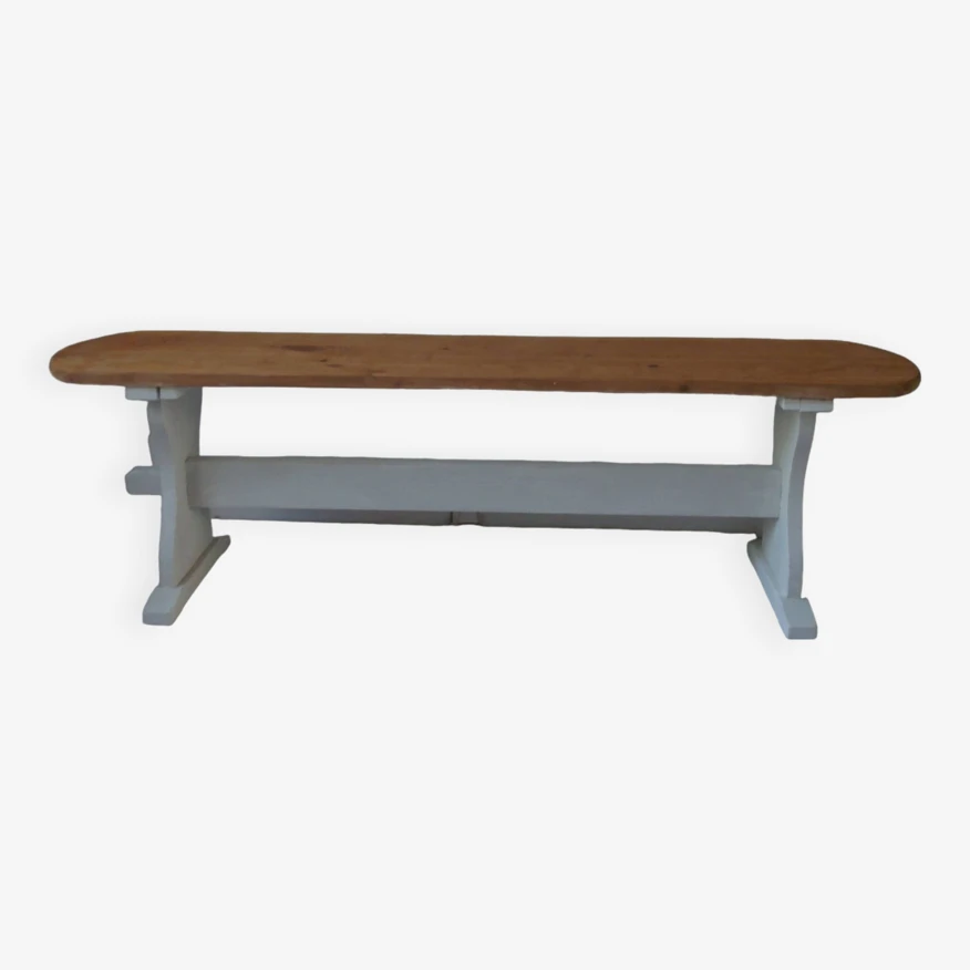 Vintage bench with patinated pearl gray base, waxed finish, wooden seat protected by varnish.