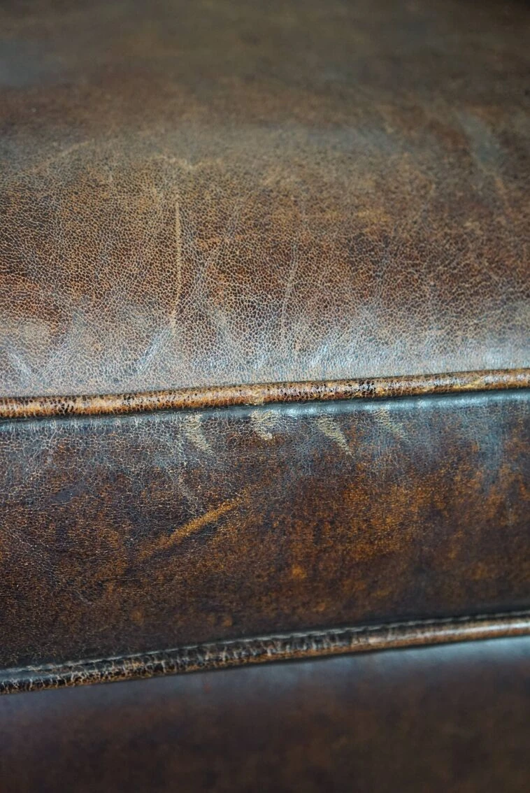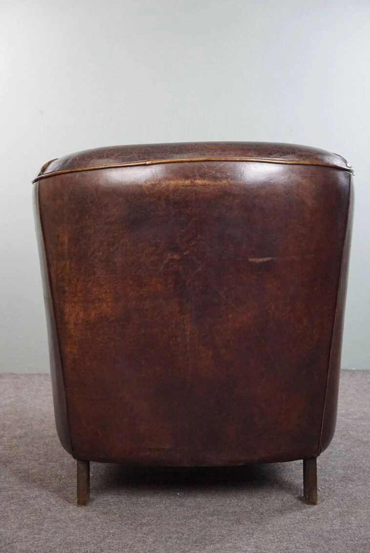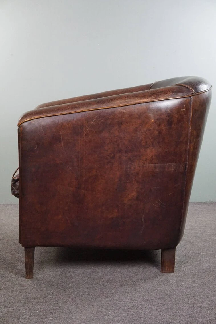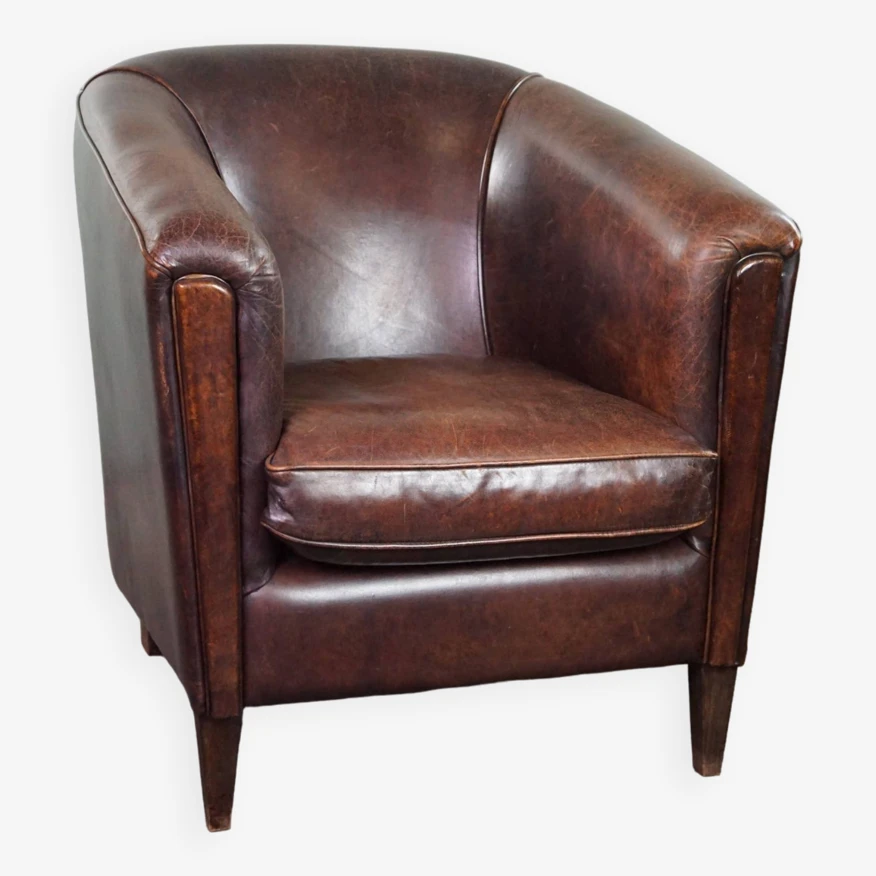 Offered is this dark charming sheep leather club armchair with a sleek design.