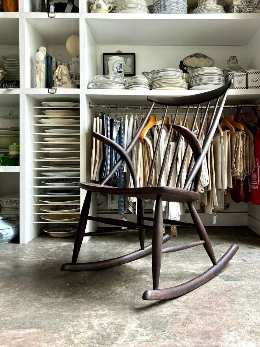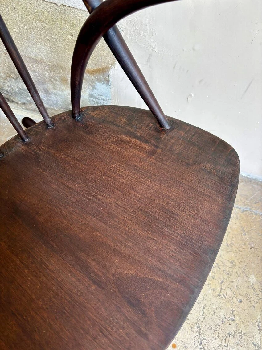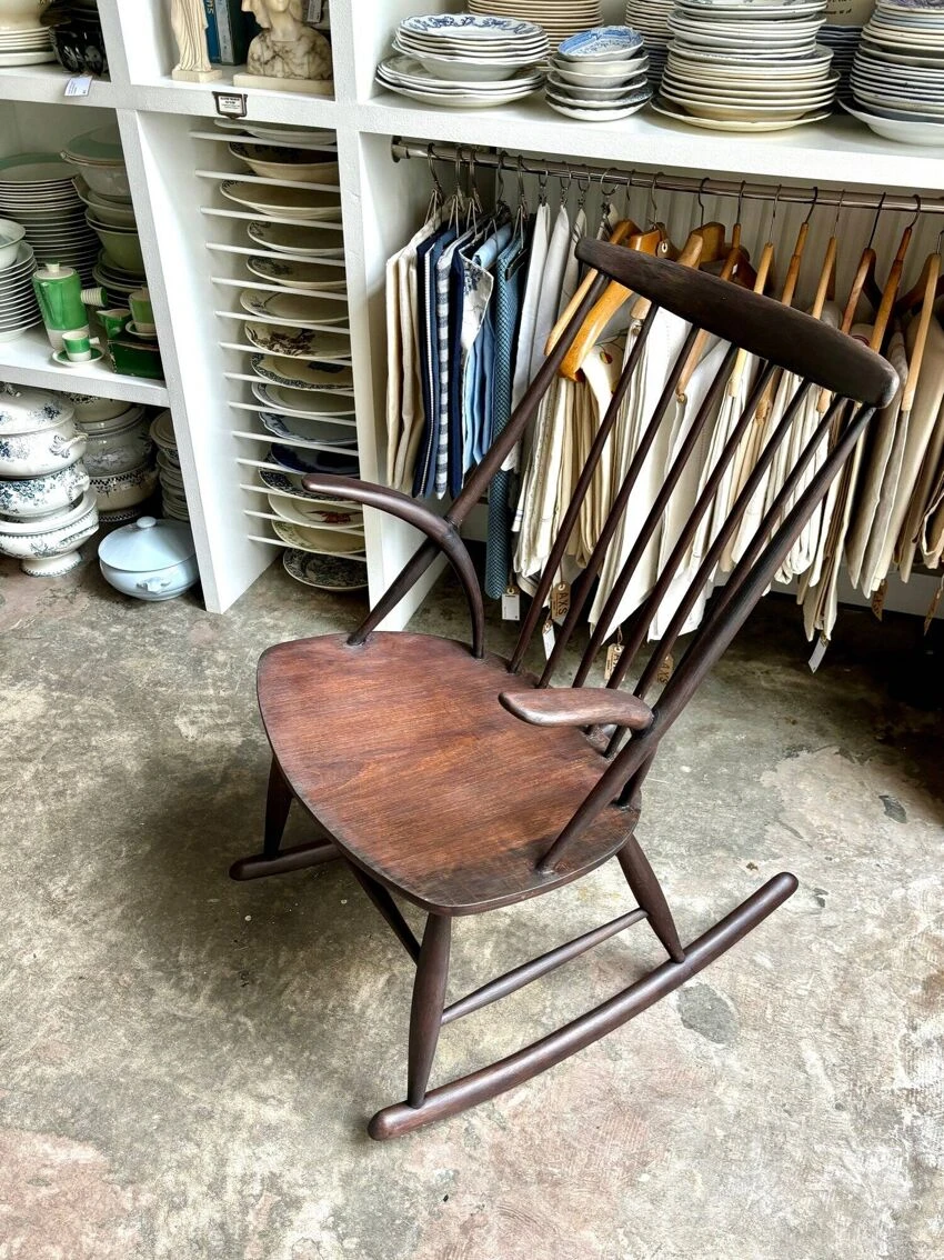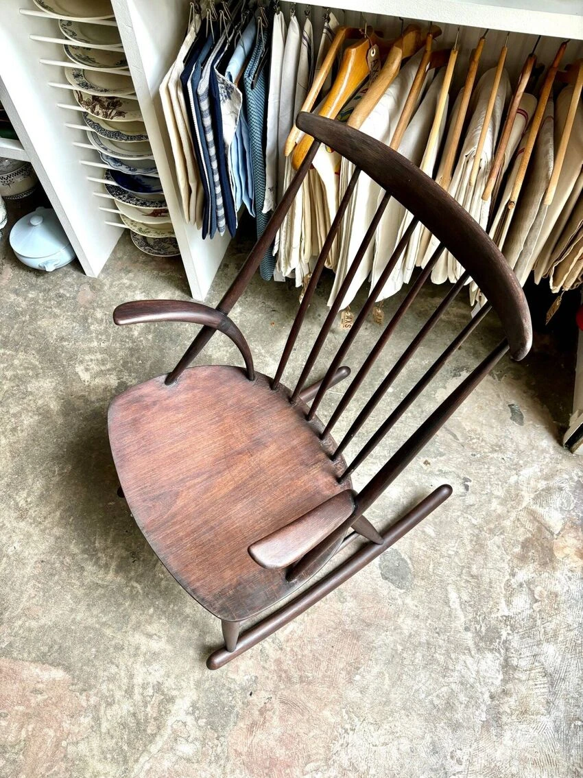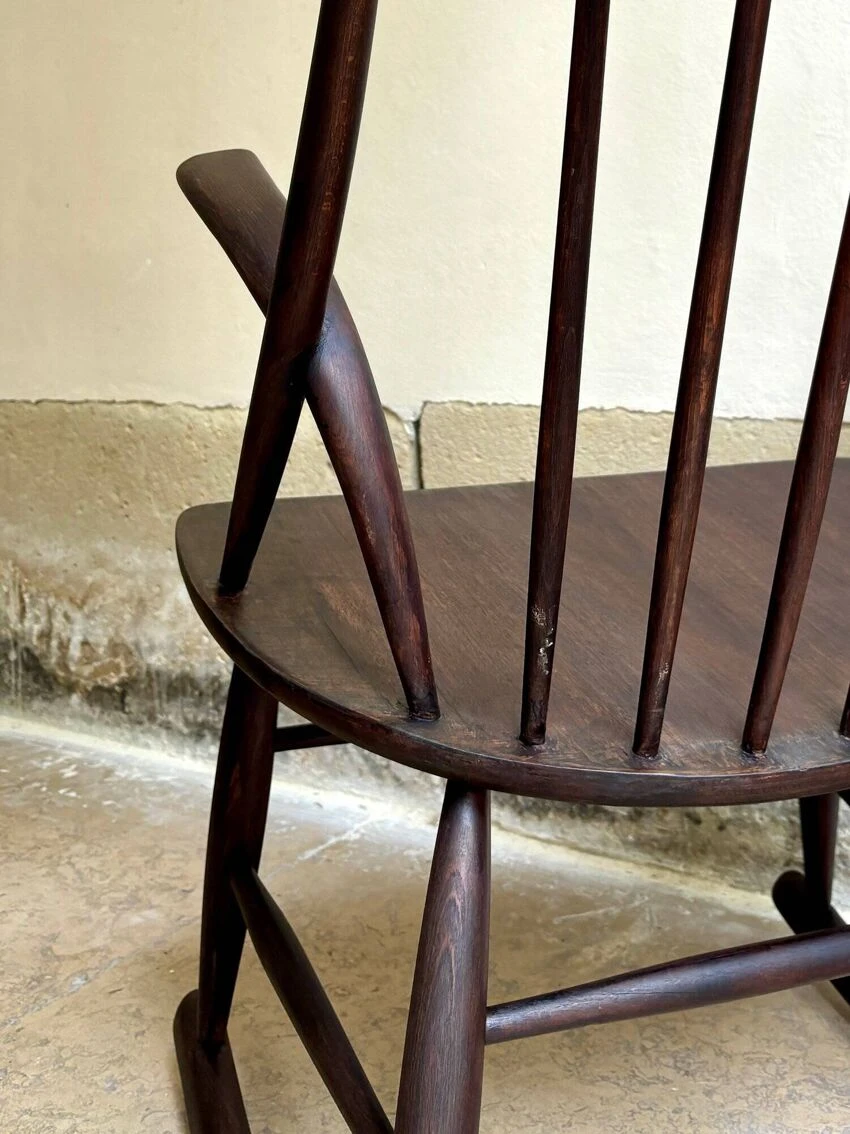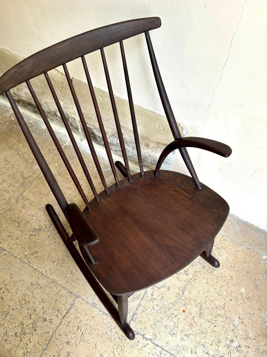 Dark beech rocking chair designed by Illum Wikkelso for Niels Eilersen in Denmark in the 1960s. It is composed of a high back formed by eight oblong bars assembled in a curved horizontal band offering great comfort, two organically shaped armrests , with an ovoid seat, four oblong legs connected by four spacers and ending in an arcuate base allowing back and forth movement. Solid and stable, this rocking chair is in good condition since we have completely sanded, stained and varnished it to restore its former glory. An icon of Scandinavian design with its clean and timeless lines, it will find its place in all interiors, whether in the living room, the bedroom or even your veranda. Seat height, H43 cm