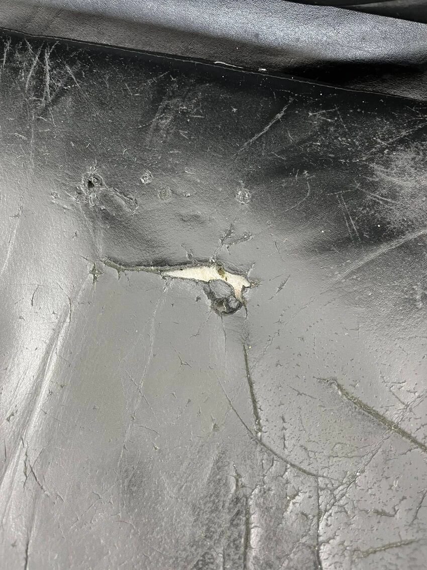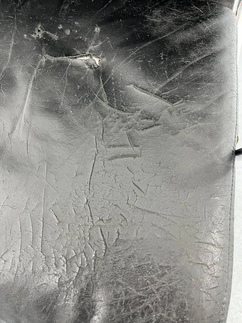 Good condition with visible patina, torn leather upholstery on the seat.