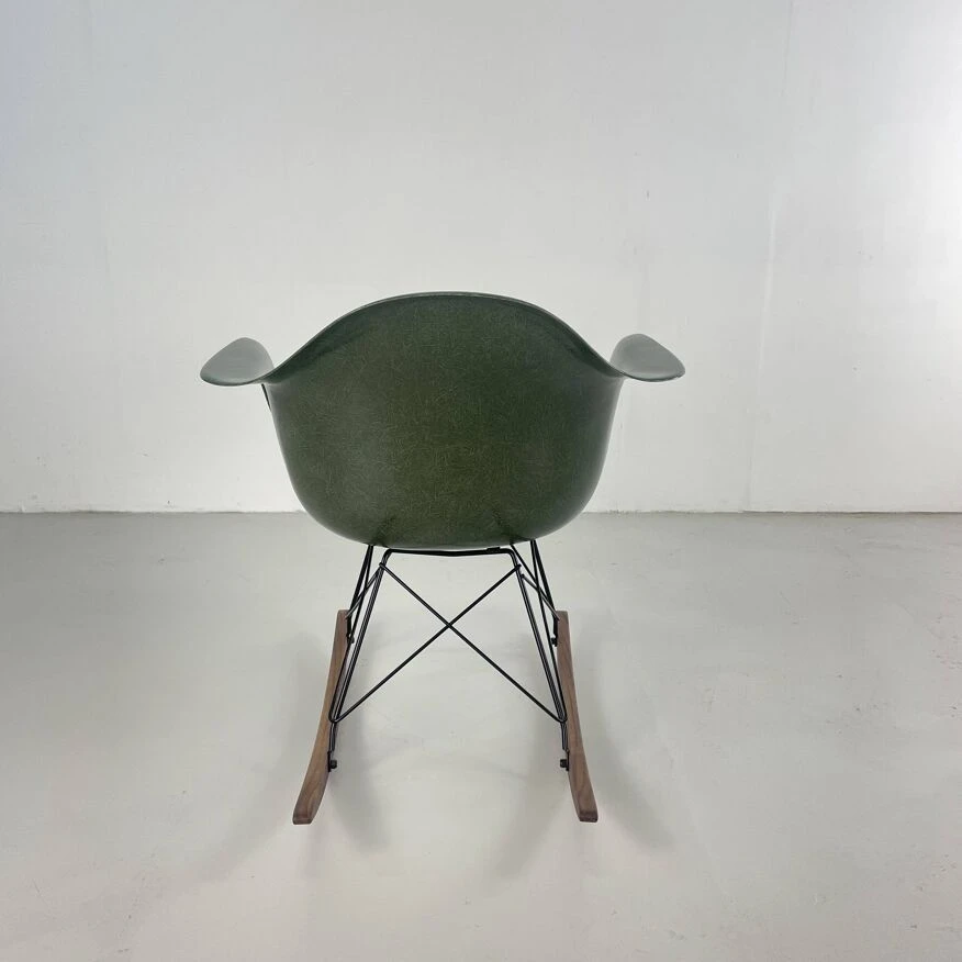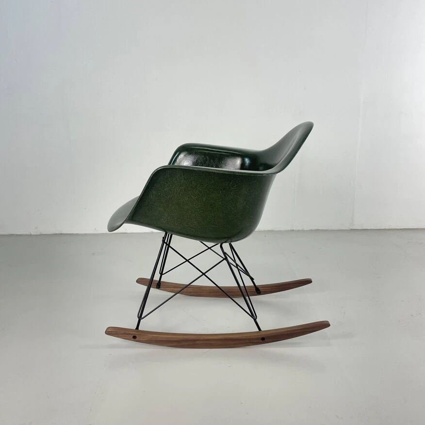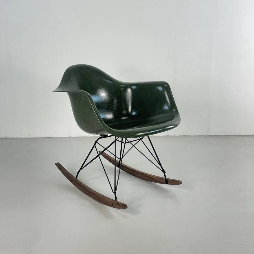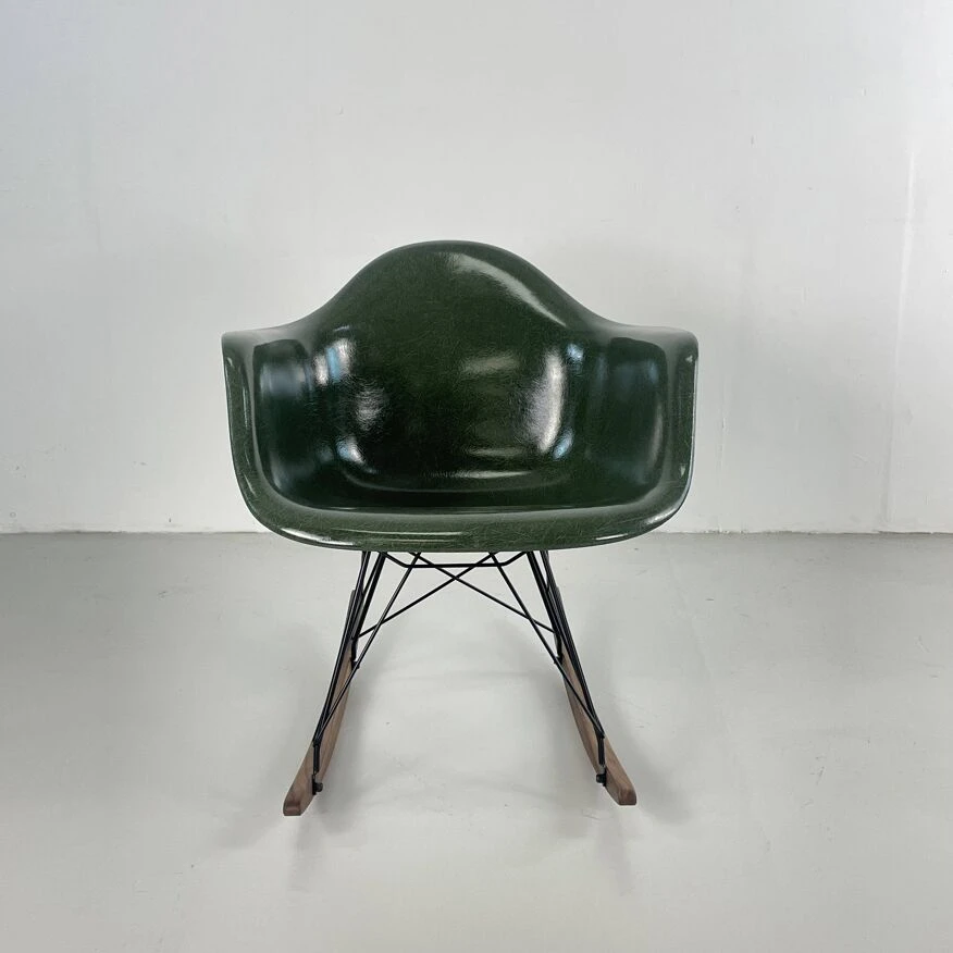 Original Charles and Ray Eames rocking chair in dark olive green. Vintage fibreglass shell on replacement black powder coated base with solid walnut wood runners (we also have zinc bases and oak/birch runners if you would prefer). Or dowel/Eiffel, H base/cats craddle/stacking in variuos finishes.