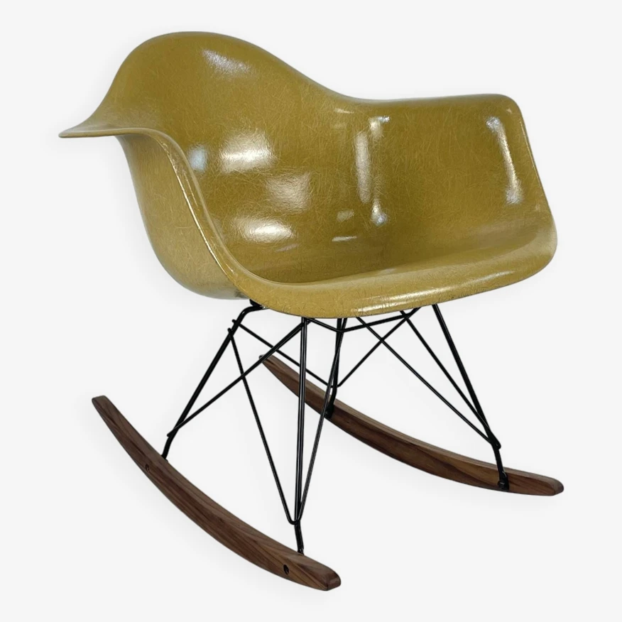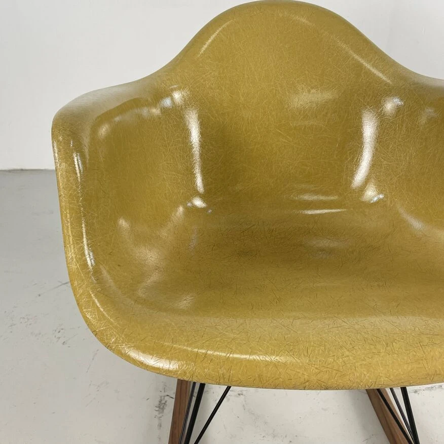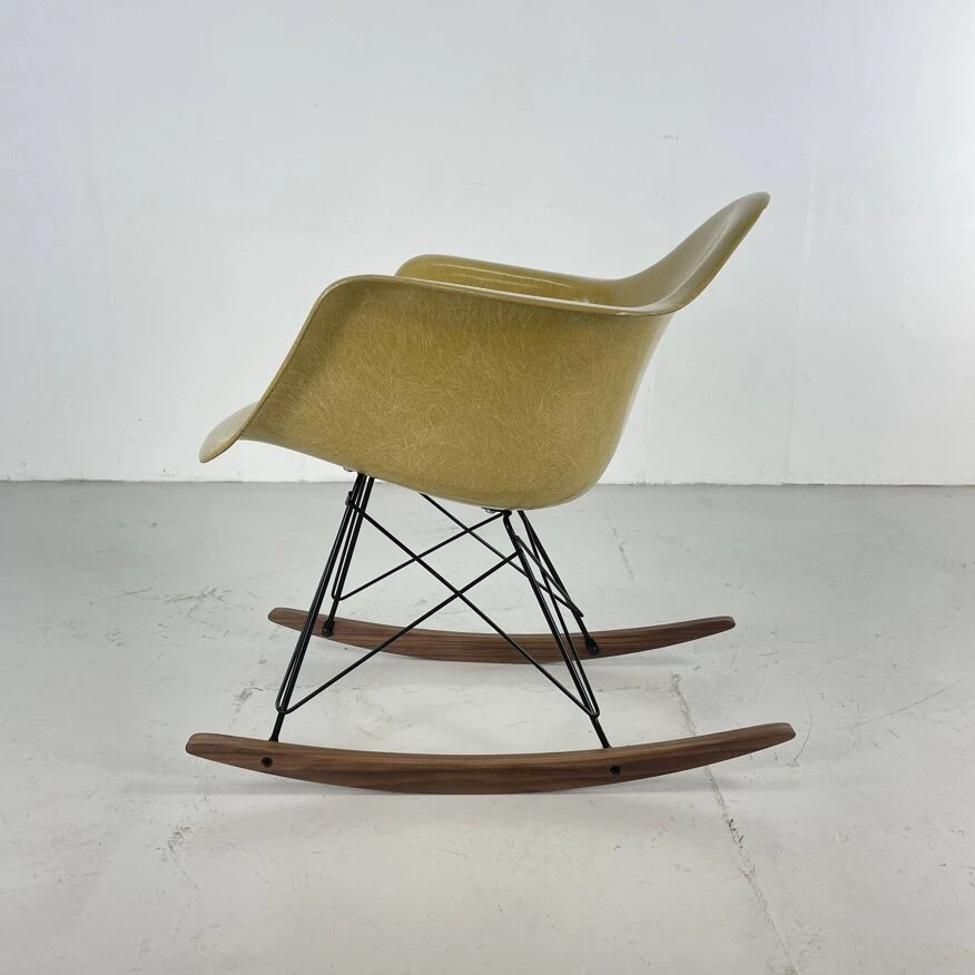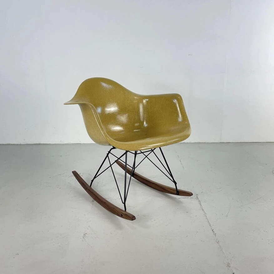 Original Charles and Ray Eames rocking chair in light ochre. Vintage fibreglass shell on replacement black powder coated base with solid walnut wood runners (we also have zinc bases and oak/birch runners if you would prefer). Or dowel/Eiffel, H base/cats craddle/stacking in various finishes.