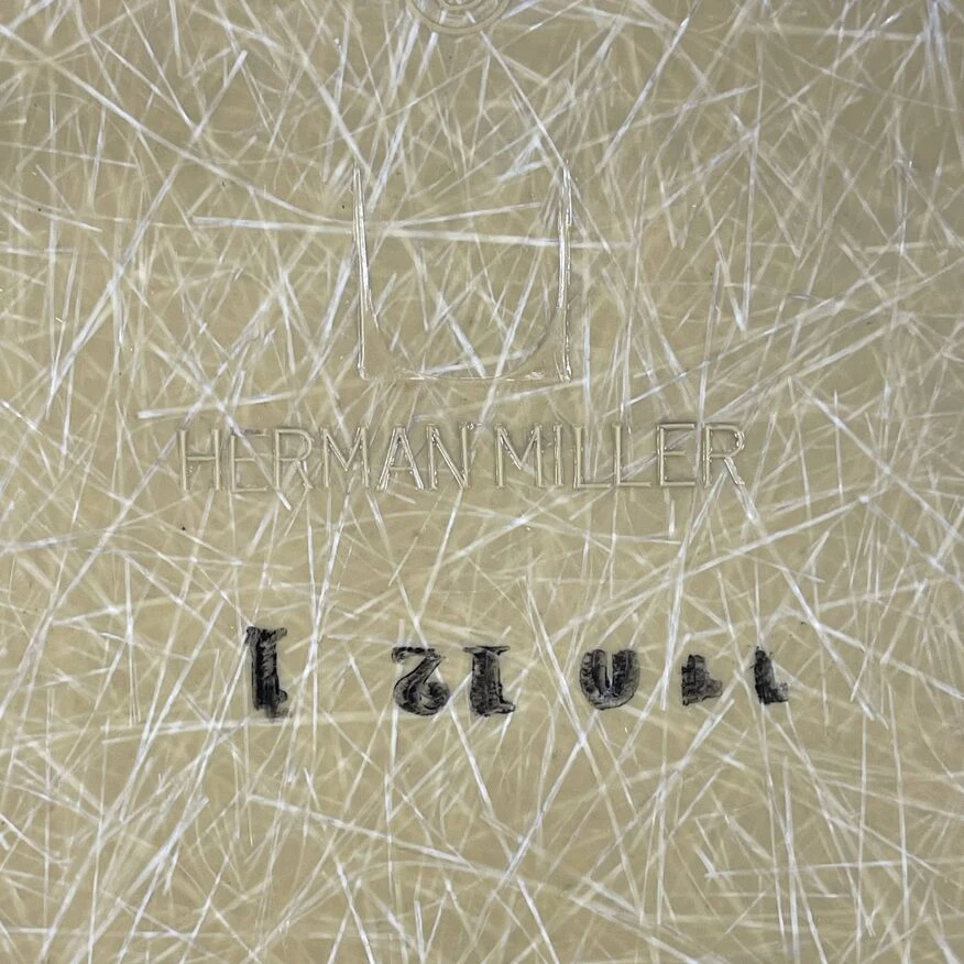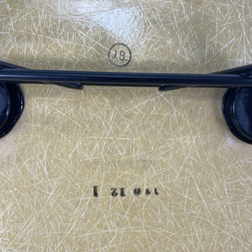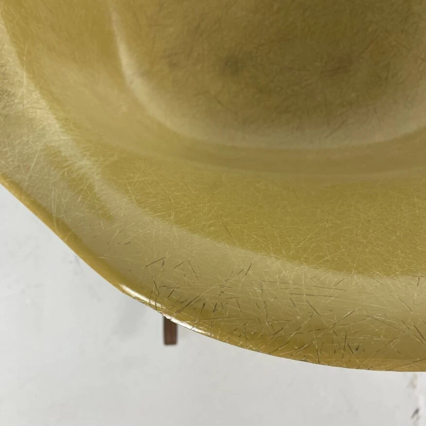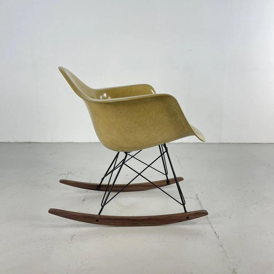 Original Charles and Ray Eames rocking chair in light ochre. Vintage fibreglass shell on replacement black powder coated base with solid walnut wood runners (we also have zinc bases and oak/birch runners if you would prefer). Or dowel/Eiffel, H base/cats craddle/stacking in various finishes.