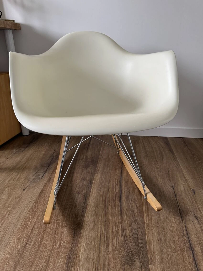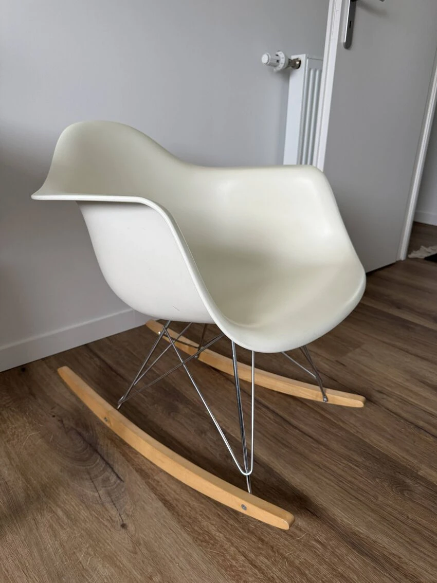 Selling the Rocking Armchair Rod Base (RAR) from 2008 due to moving abroad. Despite its compact dimensions, it offers pleasant comfort even for tall users and the plastic shell. The RAR is an armchair in its own right, whose iconic shape and rocker base on wooden glides not only add a striking accent to any living room, but are also an eye-catcher in lounge areas, relaxation areas and dining rooms. ‘waiting.