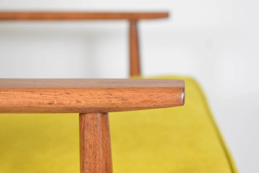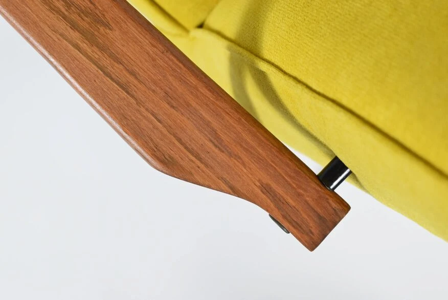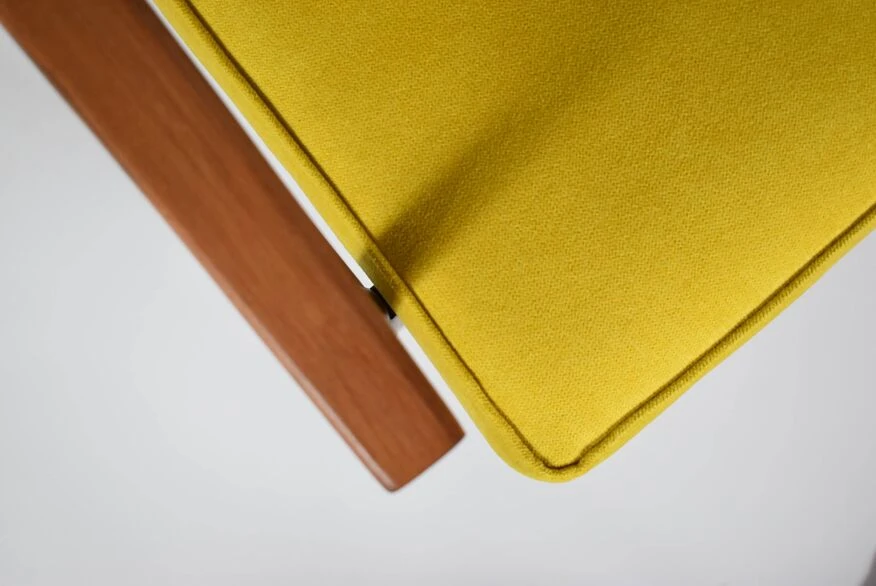 Le siège a été démonté jusqu’au bois nu et construit à partir de zéro, des rayures à la nouvelle mousse et à l’avoine jusqu’au nouveau et magnifique revêtement jaune.