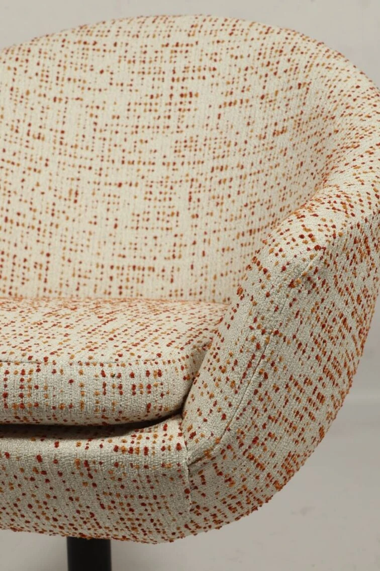 Elle est revêtue d’un nouveau tissu bouclé parsemé de nombreux pois / pixels dans des tons orange.