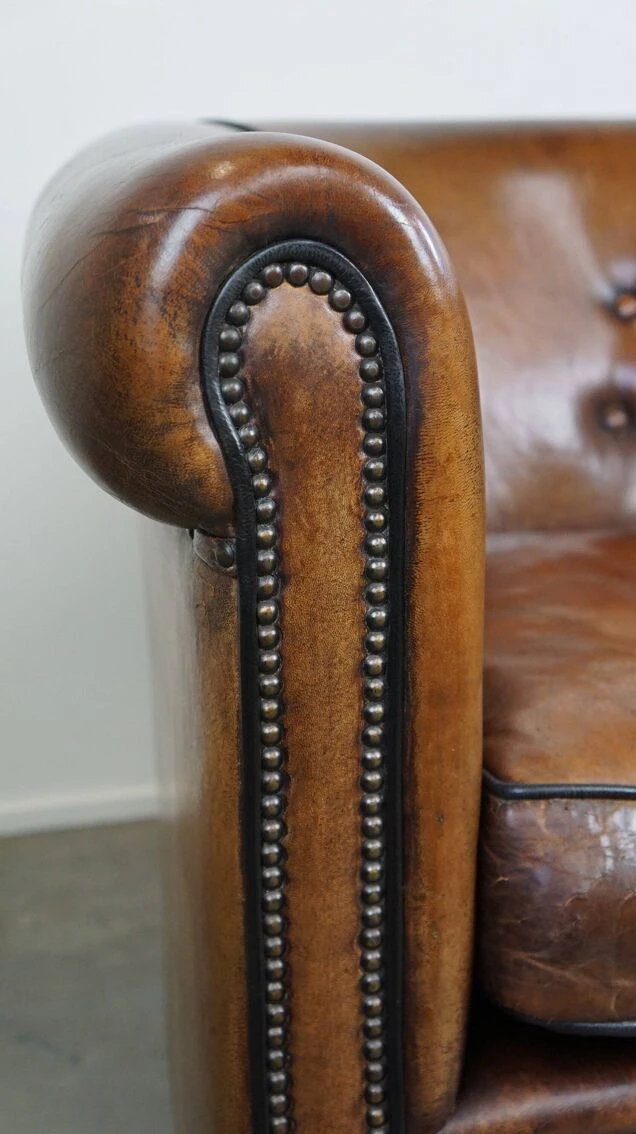 Crafted from sheepskin leather, it boasts luxurious finishes including decorative nails and a black trim.