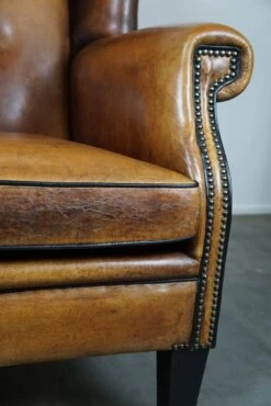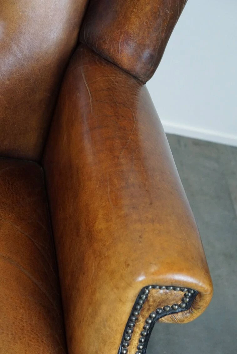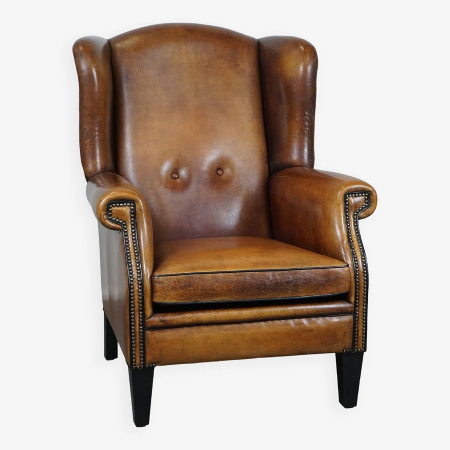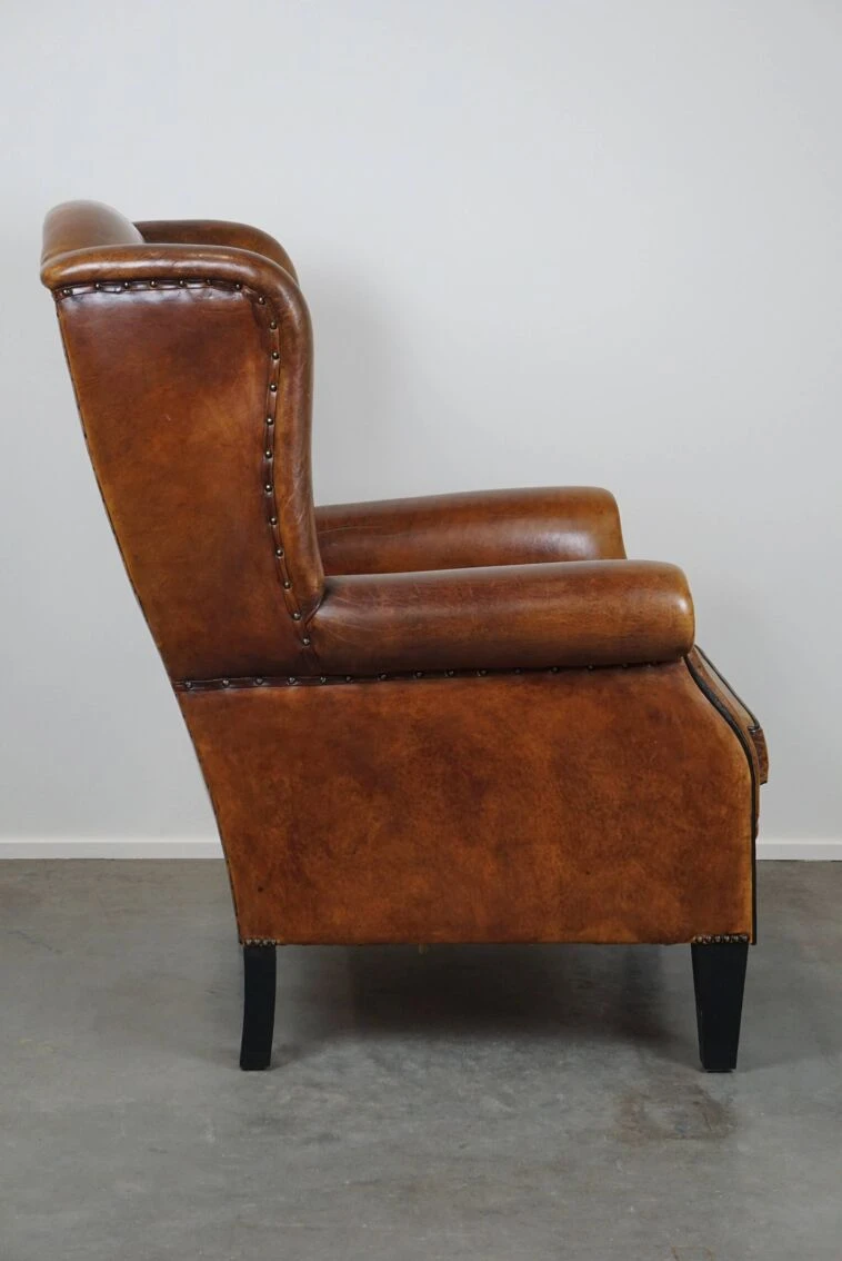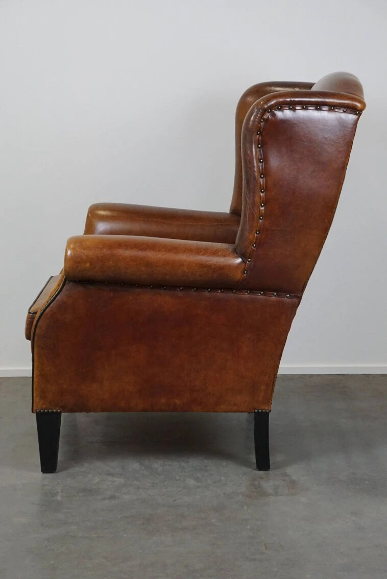 This beautiful large and very comfortable sheep leather wingback armchair has acquired a stunning patina through responsible use.