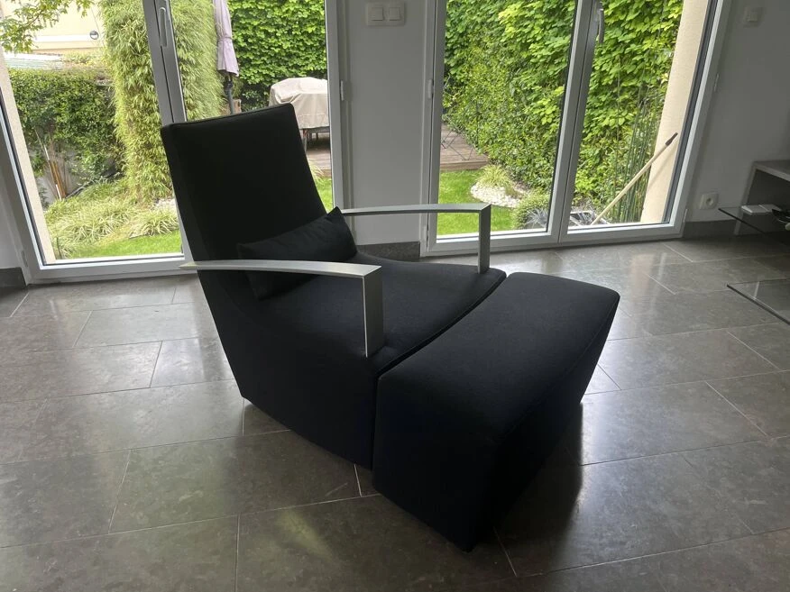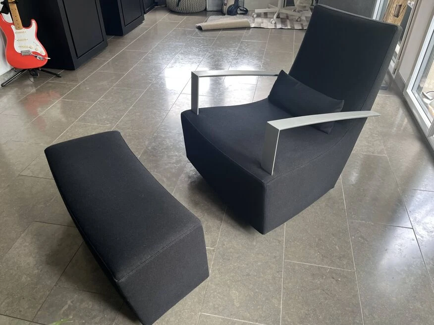 Armchair ligne roset neo design alban-sebastien gilles. Rocking chair adjustable by cylinder. Black felted wool + brushed aluminum armrests. Armchair length 90cm X width 70cm. Footrest 34cm X width 70cm.