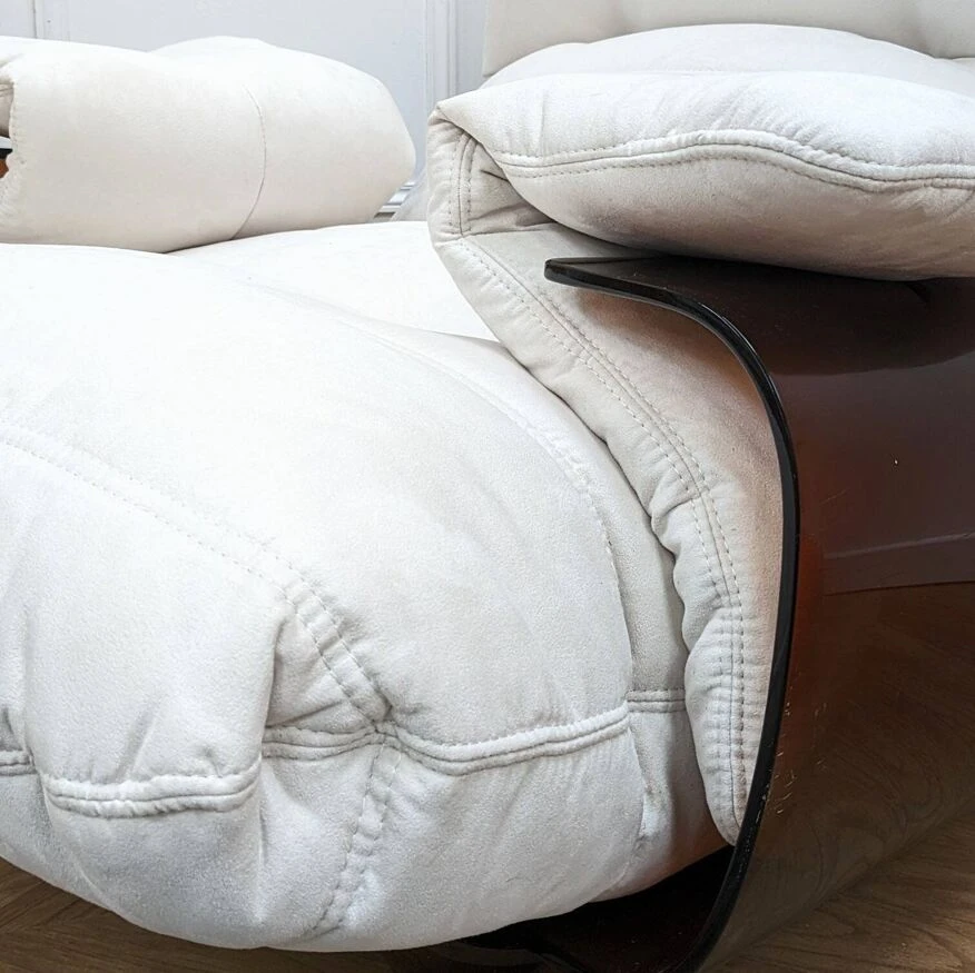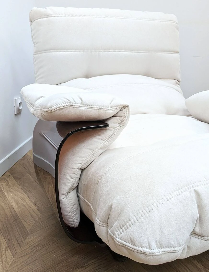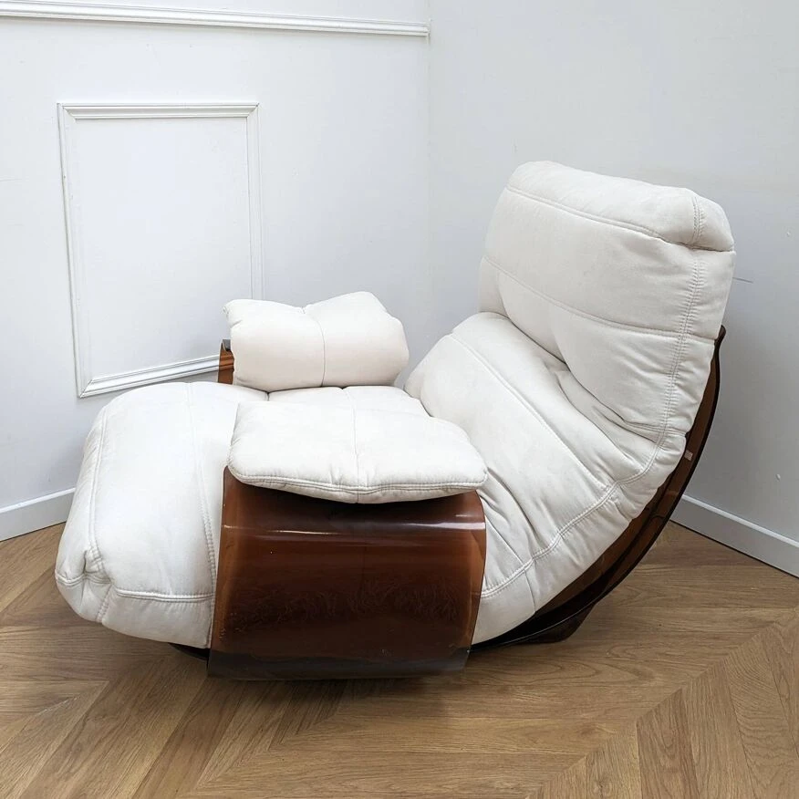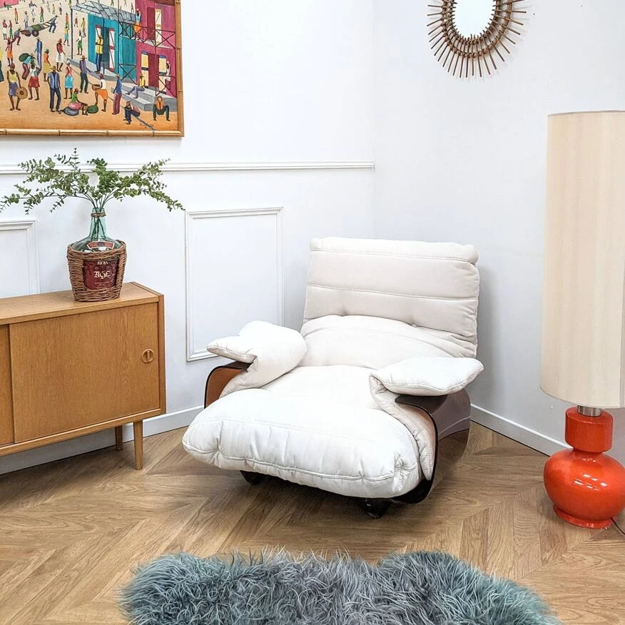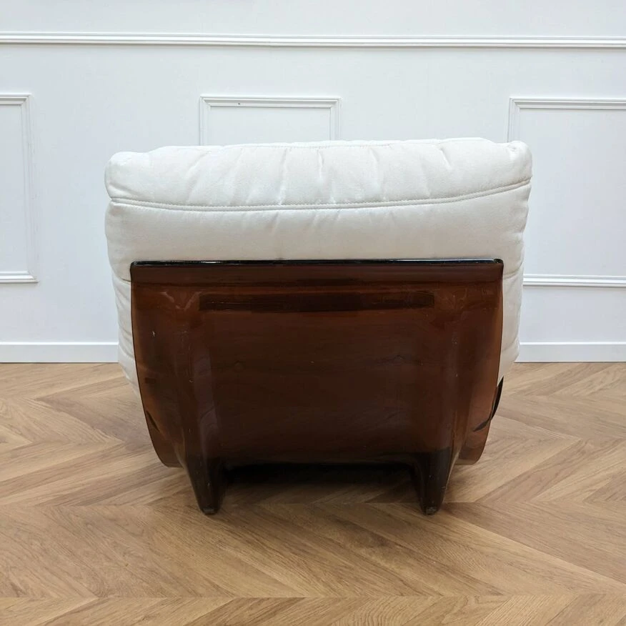 Marsala chair designed by Michel Ducaroy for Ligne Roset in the 1970s. Among Michel Ducaroy’s most emblematic creations is the Marsala armchair. It is made up of a thermoformed plexiglass shell in a smoked brown color, to which two armrests are attached and a super comfortable foam seat covered in an elegant velvet fabric, reupholstered in our restoration workshop. The seat cushion is completely detached from the shell. 2 Available dimensions: H83cm x L68cm x D87cm materials: Structure in smoked plexiglass and velvet fabric ref: 4070307
