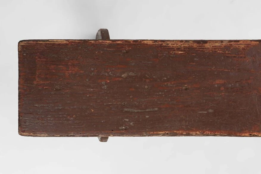 A rustic wooden bench with brown paint and beautiful patina due to age.