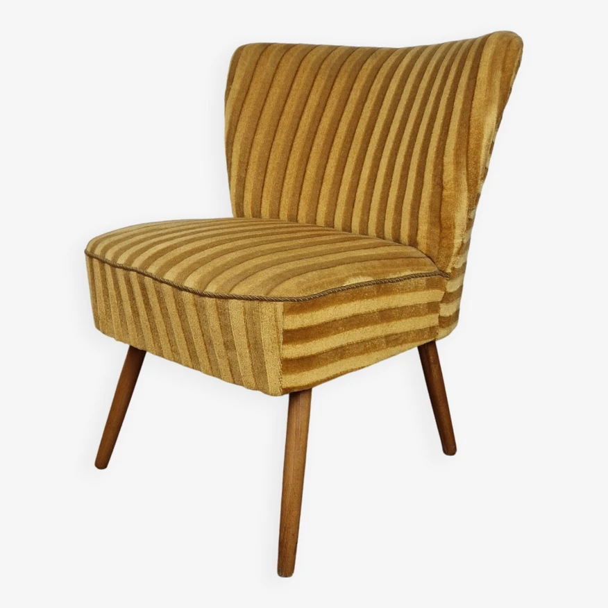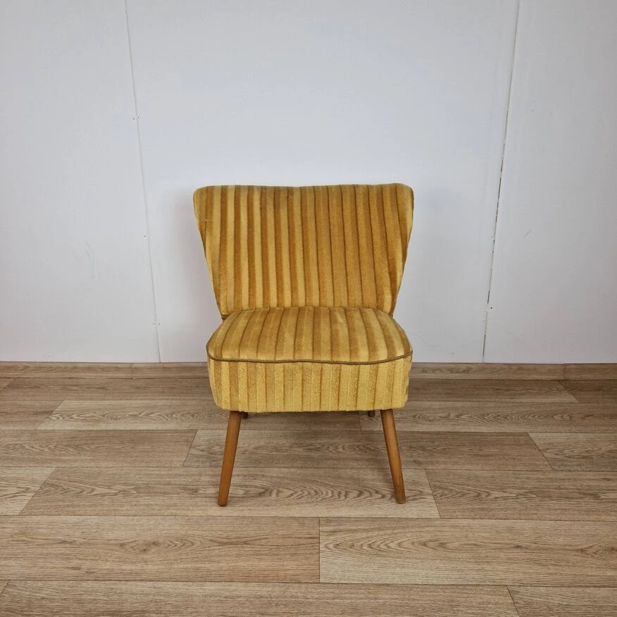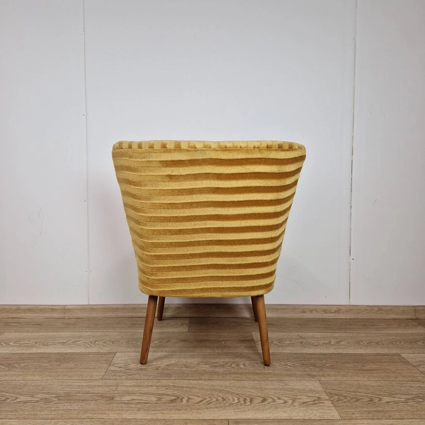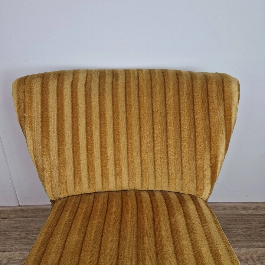 The seat and backrest are finished in mustard-colored velor fabric with stripes, and the whole is supported on turned beech legs.
