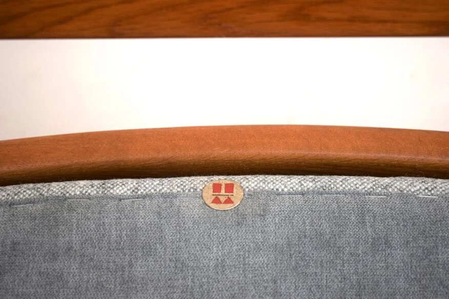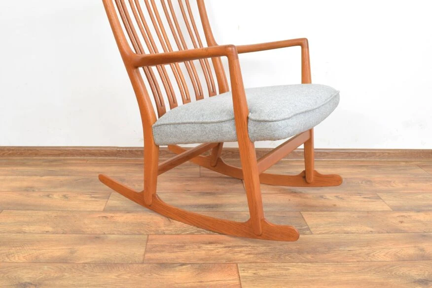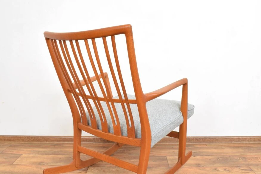 This rocking chair ws designed in the 1950s by Hans J. Wegner for Mikael Laursen. The frame of the armchair is made of solid oak wood and has been professionally and carefully restored by removing old coatings, staining and finishing with varnish. The seat has been re-upholstered with a high-quality grey color fabric made of 100% wool.