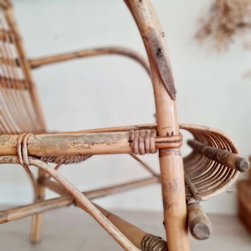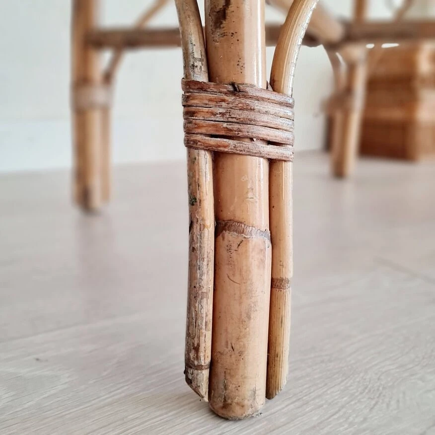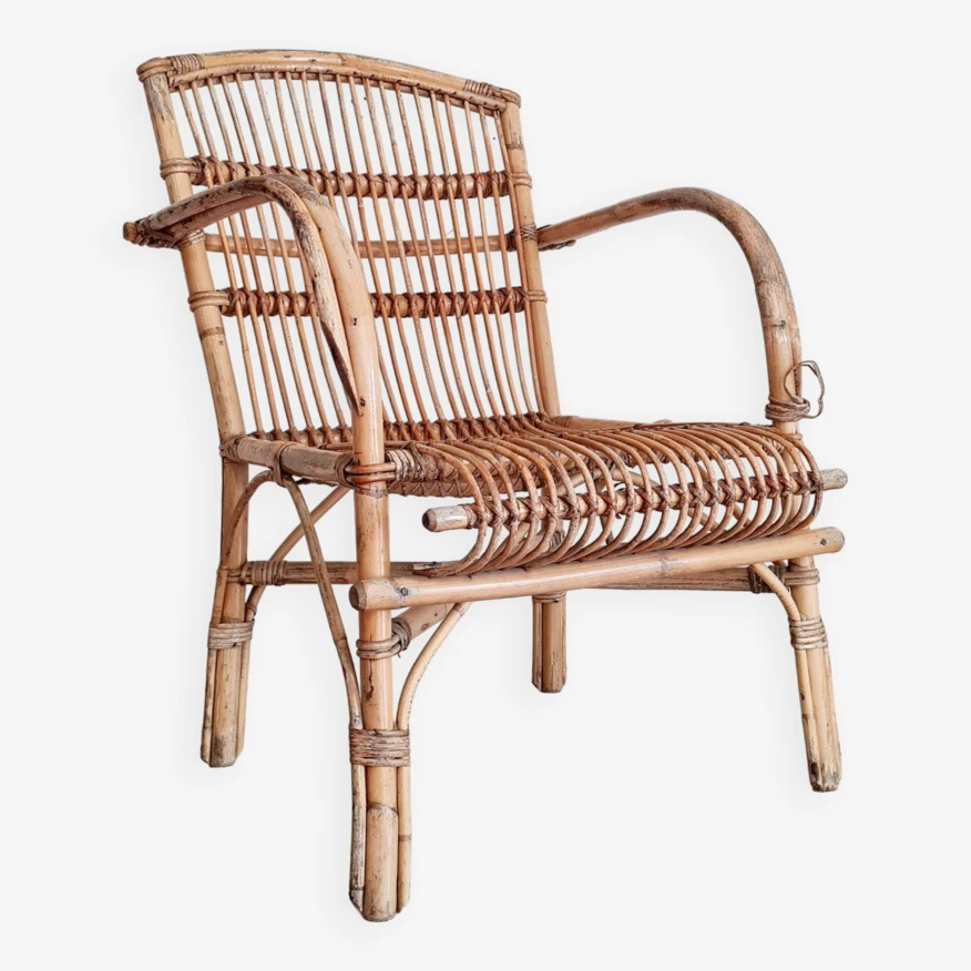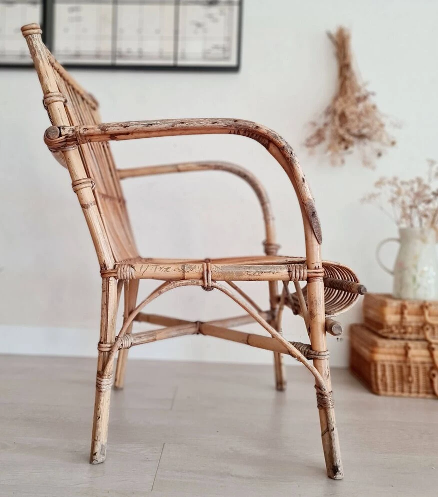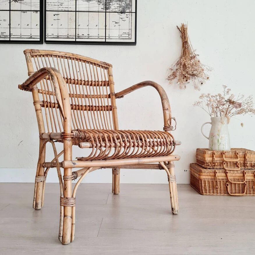 Rattan furniture from the 60s offers pretty decorative pieces, to breathe a bohemian and warm look into your living room, in a bedroom with selected cushions, in a bathroom or in the entrance or outside with the arrival beautiful days old from the 60s, this vintage rattan armchair is in very good condition.