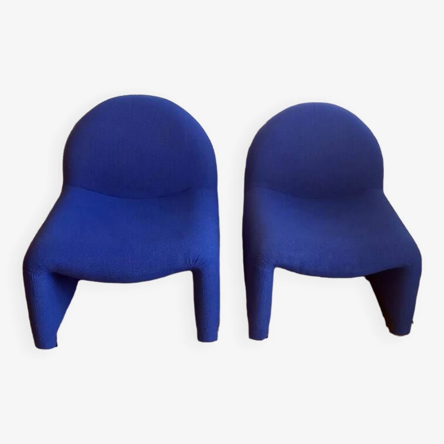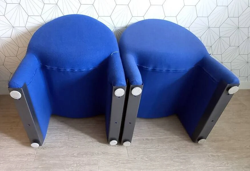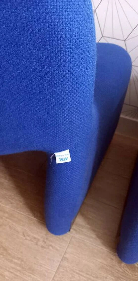 Authentic pair of atal removable cover chairs in blue wool fabric. Design from the 1970s. Dimensions (in cm): back height 70, depth 70, width 60, seat height 38, seat depth 50. Weight: 14 kg each. In very good condition with functional adjustable feet. Note the possibility of joining the fireside chairs using appropriate side bars (see photo).