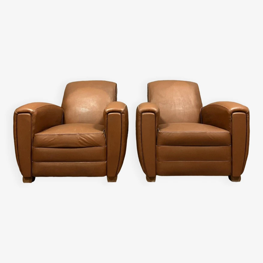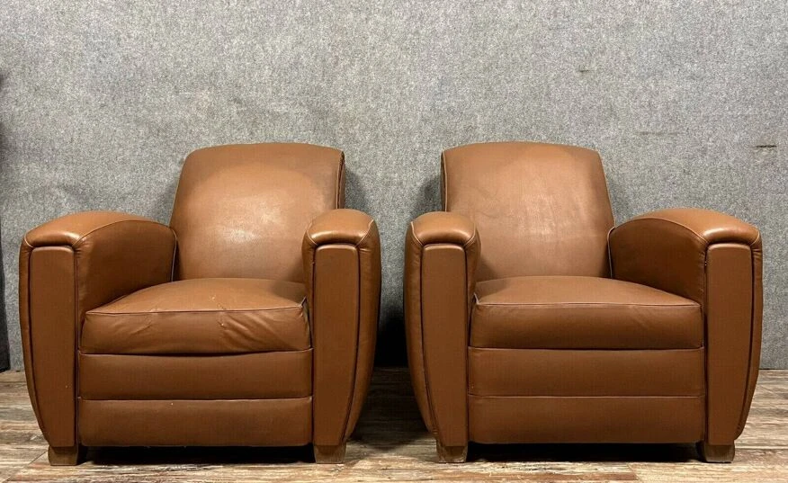 Pair of club armchairs in havana skai art deco period circa 1940 2 small scratches on 1 of the 2 h80 X 101 X 84.