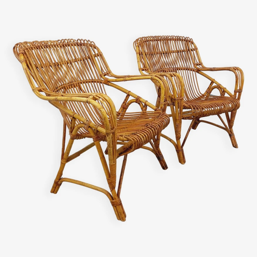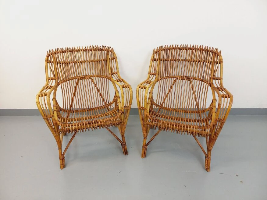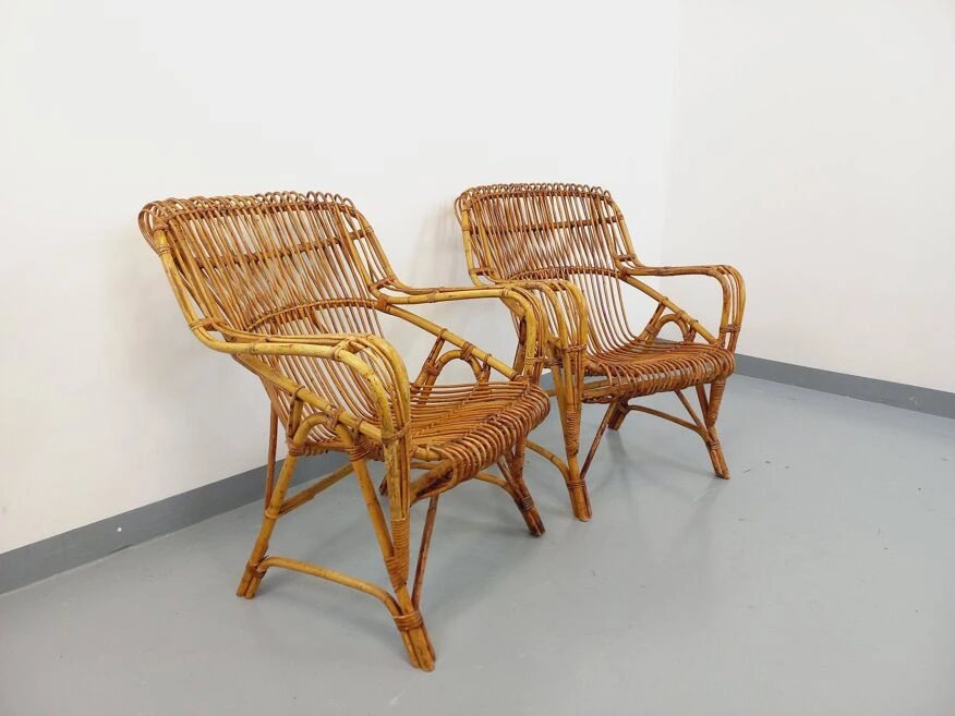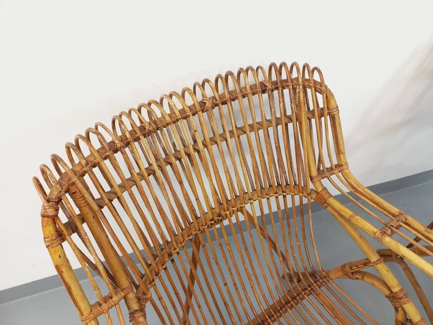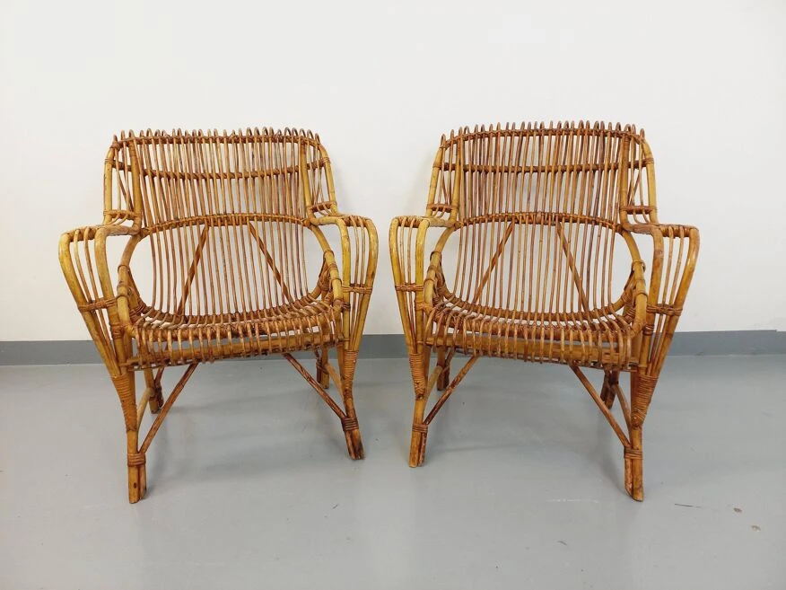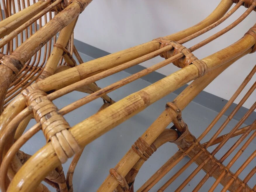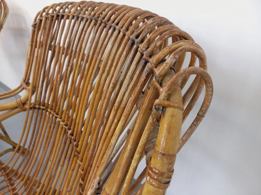 Pair of italian armchairs by vittorio bonacina in vintage rattan from the 60s, rare and exceptional design with volume work on the seats and backs.