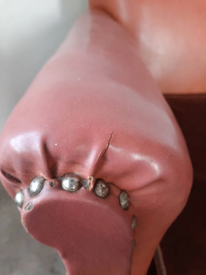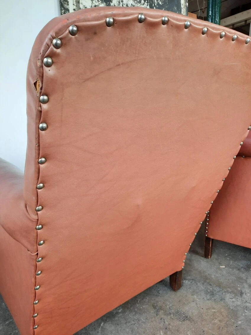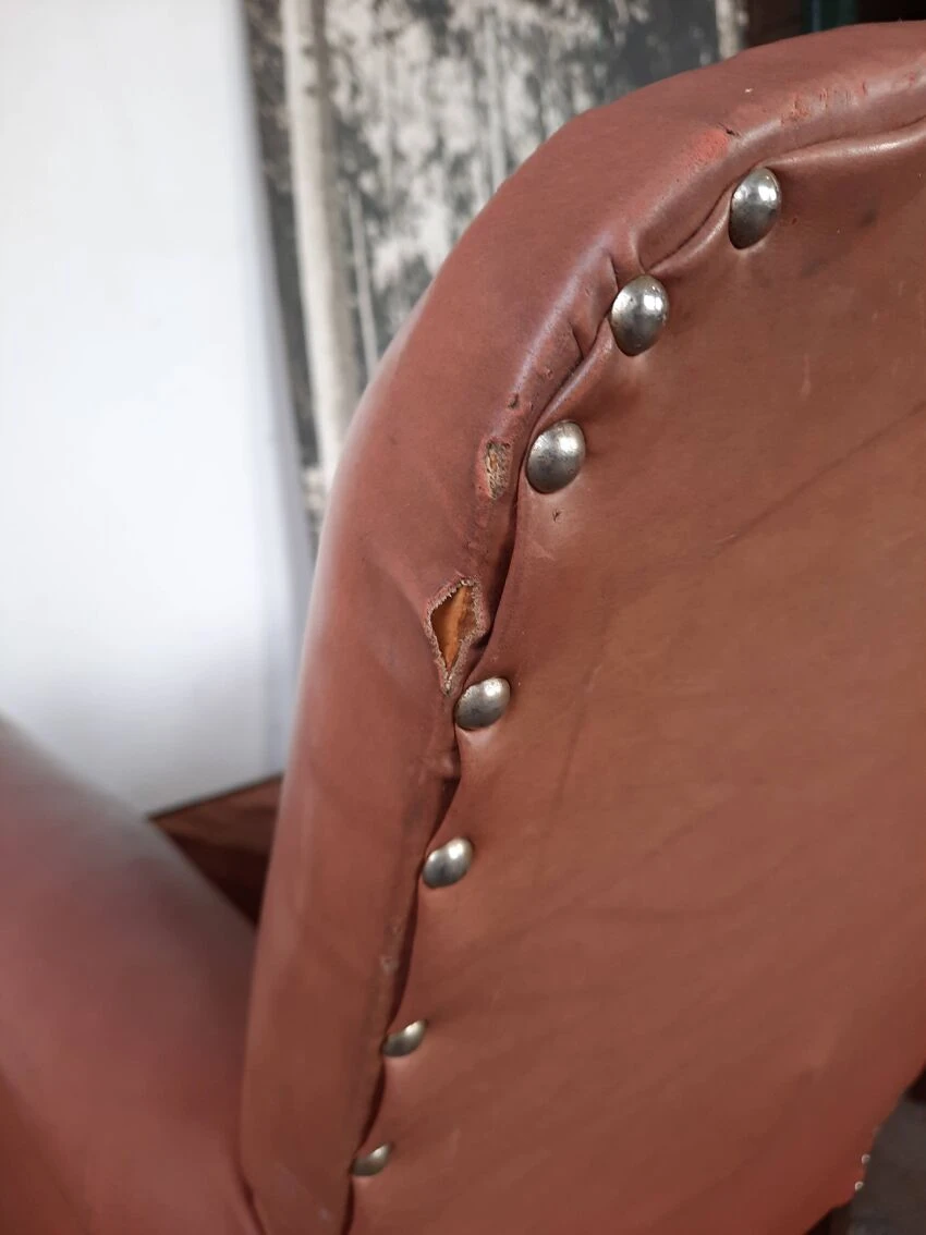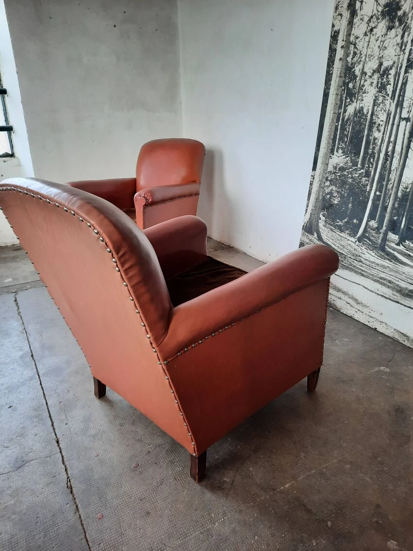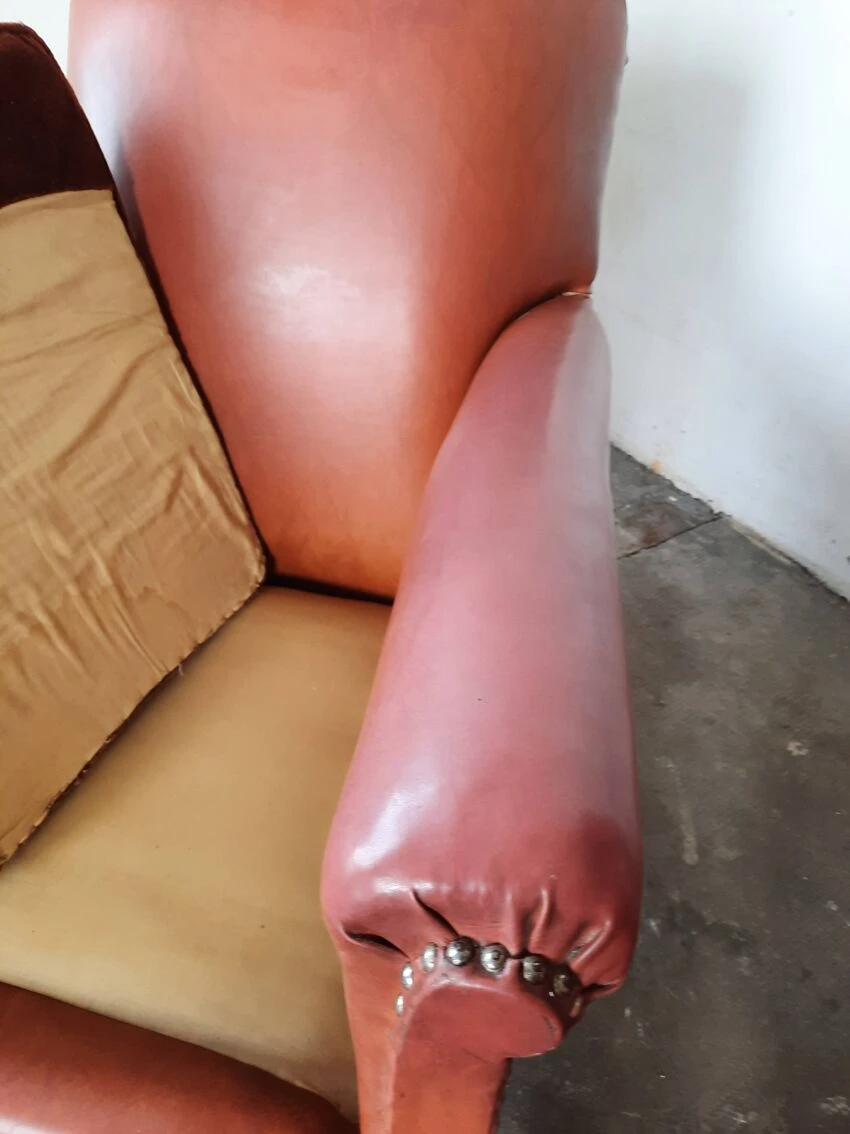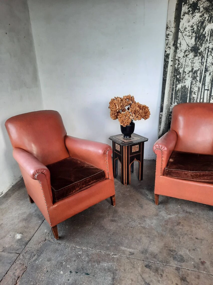 Pair of club chairs in leatherette, velvet cushions. Small tears on leatherette, small tears are photographed, seat height approximately 39 cm, depth approximately 80cm, width 74cm, back height 87cm. Good vintage condition.