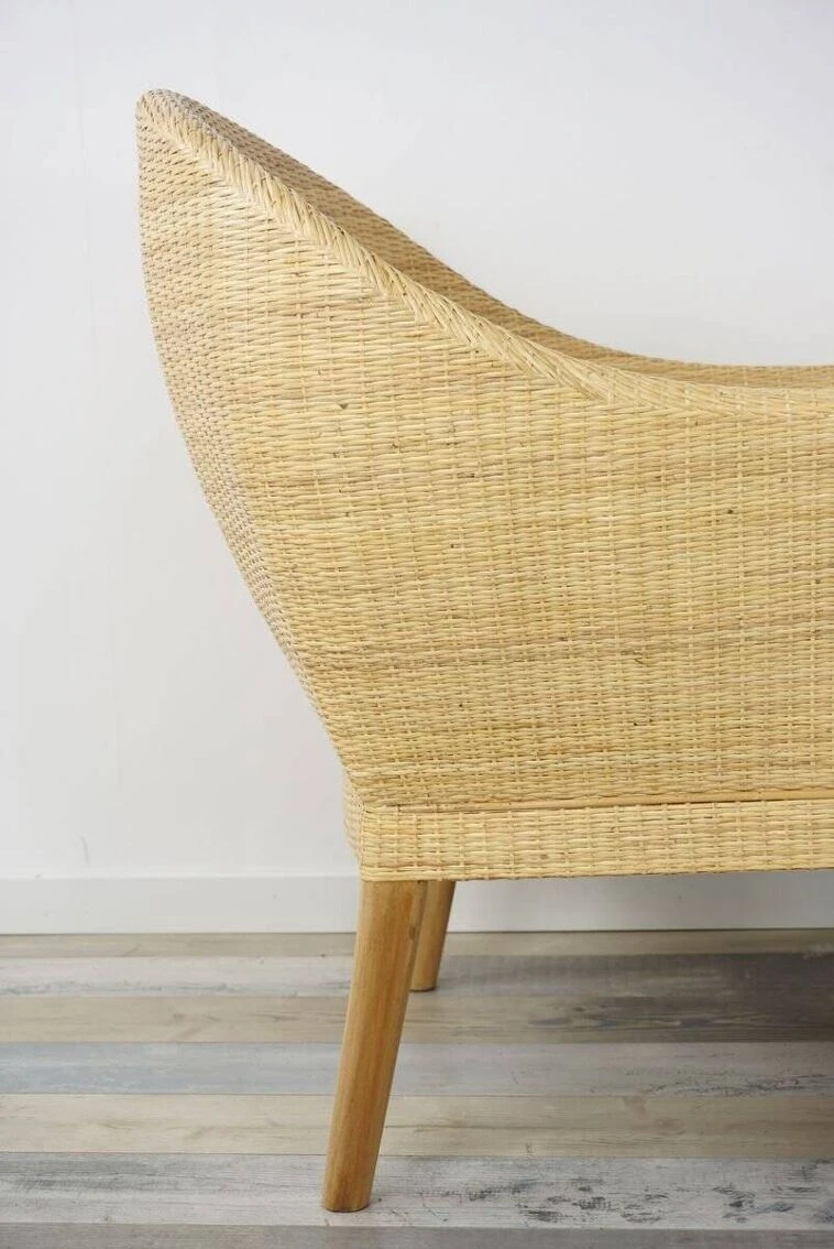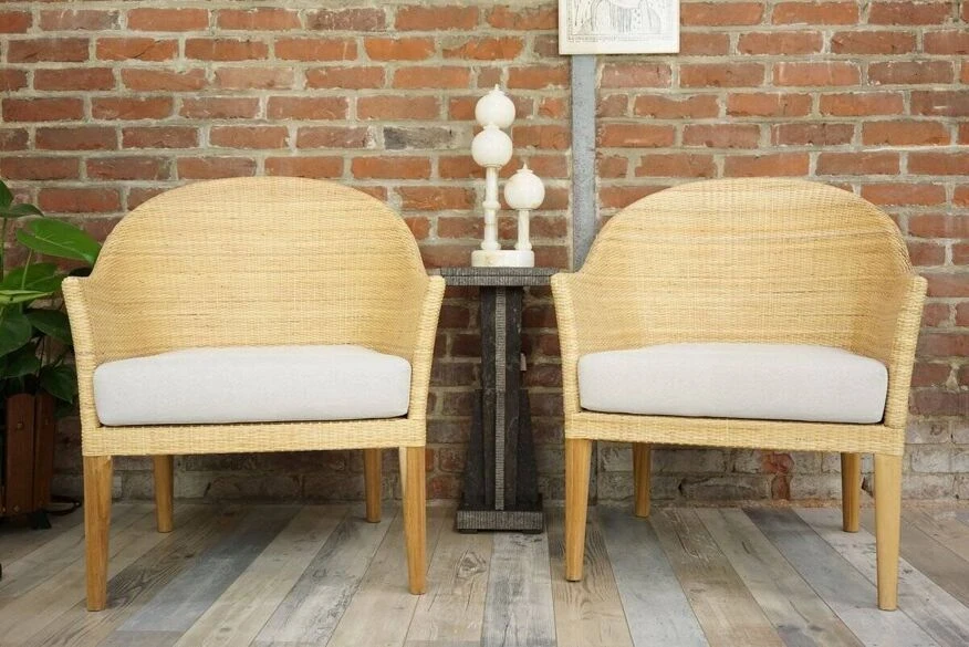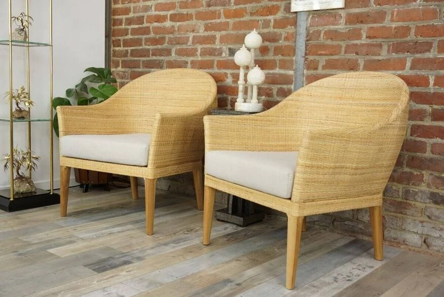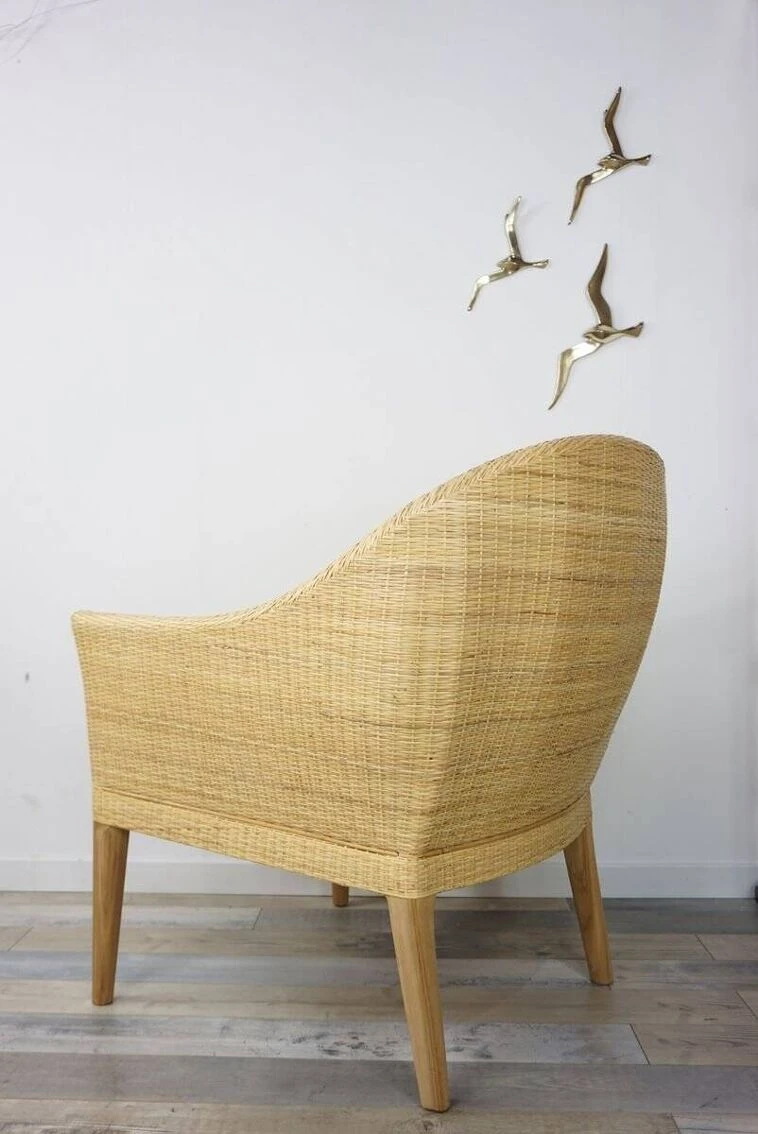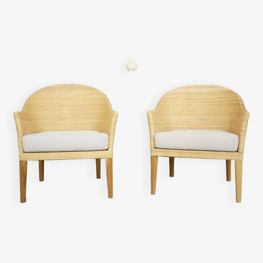 Pair of armchairs with teak structure and rounded shell in hand-woven rattan.