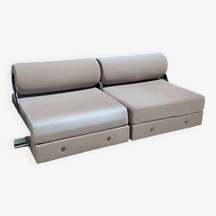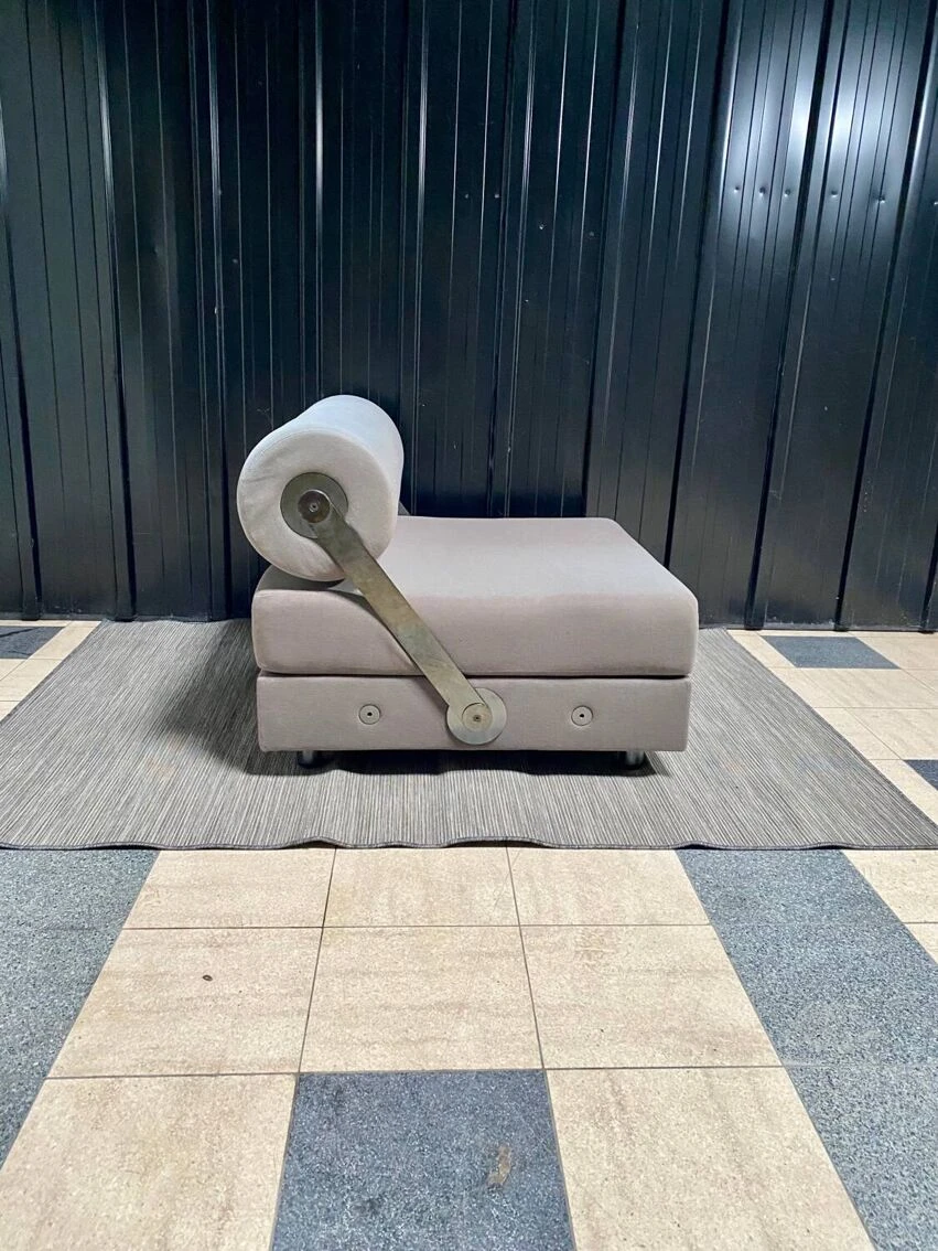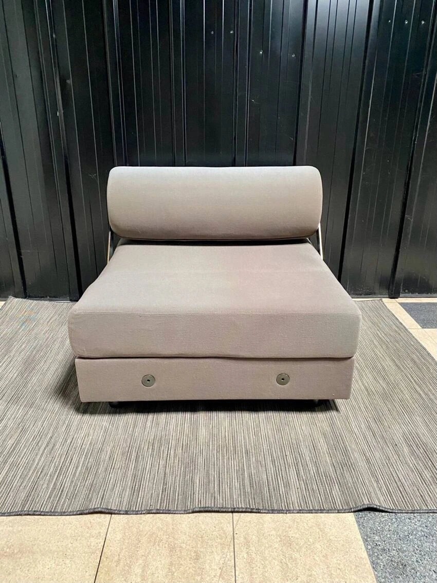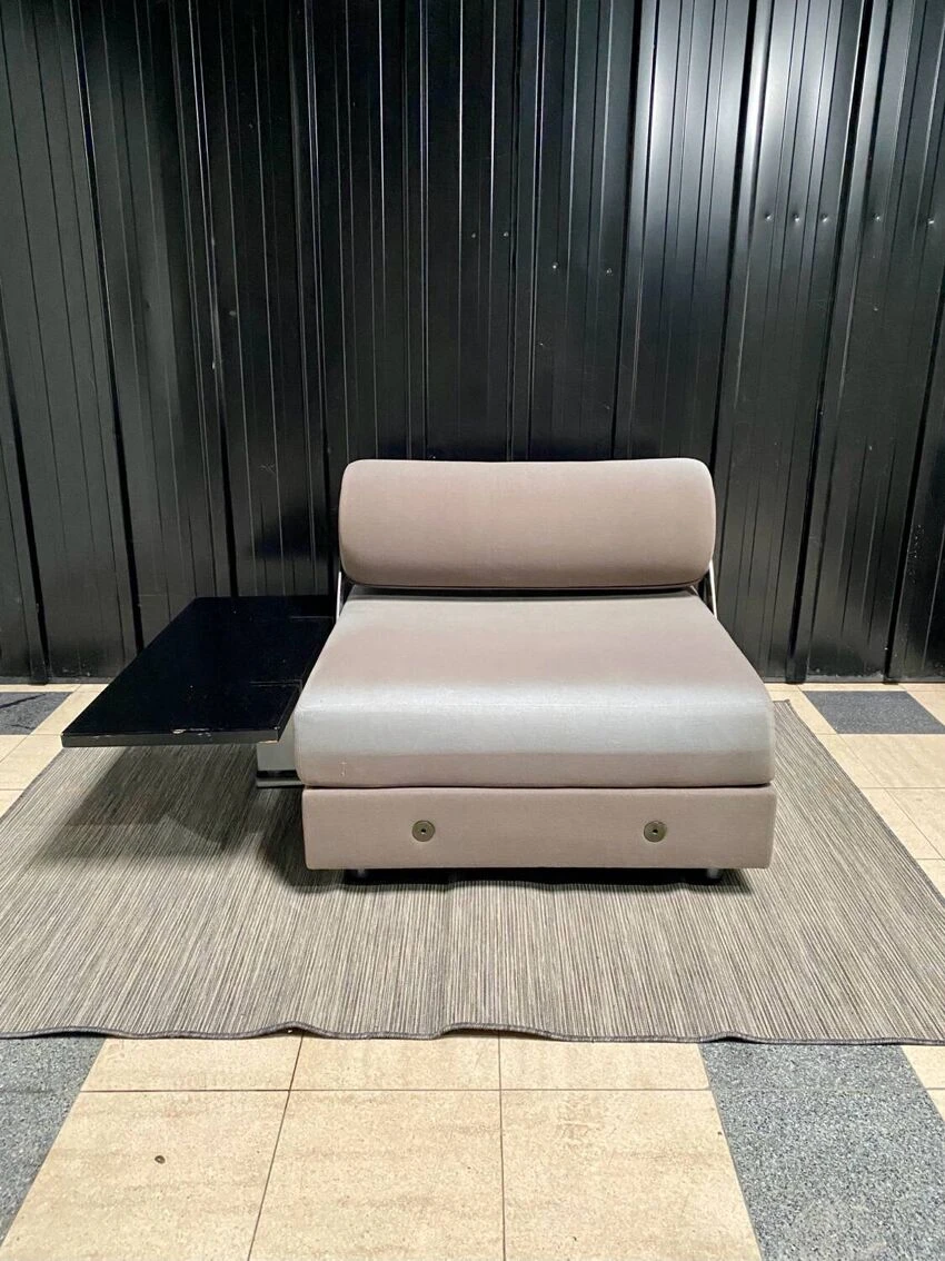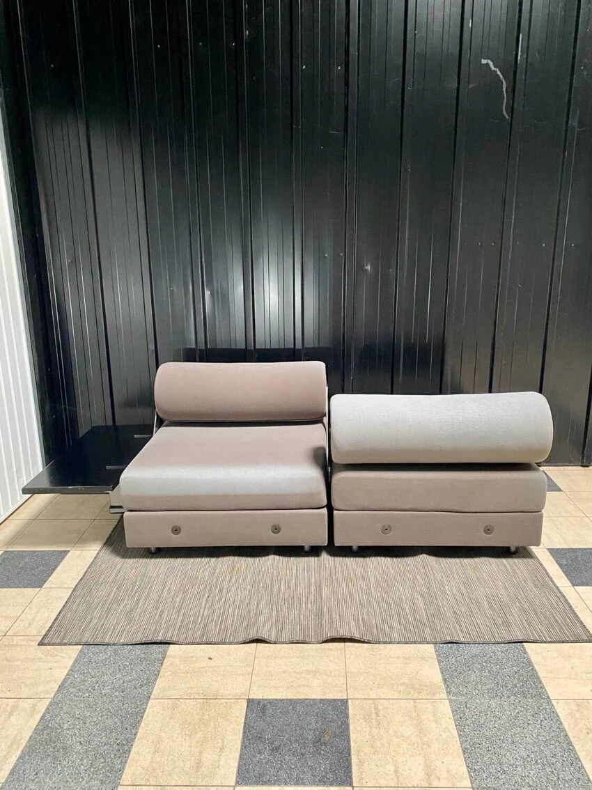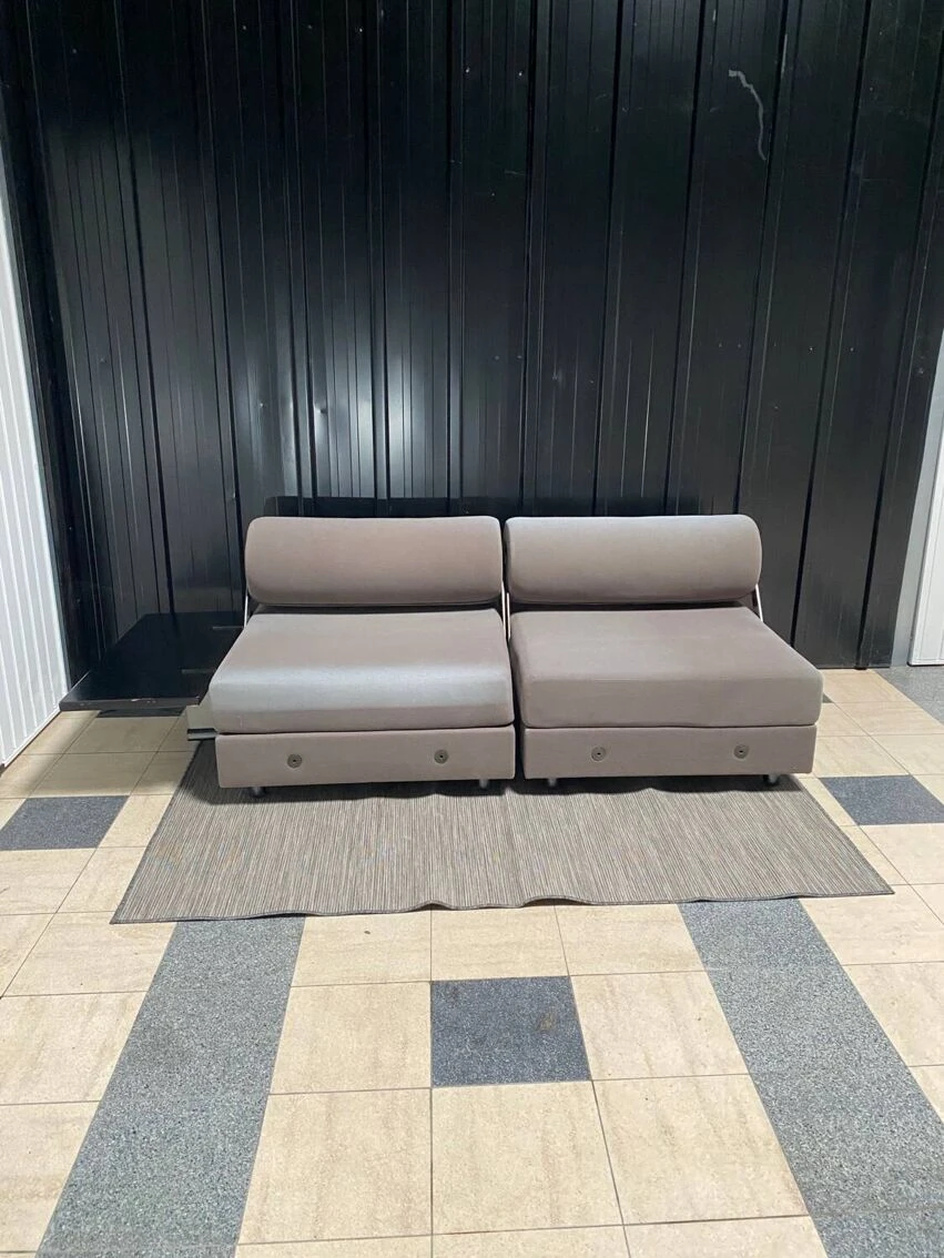 Pair of Todo Modo armchairs by Jean Michel Wilmotte, produced by Tecno. Model designed for the Louvre in 1993. Model known from documents, no stamp. The backrest is reversible. One of the two armchairs is equipped with a tablet. They are made of taupe gray fabric, with discoloration and a slight tear on one back. Note a knock on the side of one of the headrests, on the wooden structure inside, sensitive only to touch. Normal used condition.