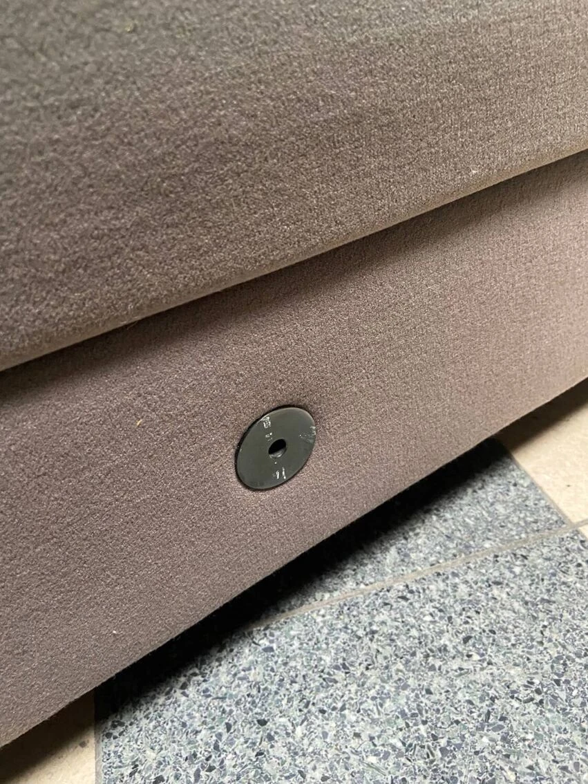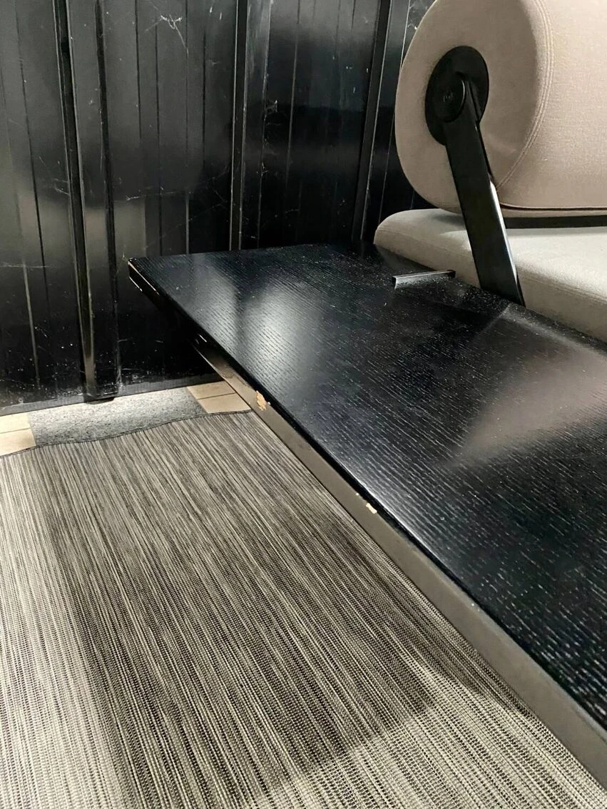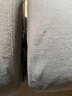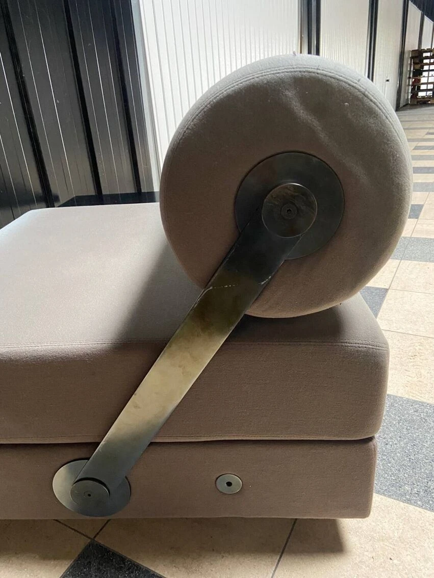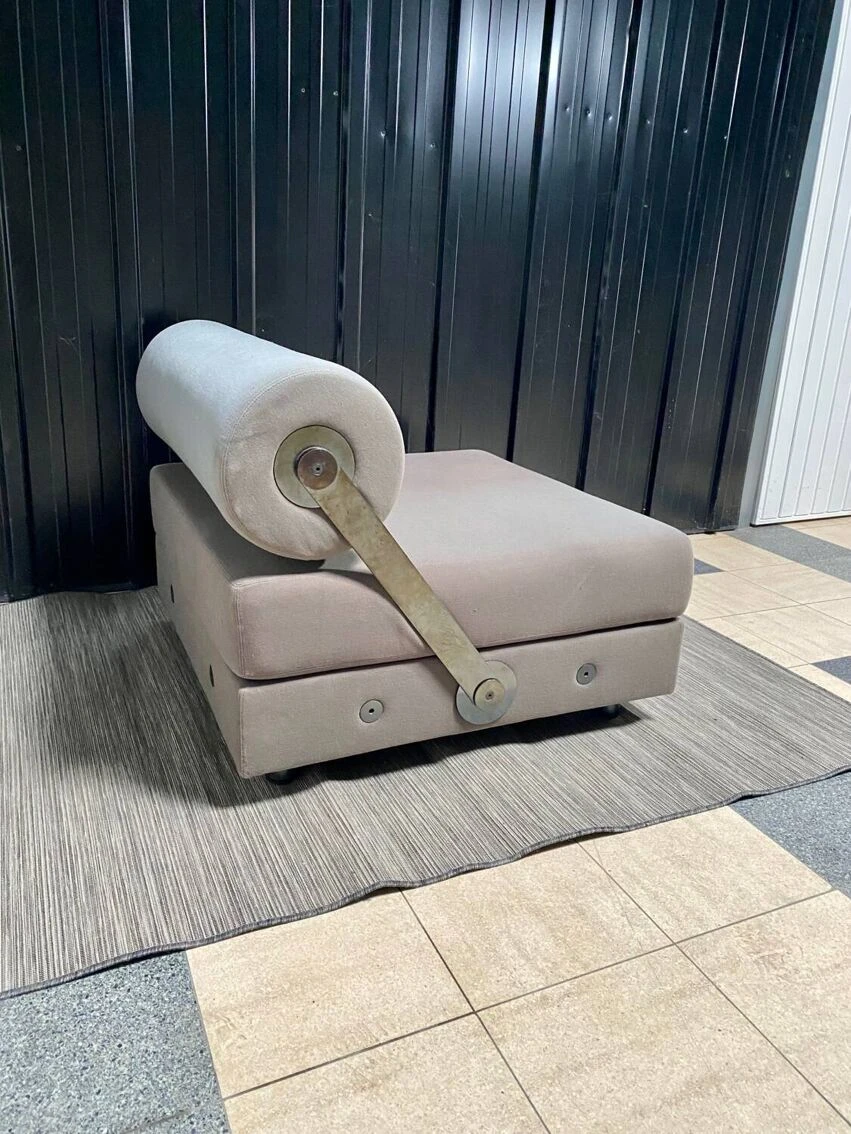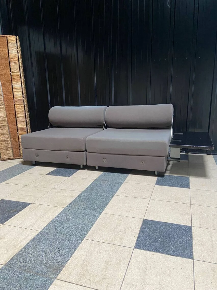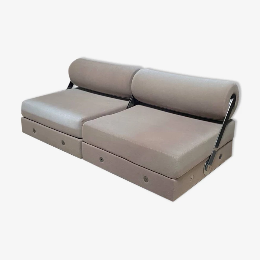 Pair of Todo Modo armchairs by Jean Michel Wilmotte, produced by Tecno. Model designed for the Louvre in 1993. Model known from documents, no stamp. The backrest is reversible. One of the two armchairs is equipped with a tablet. They are made of taupe gray fabric, with discoloration and a slight tear on one back. Note a knock on the side of one of the headrests, on the wooden structure inside, sensitive only to touch. Normal used condition.