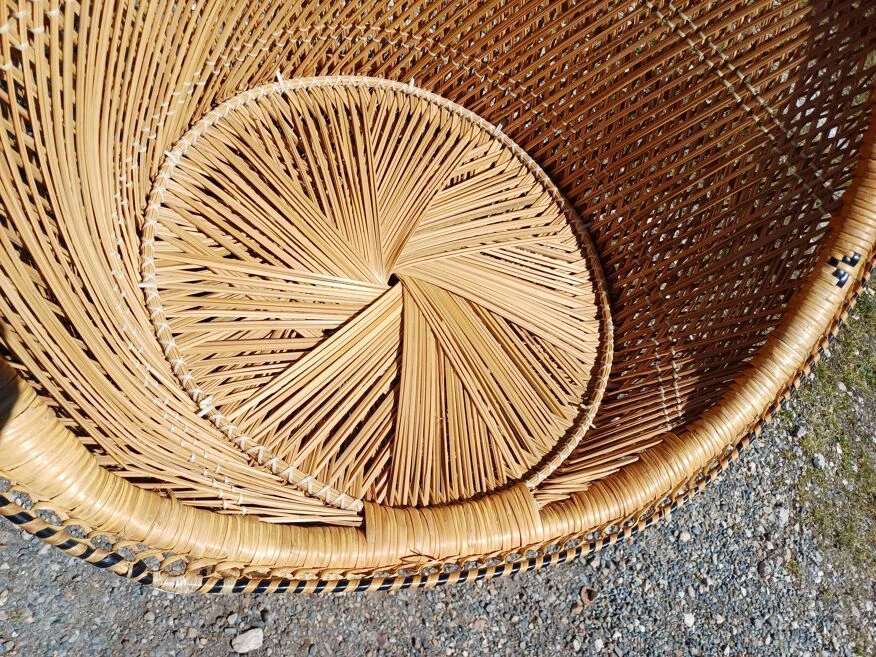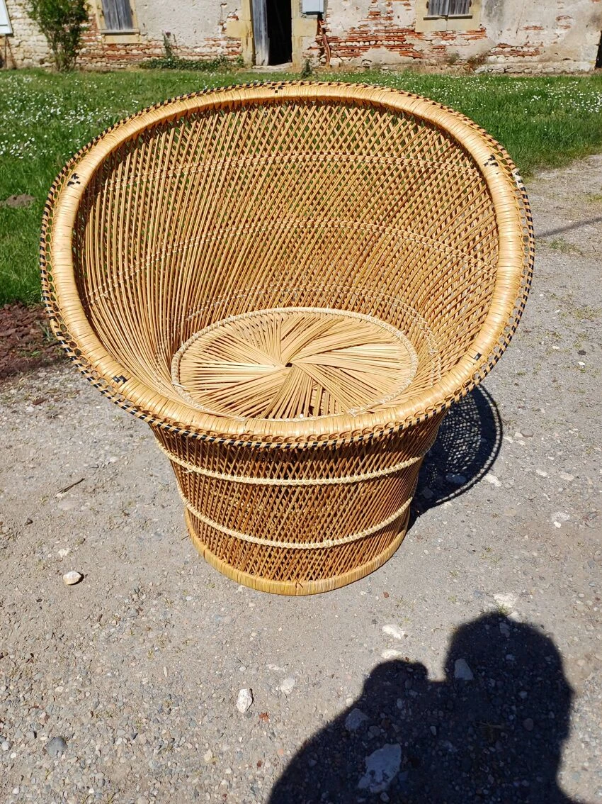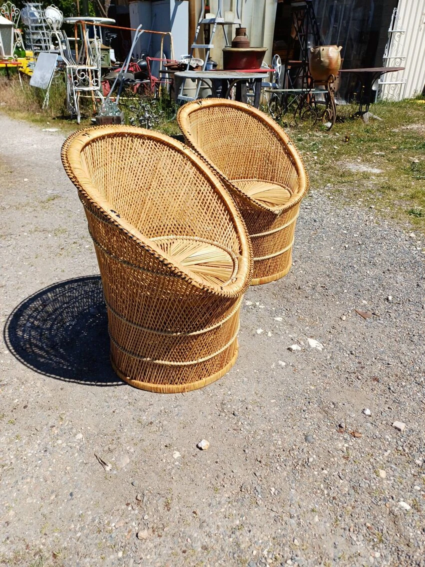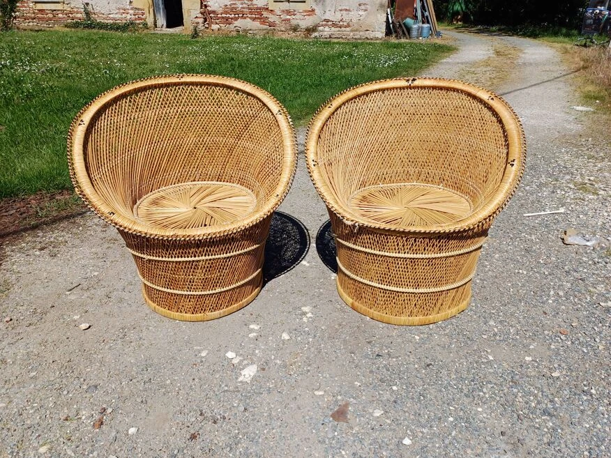 Pair of vintage wicker armchairs, height: 81 cm, seat height: 43 cm, length and width: 55 cm by 80 cm, weight: 7 kg, very good condition.