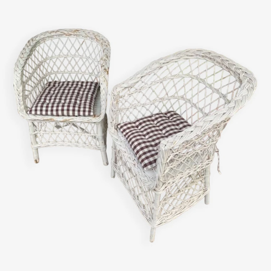 2 chairs in white rattan, very beautiful patina and very comfortable, with brand new cushions, vintage chairs, anne 1980.