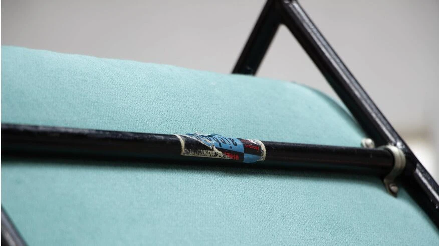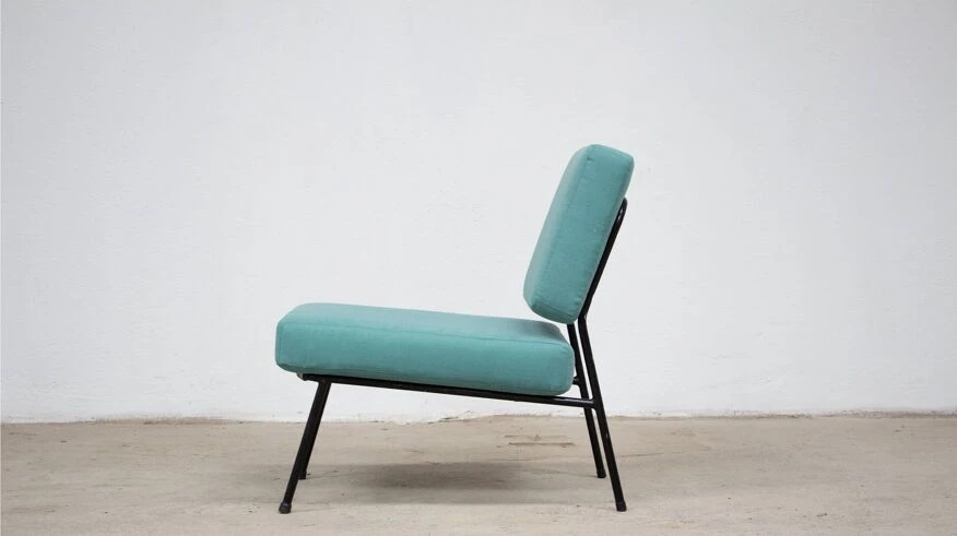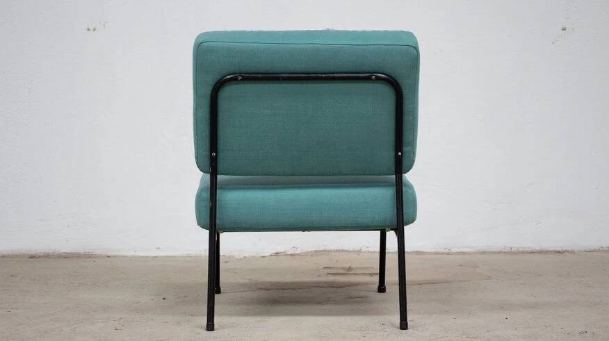 Armchair by Pierre Guariche (1926-1995) for the publisher Airborne in the 1950s. Complete restoration by professional upholsterer: HR 35 foam, thick wadding. High-end cotton/linen fabric from the French brand Casamance in storm green color, inspired by the pattern and texture of tweed with its herringbone weave. Removable cover with upholstery. Structure in black lacquered round steel tube curved on the backrest. The structure is original with its patina of use. Excellent condition. Airborne sticker present on a tube under the seat. Light and comfortable, it will find its place even in the smallest spaces. Dimensions: Height: 75 cm Seat Height: 39 cm Length: 55 cm Depth: 75 cm