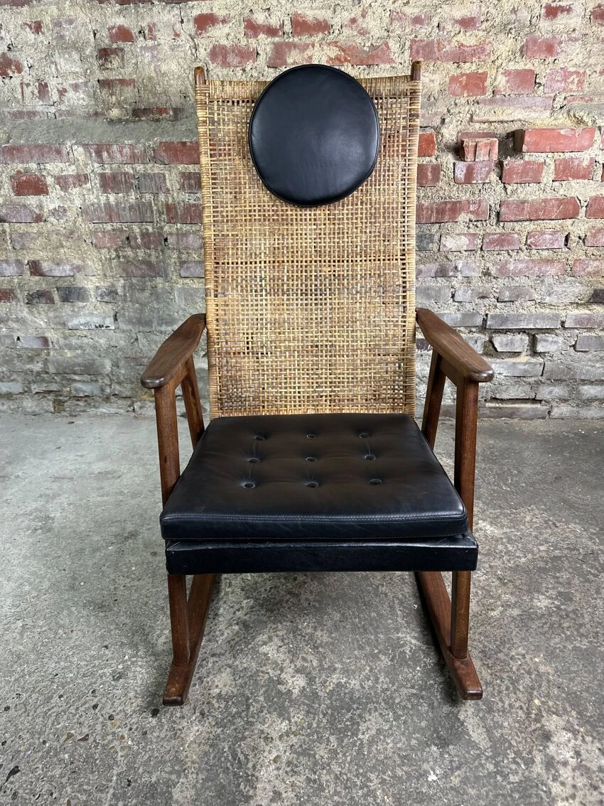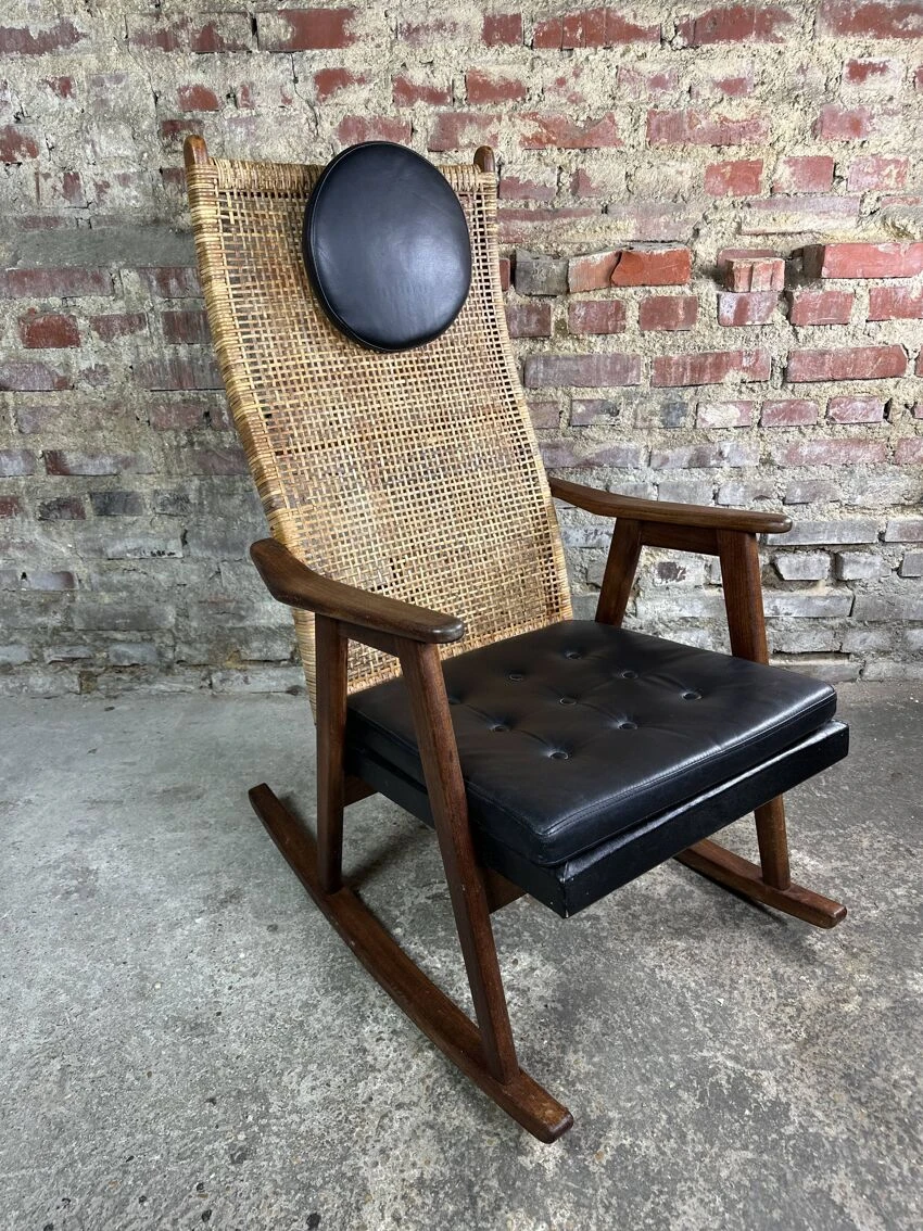 Rocking chair or armchair in teak curved back cane rattan vintage 1950 by pj muntendam produced by gebroeders jokers.