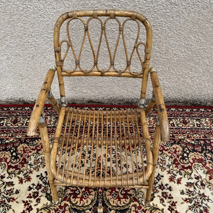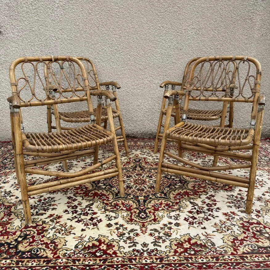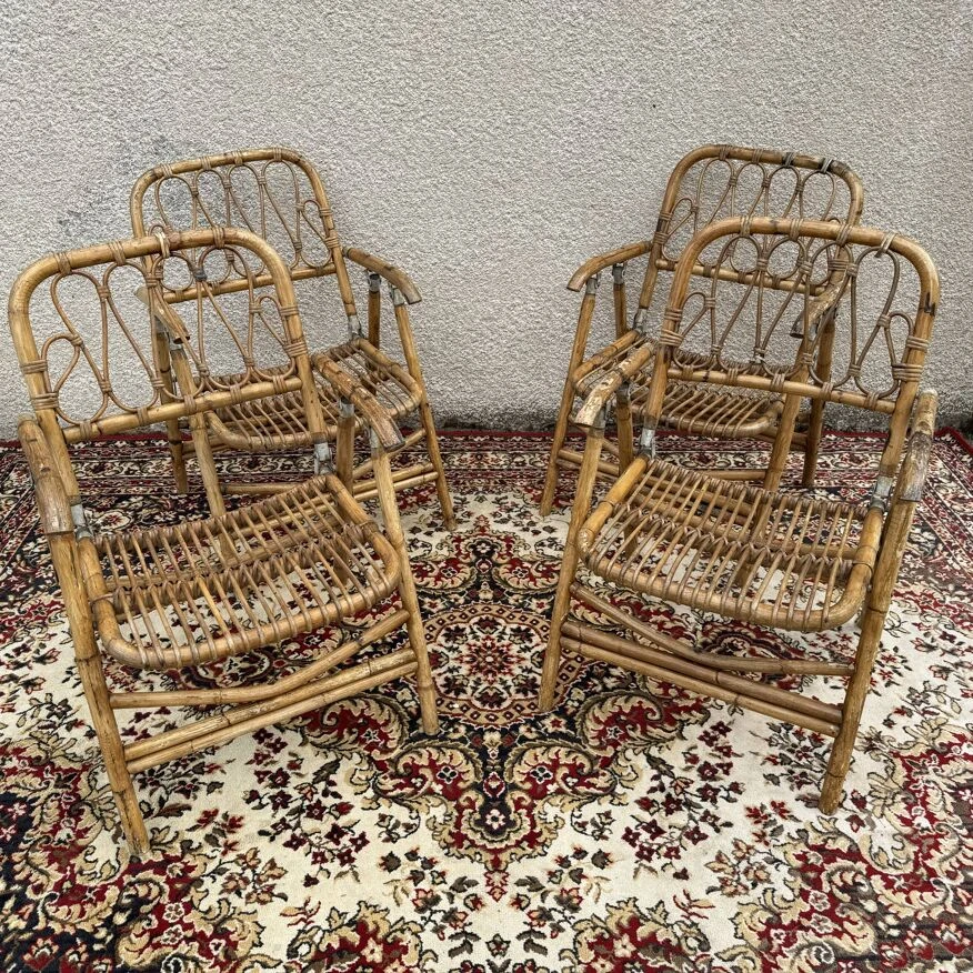 Magnificent series of 4 folding armchairs in rattan and bamboo from the 60s.