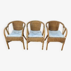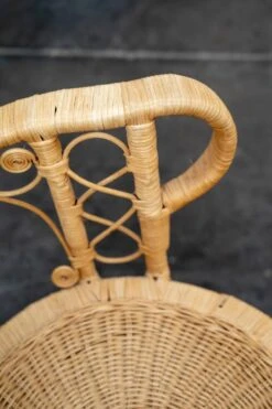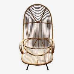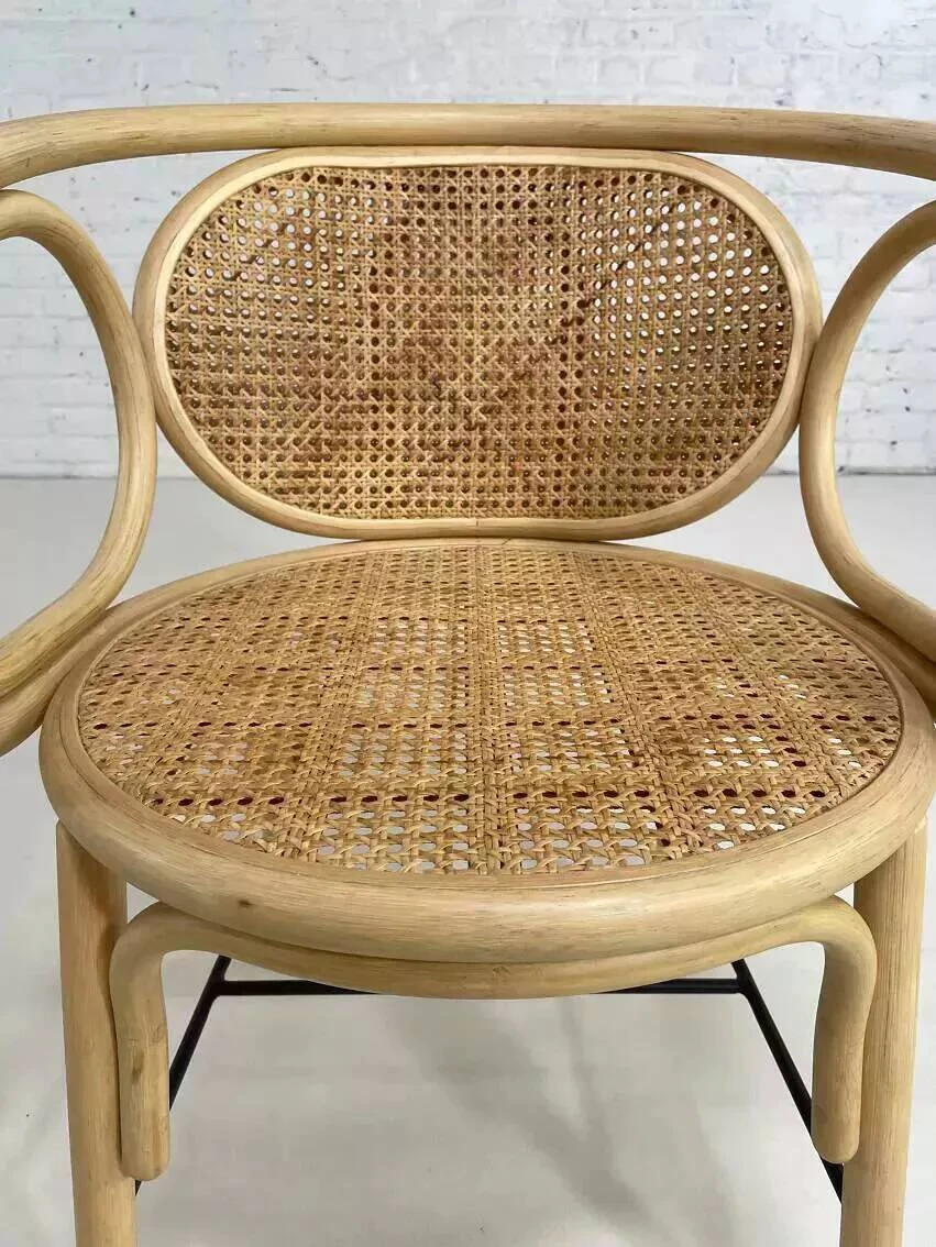 Armchair with a rounded and welcoming rattan structure decorated with a seat (height 47cm / diameter 49cm) and a cane back and graphite metal spacer.