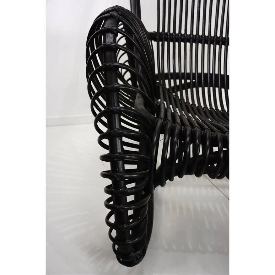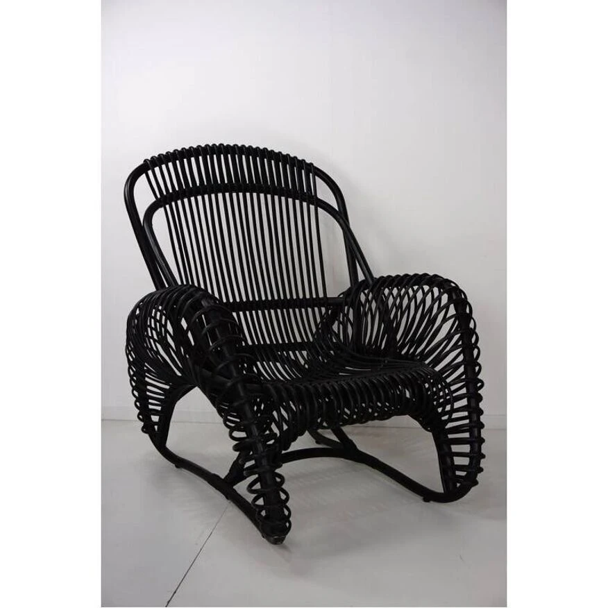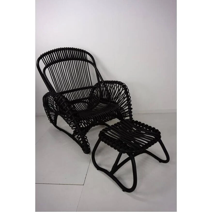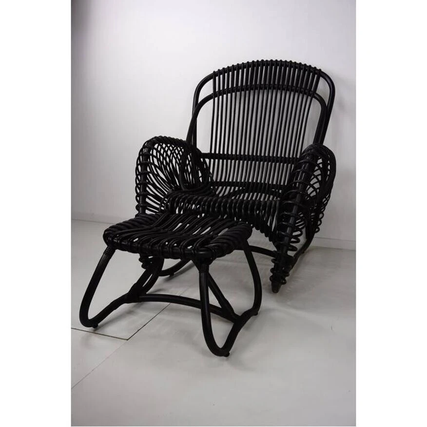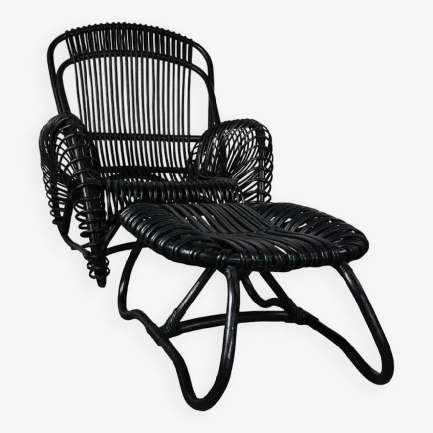 Armchair all rounded, curved and scrolled in black lacquered curved rattan with its matching footrest.