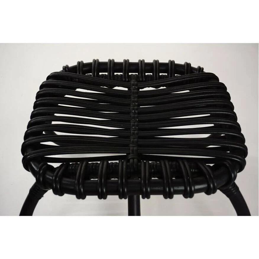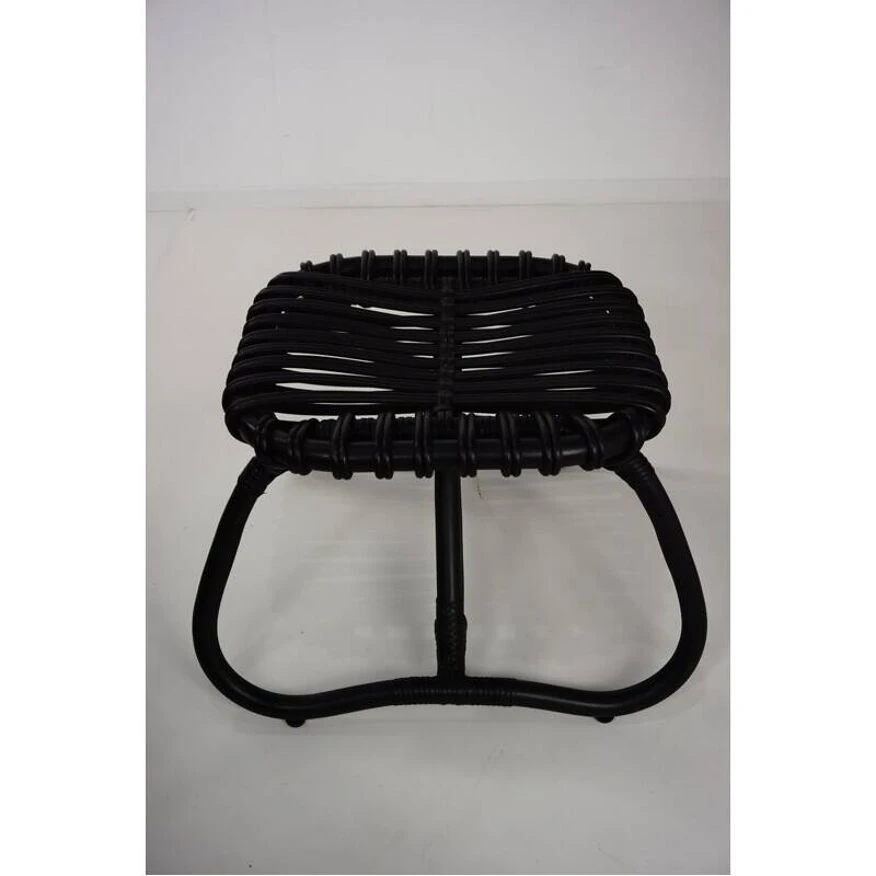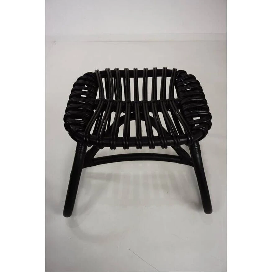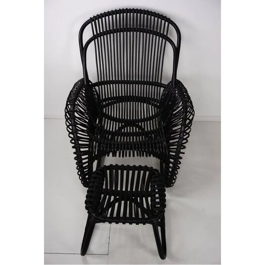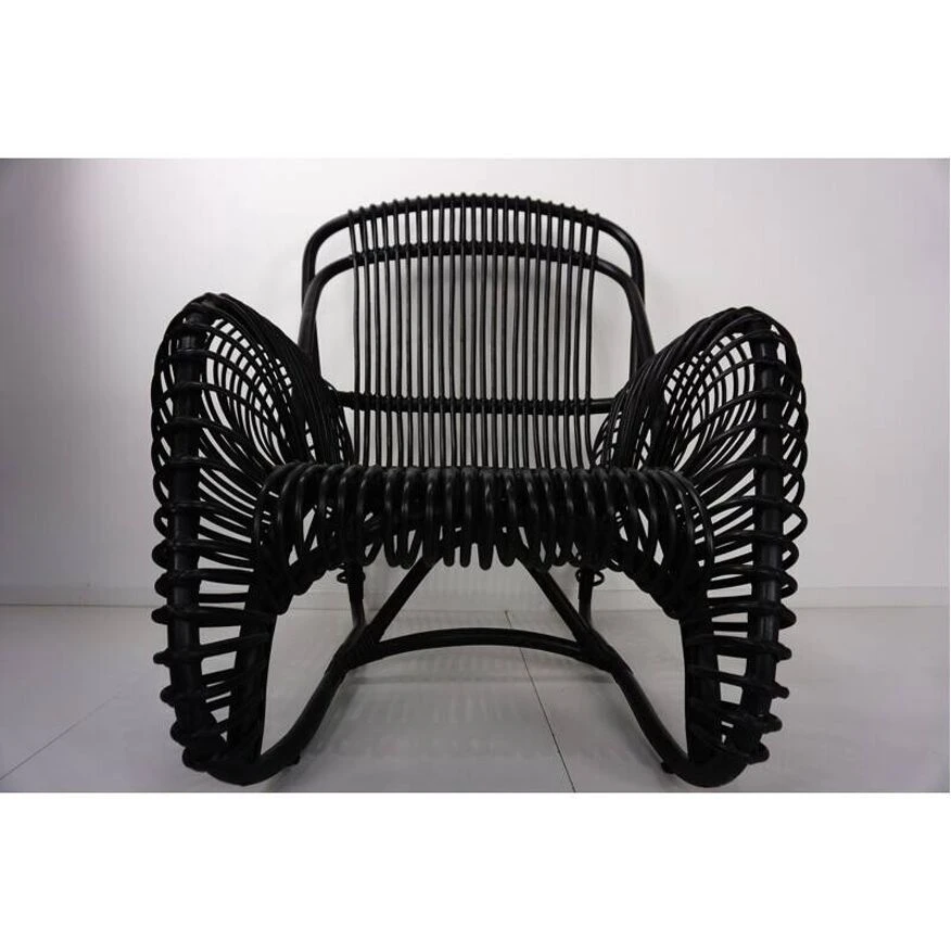 Armchair all rounded, curved and scrolled in black lacquered curved rattan with its matching footrest.