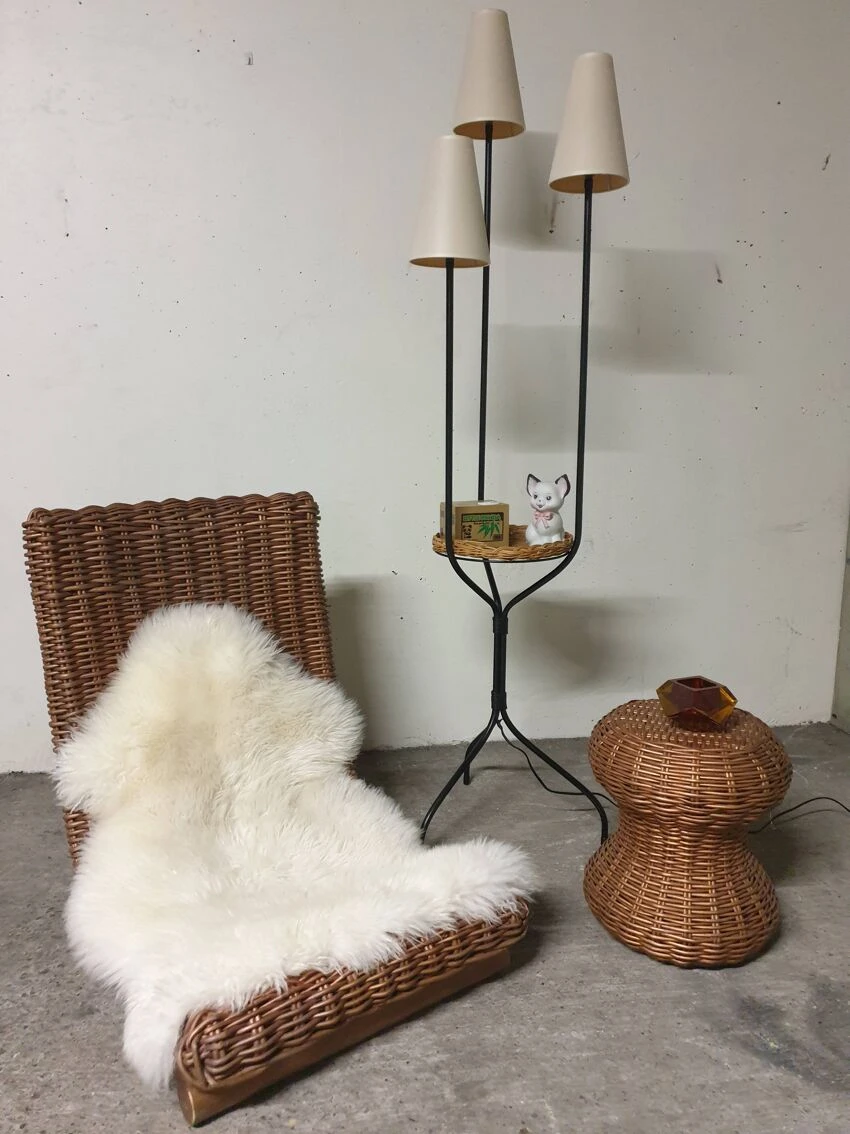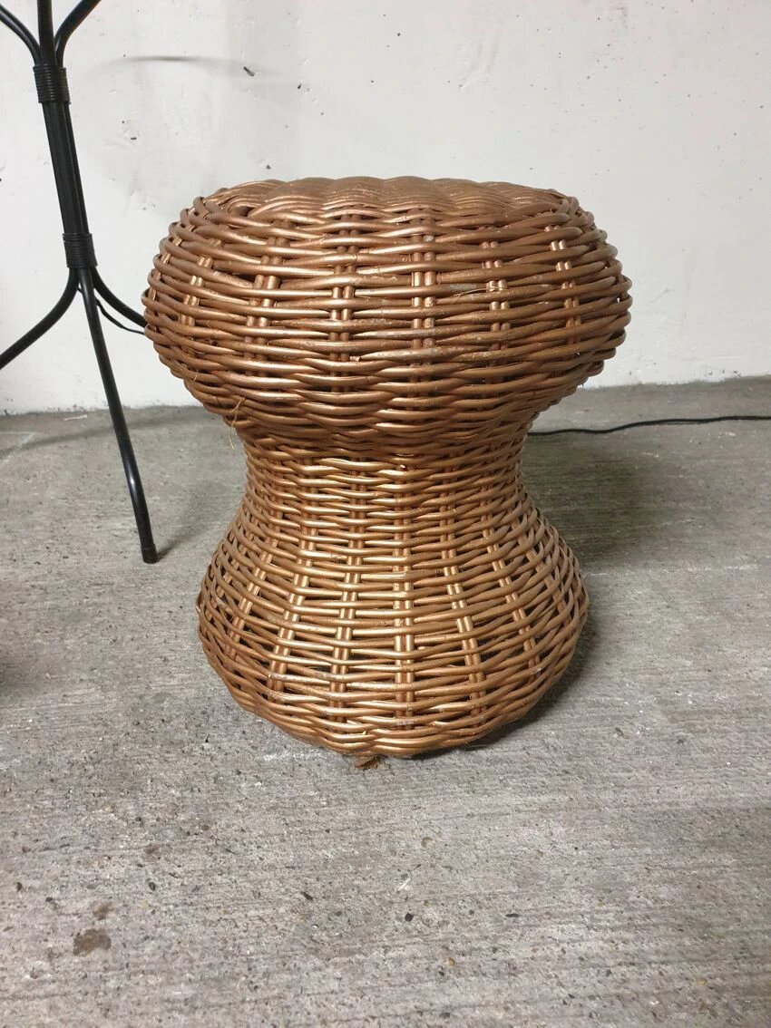 Very pretty armchair set plus its stool or rattan coffee table. To be used indoors or outdoors, the set is made of natural rattan which has been painted a copper bronze color. Very good condition, stable and functional. Dimensions: Armchair width 60cm, depth 75cm, height 77cm. Stool diameter 35cm, height 40cm. Delivery and dispatch on request. See you soon !