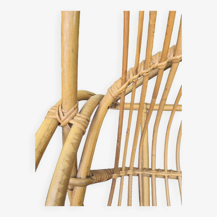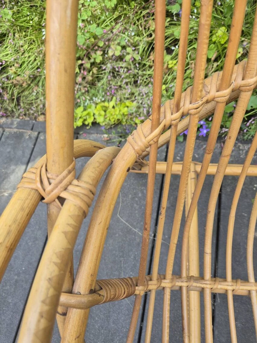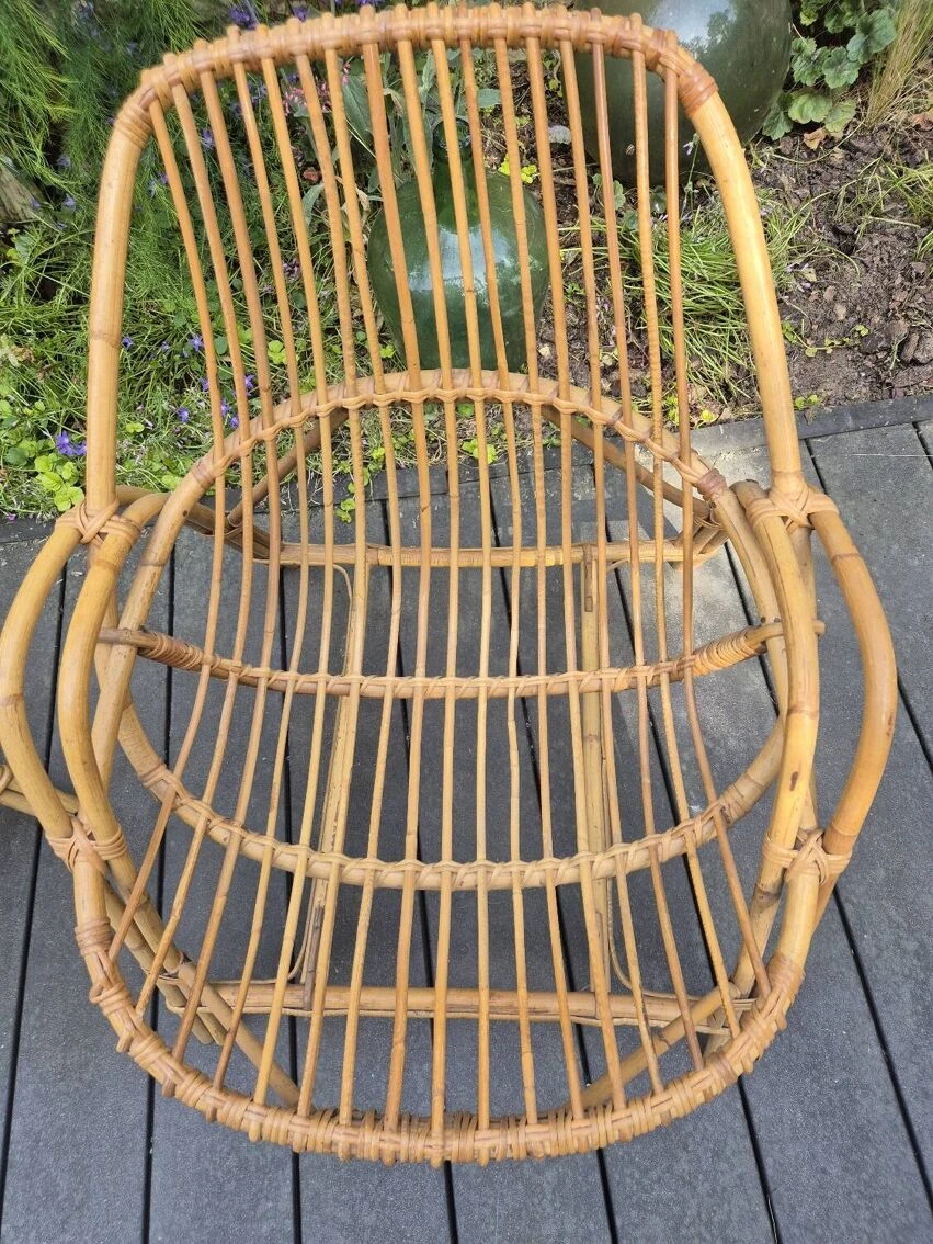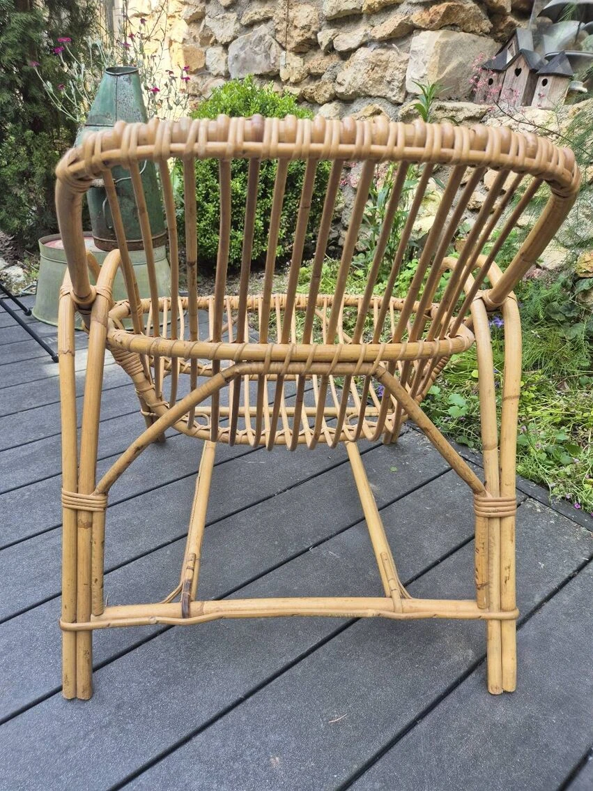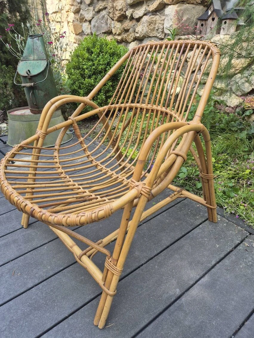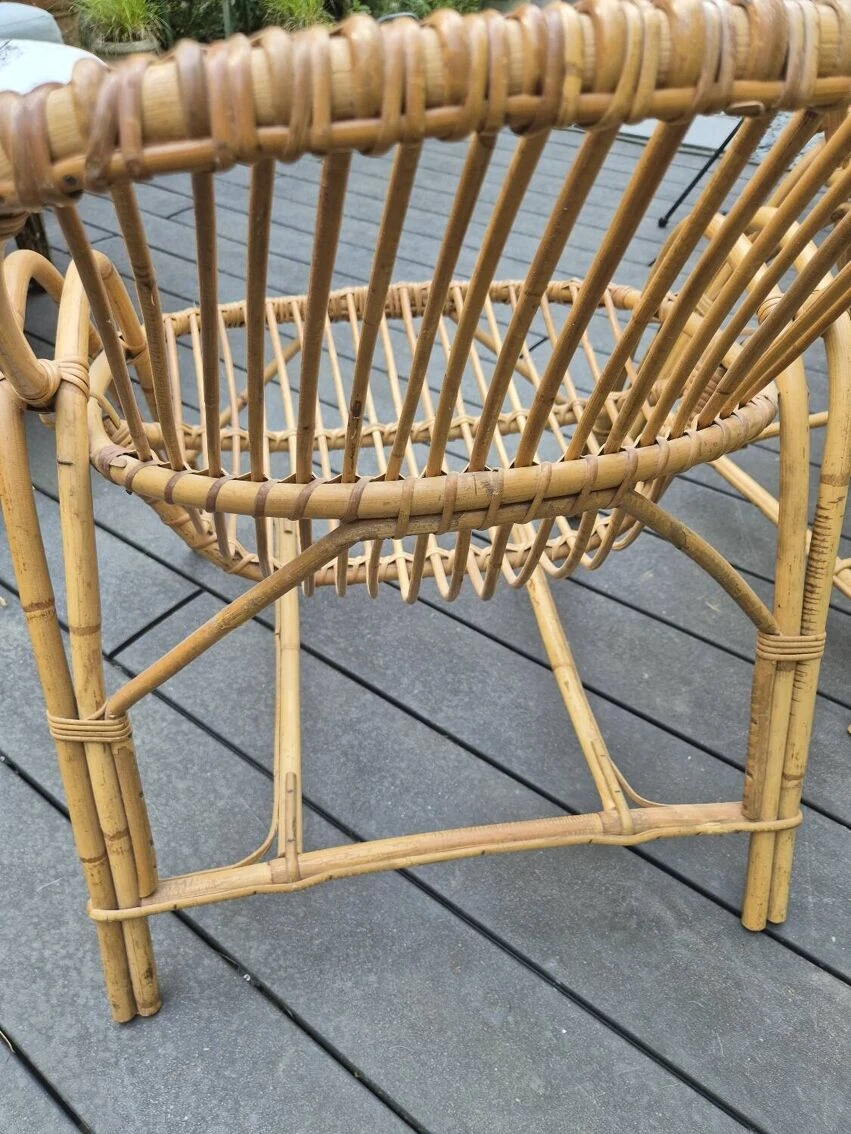 Out for the photo, today I offer you these two vintage rattan armchairs, in perfect condition. The seat height is 35 cm. Each measures 70 cm in height by 60 in width and 70 in depth. Very stable and comfortable, no shortages.