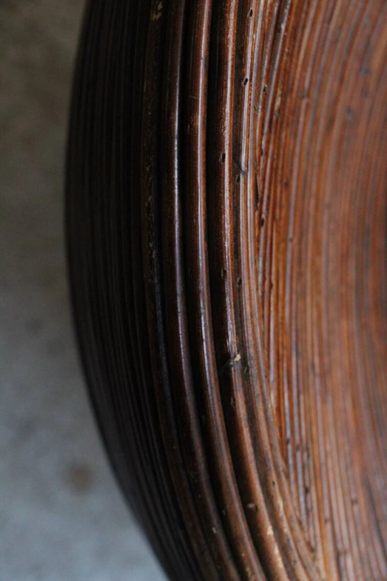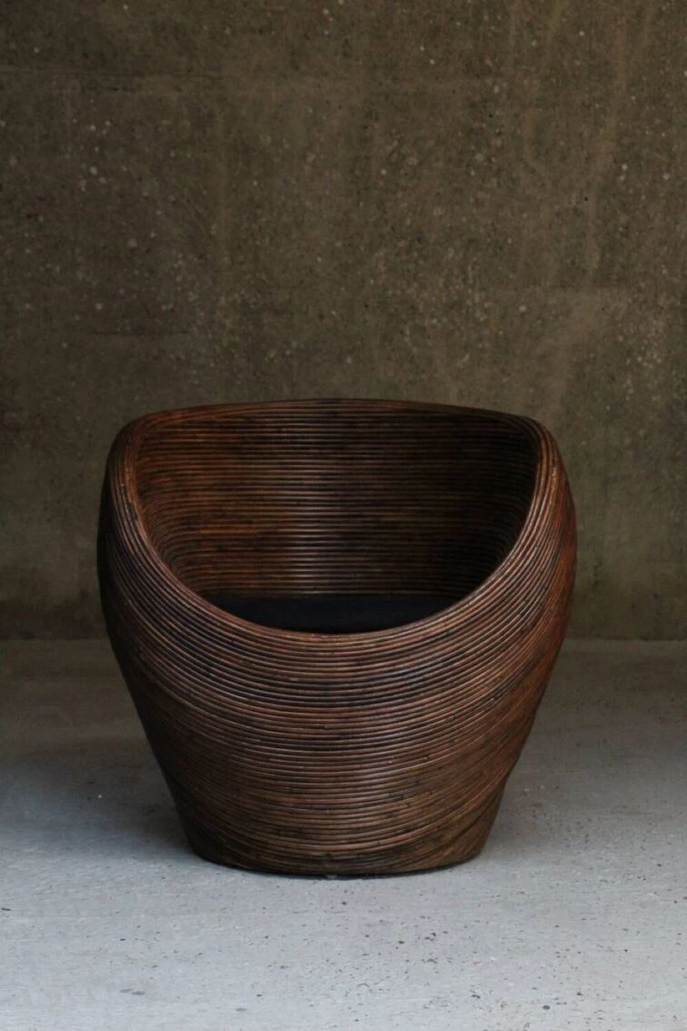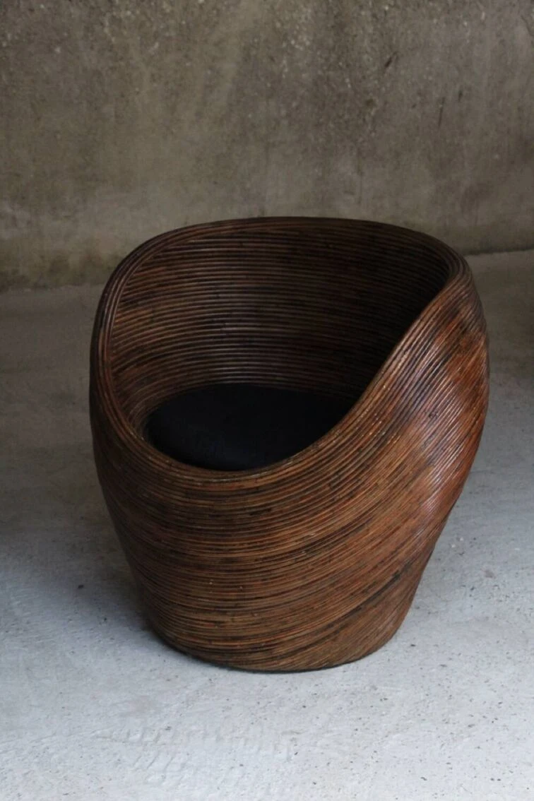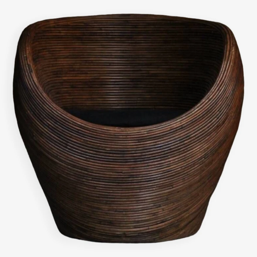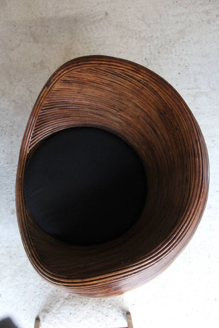 Sculptural egg armchair in bamboo and rattan. This edition dates from the end of the 20th century. Original black fabric cushion. Very good period condition. Dimensions: h70 l88 p65.