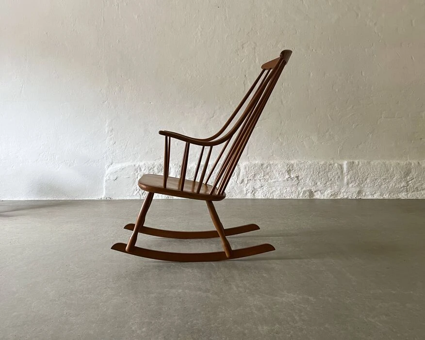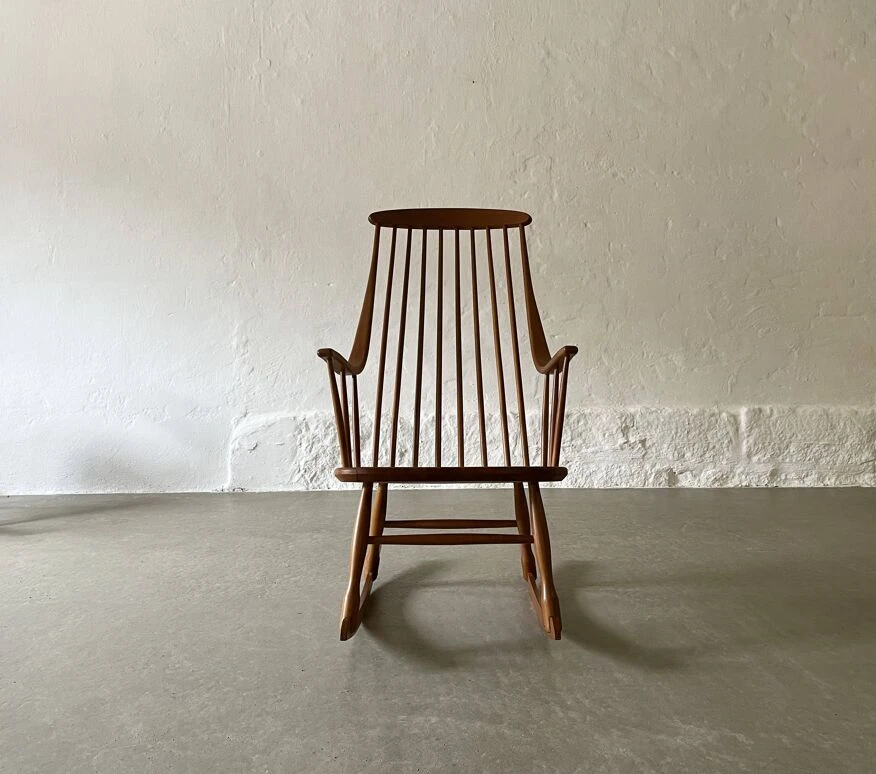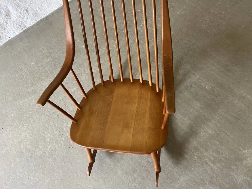 This Grandessa rocking chair was designed by Lena Larsson for the Swedish Nesto manufacture during the 1960s. The armchair is made of beech wood. The high backrest seamlessly transforms into the armrests. The structure is designed to ensure harmonious rocking.