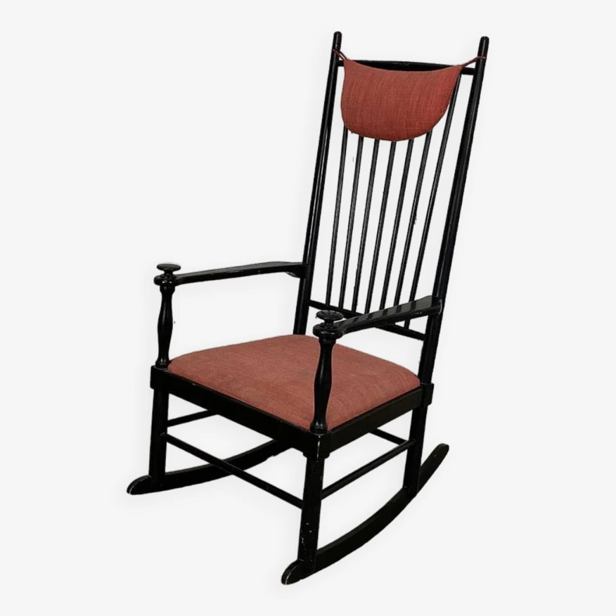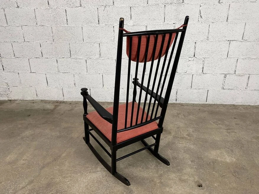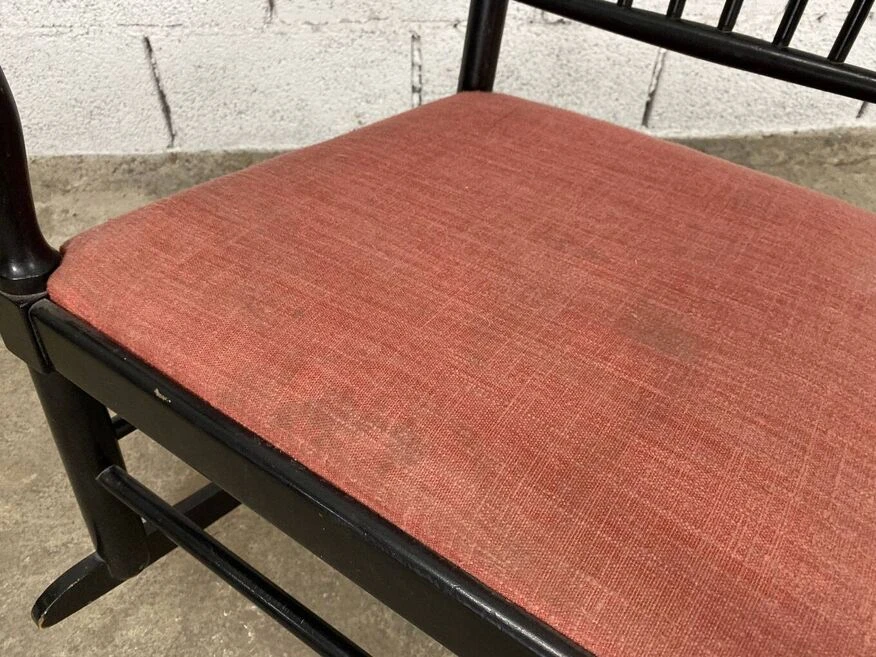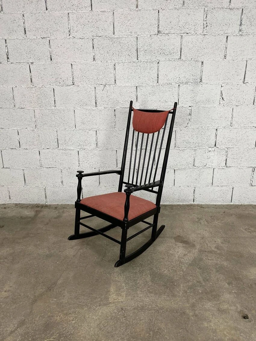 Lacquered wooden structure with original black patina, seat and headrest cushion also original, which show some signs of wear visible in the photos.