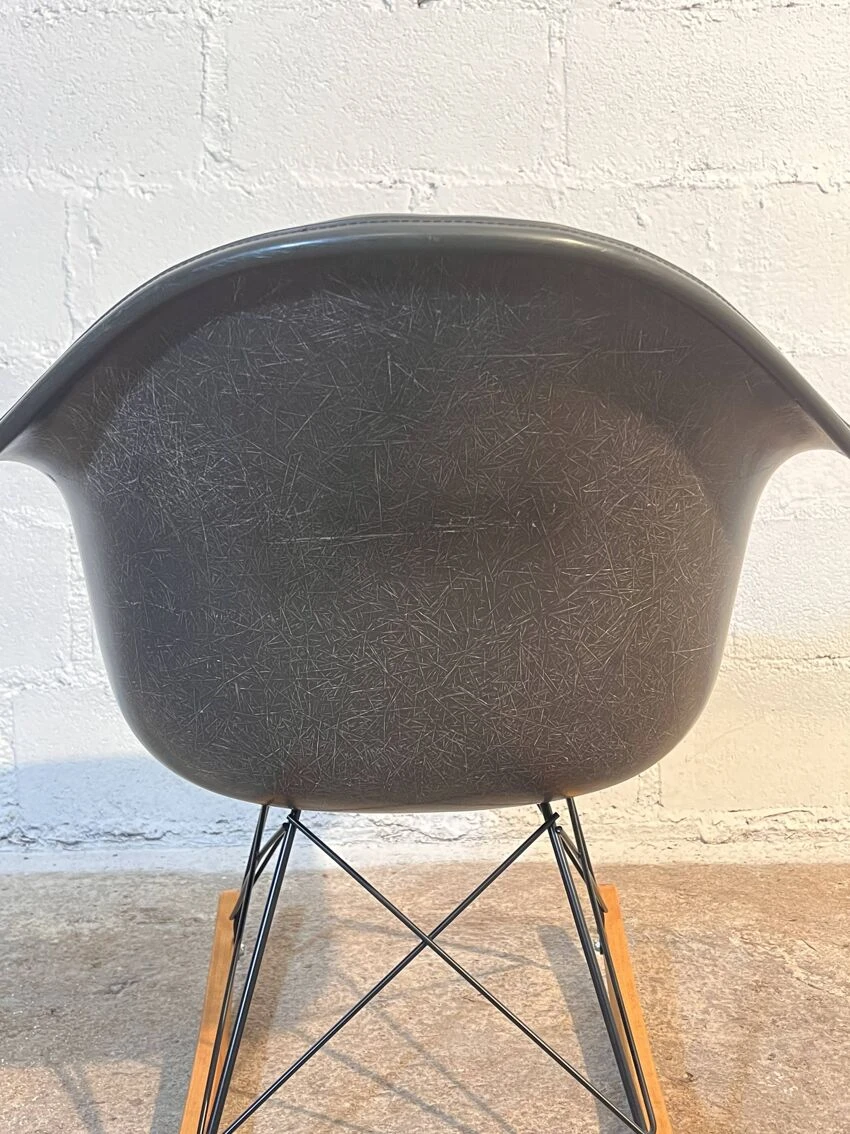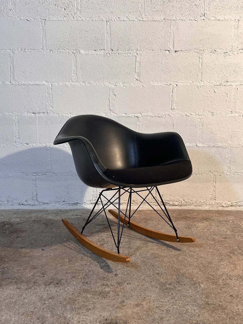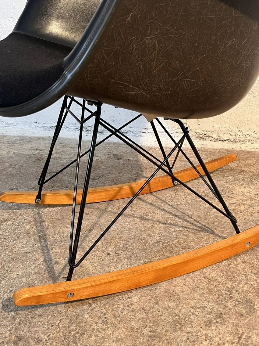 Magnificent “RAR” rocking chair by Charles and Ray Eames for Herman Miller, 1950s. Today it is a real design icon in the same place as the famous lounge chair, recognized both for its aesthetic and functional aspect. Designed and produced just after “La Chaise” (1948). Since it could not be mass-produced at the time for economic reasons, the couple retained their initial ideas. Fully padded black tinted fiberglass shell with leather covering, metal rod base and birch glides. Rare fiberglass configuration with leather covering. not found on the market. label under the seat which suggests that the chair was produced between 1957 and 1989. Very good condition, it remains a vintage product and may show signs of use. A pair may be available.