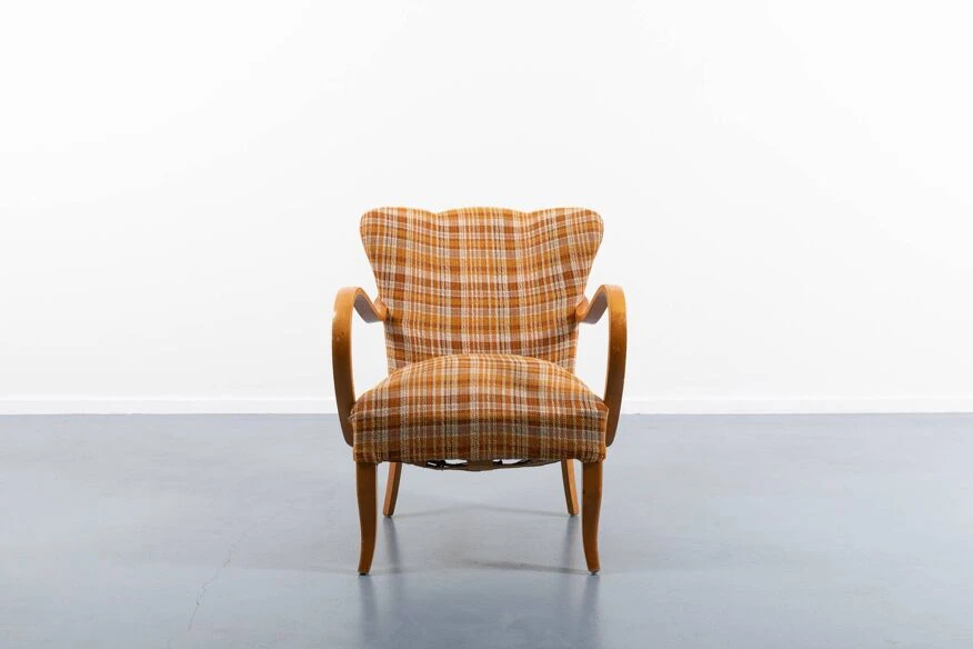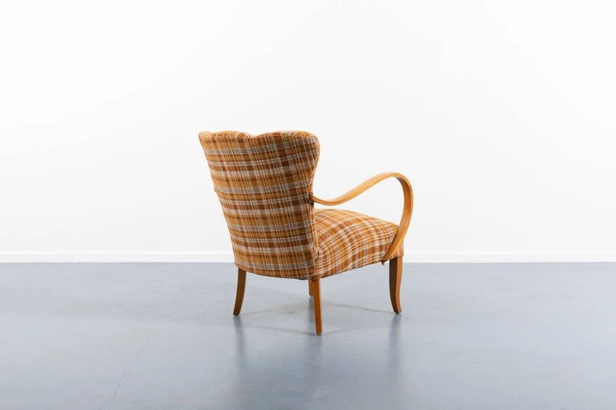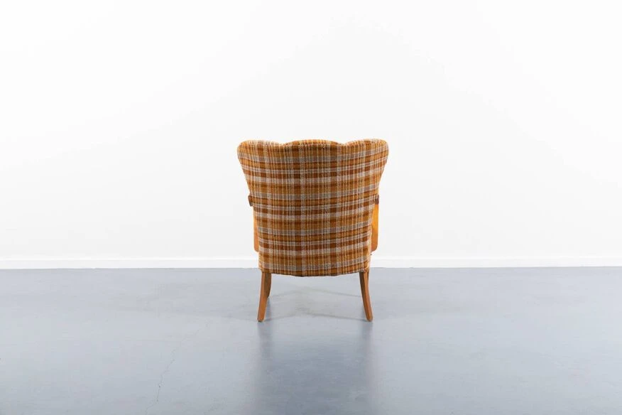 Frame in varnished birch, upholstered in original striped brown fabric.